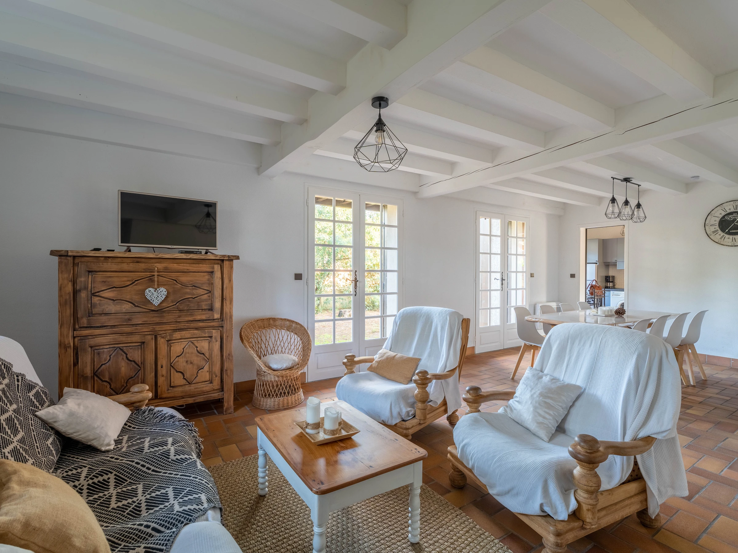 La maison offre une grande pièce de vie conviviale avec coin TV (pas de WIFI, possibilité de louer un boîtier – cheminée non utilisable), ainsi qu’une cuisine indépendante entièrement neuve et parfaitement équipée (électroménager neuf 2026) : four, plaque induction, grand réfrigérateur-congélateur, et lave-vaisselle.