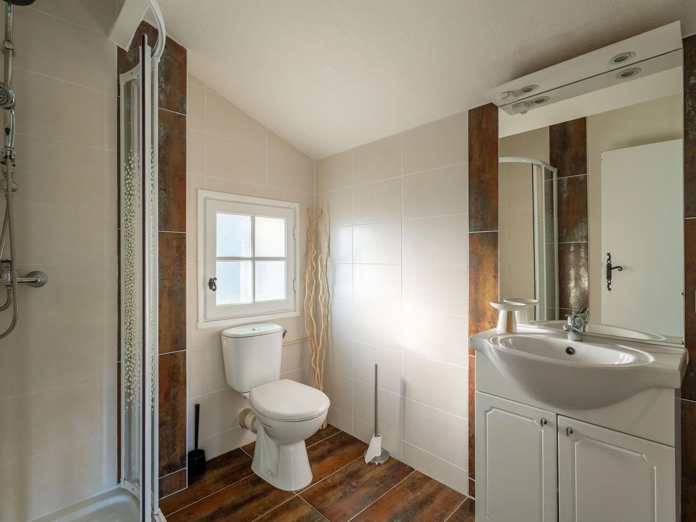 Au rez-de-chaussée, vous trouverez deux chambres avec placards (dont une rénovée en 2026), équipées de lits doubles (140 cm et 160 cm), une salle de bain et des WC séparés pour plus de confort.