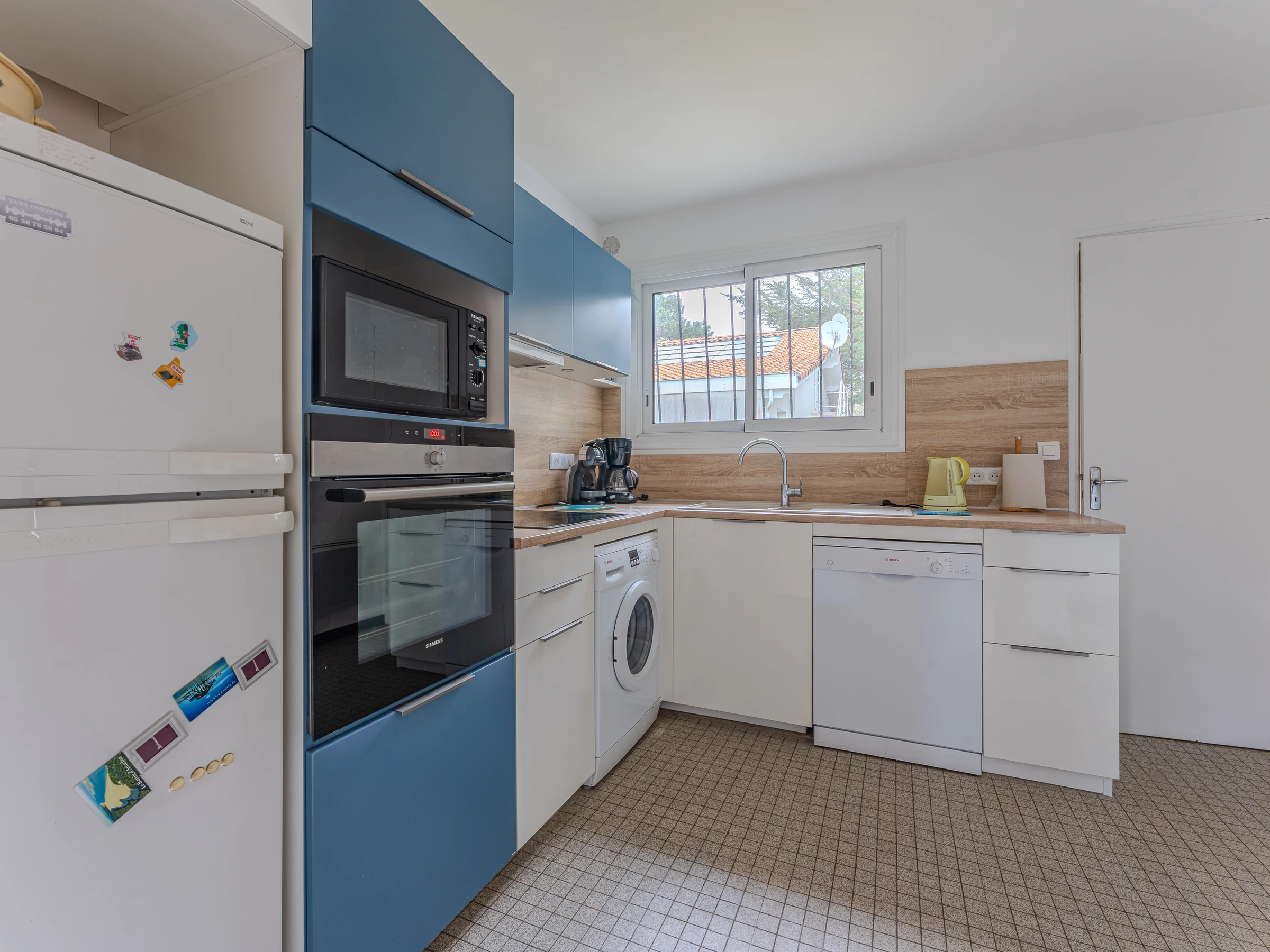 Séjour avec TV et canapé, cuisine équipée de plaques 4 feux, hotte, micro-onde, four, réfrigérateur/congélateur, cafetière, bouilloire, grille-pain, lave-linge.
