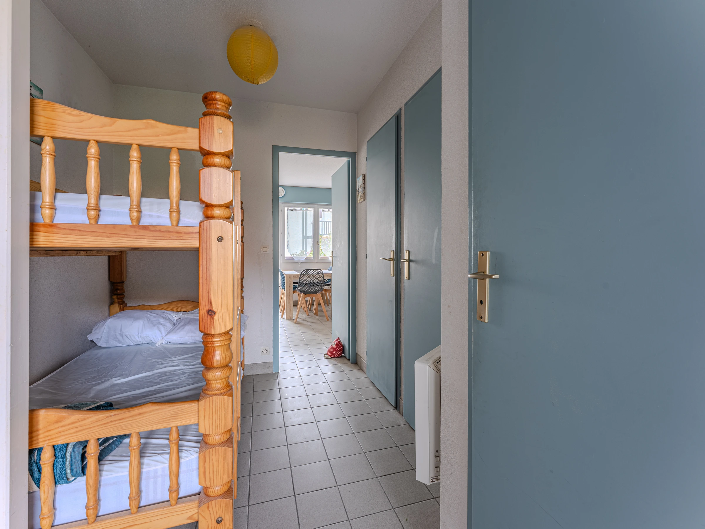 Une chambre avec un lit double en 140, et dans l’alcôve de l’entrée deux lits simples superposés de 90 cm.