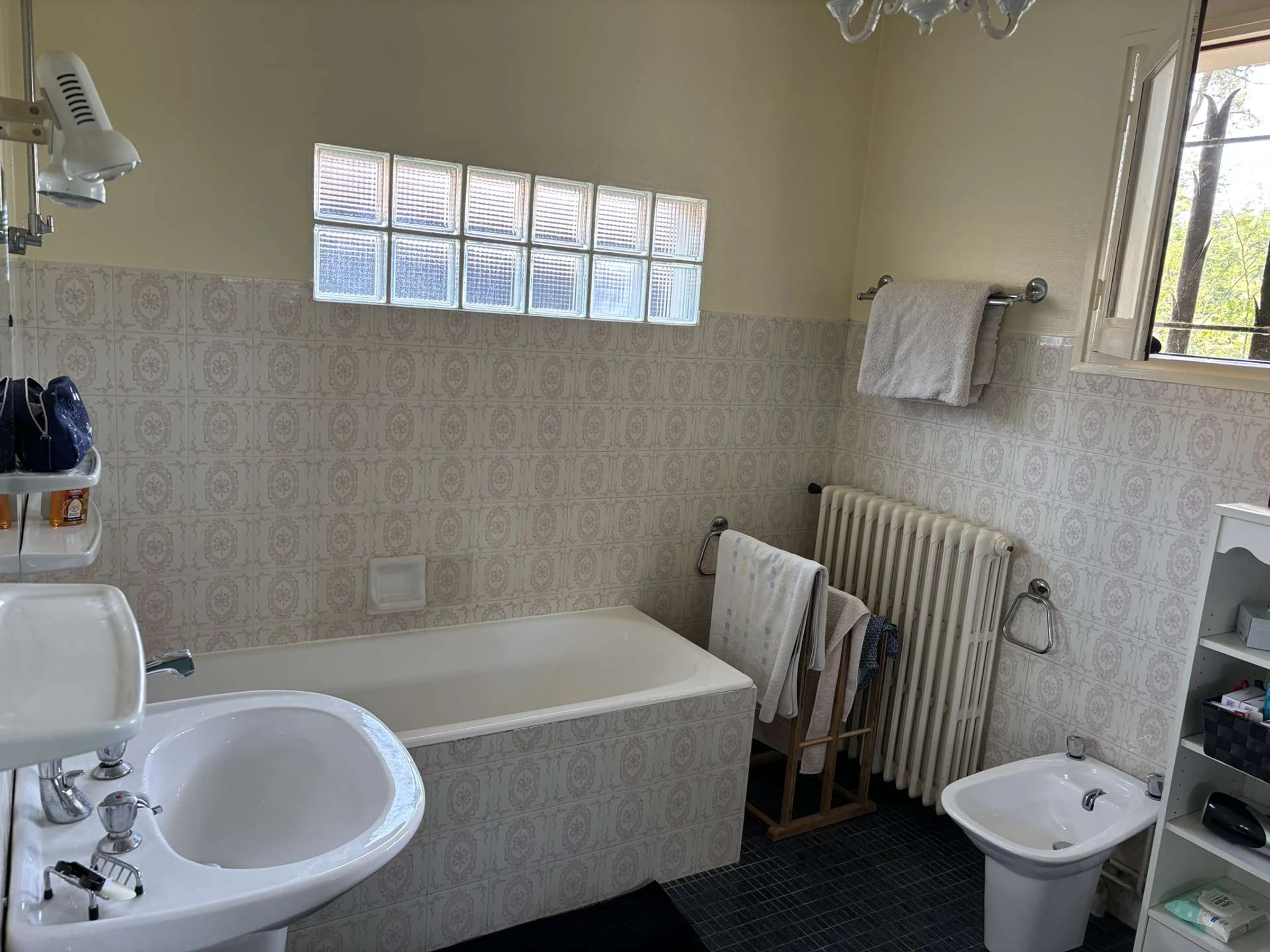 Vous trouverez également une salle de bains avec bidet, des WC séparés, ainsi qu’une buanderie fonctionnelle équipée d’un lave-linge et d’un sèche-linge.