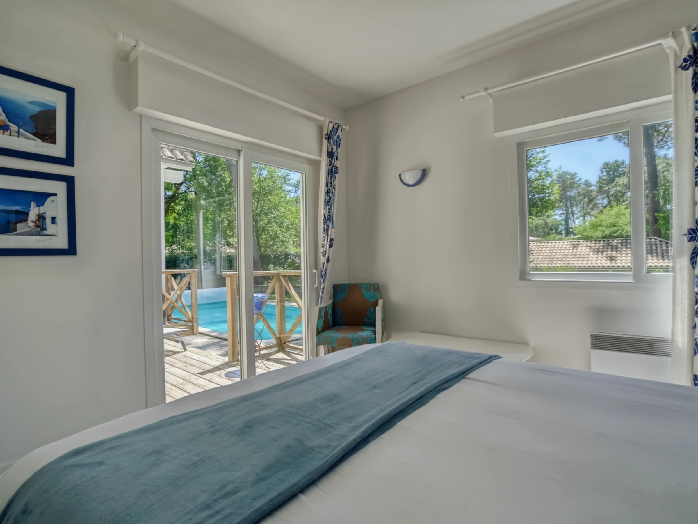 Biscarrosse-lac, Golf, agréable villa avec piscine chauffée de 9m sur 4,50m. Elle est composée d'une entrée, d'un séjour avec TV et accès sur la terrasse. Une cuisine équipée de plaques de cuisson, four, micro-onde, réfrigérateur, congélateur, lave vaisselle, cafetière, bouilloire, grille-pain. Un cellier avec lave linge et sèche linge. Une chambre avec un lit double, une chambre avec 2 lits simples, une suite parentale avec salle d'eau attenante et accès terrasse. Salle de bain et WC indépendant. Décoration contemporaine, jardin clos et paysager, parking. Wifi.