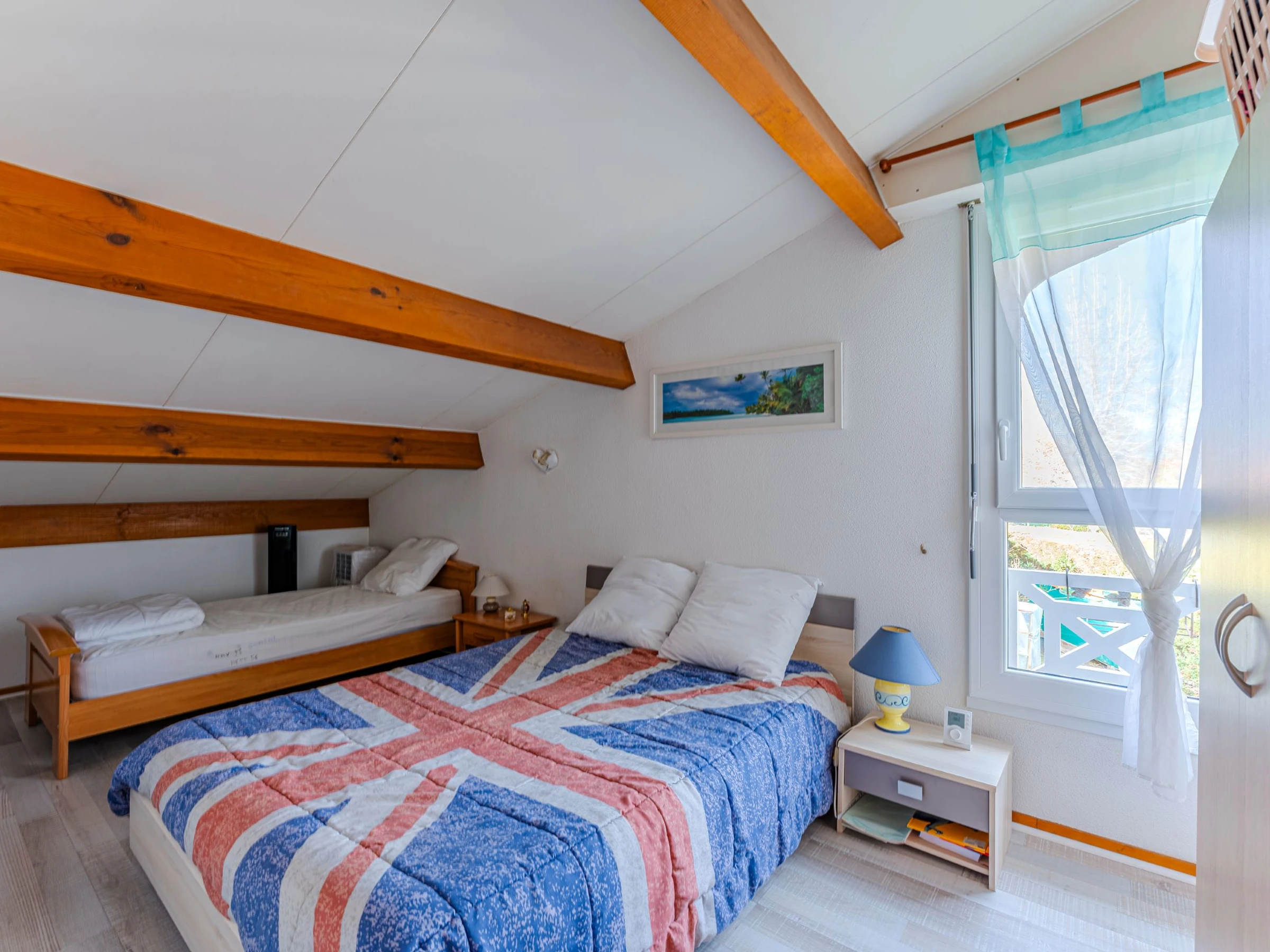 D’une superficie de 55m2, avec séjour donnant sur la terrasse, cuisine ouverte avec hotte, plaque vitrocéramique, cafetière, lave-vaisselle, lave-linge, micro-onde/four multifonction, réfrigérateur6congélateur, bouilloire, grille-pain. Salle d’eau/WC. A l’étage une chambre avec un lit double (140), un lit simple (80) et armoire, une deuxième chambre avec un lit double (140) et armoire. Mobilier de jardin et barbecue.