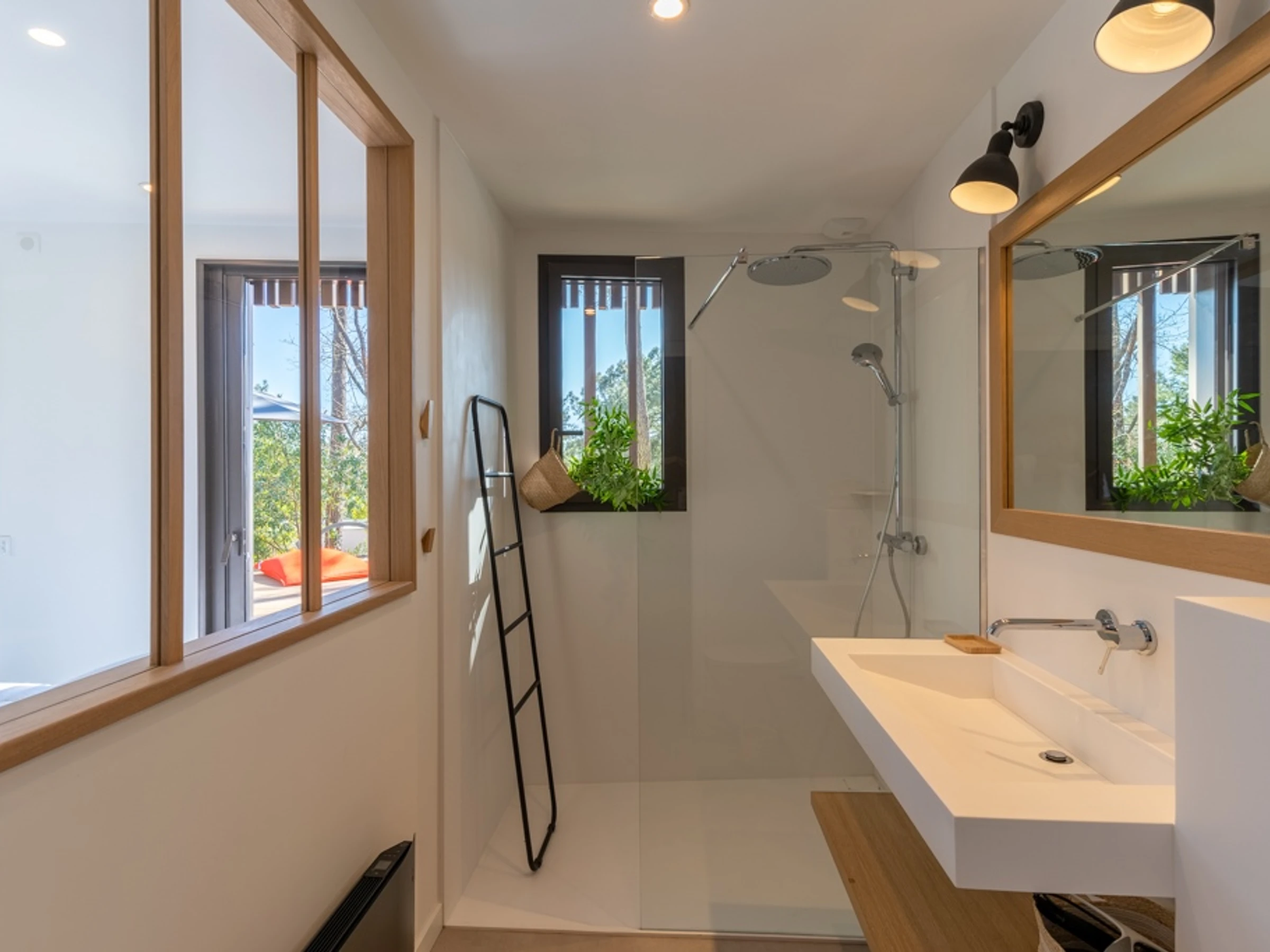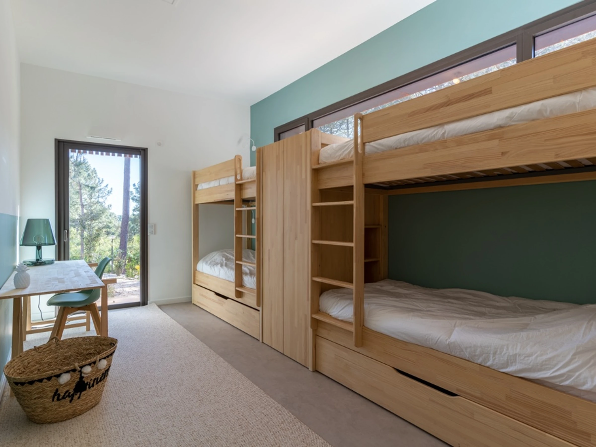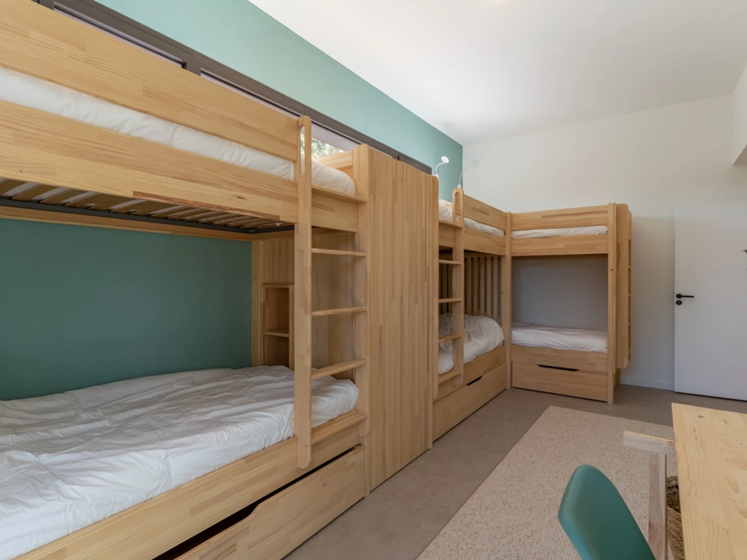 Coté couchage se distingue quatre chambres avec rangements et lits 160 dont une suite parentale avec douche à l'italienne ainsi qu'un dortoir pouvant accueillir six couchages en 90. Trois salles d'eau (comprenant la salle d'eau parentale) avec double vasques dont une avec baignoire offrent un confort optimal.