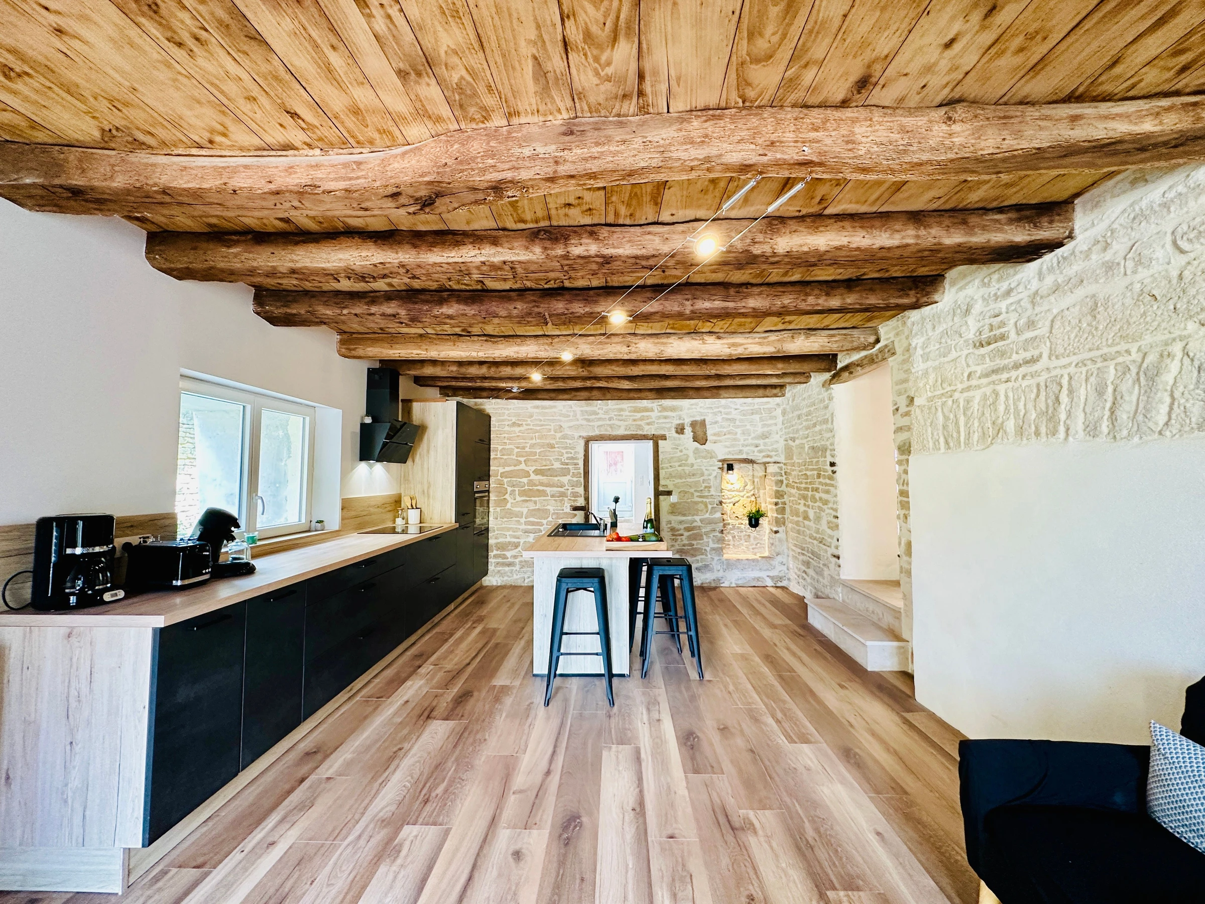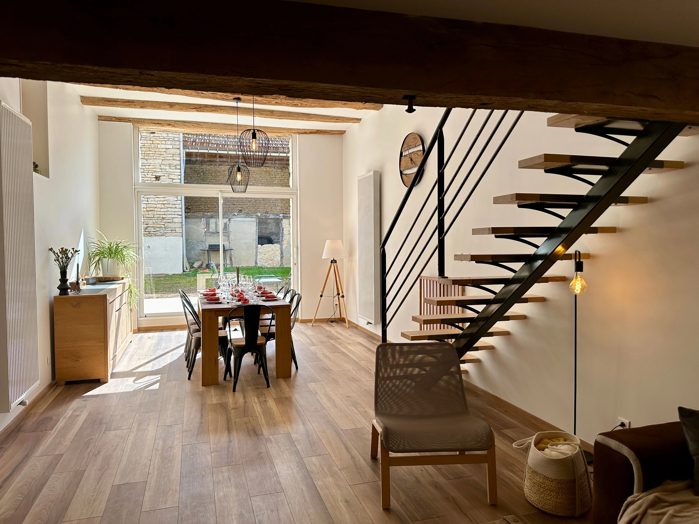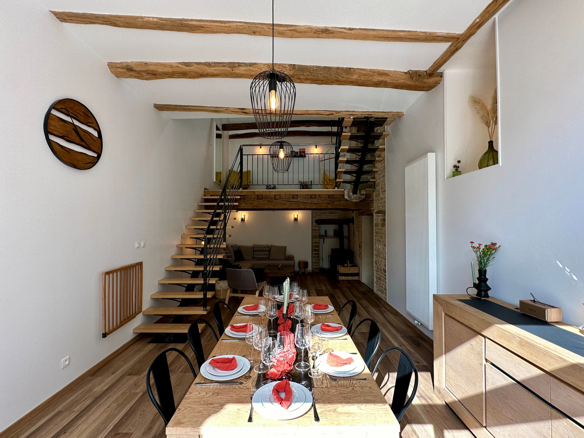 On accède par quelques marches, à la magnifique pièce de vie très lumineuse de par sa baie vitrée offrant un accès direct sur la terrasse / jardin entièrement clos (mobilier de jardin et barbecue). Espace repas et coin salon avec poêle à bois (bois fournis). Poutres et pierres apparentes sont à l’honneur.