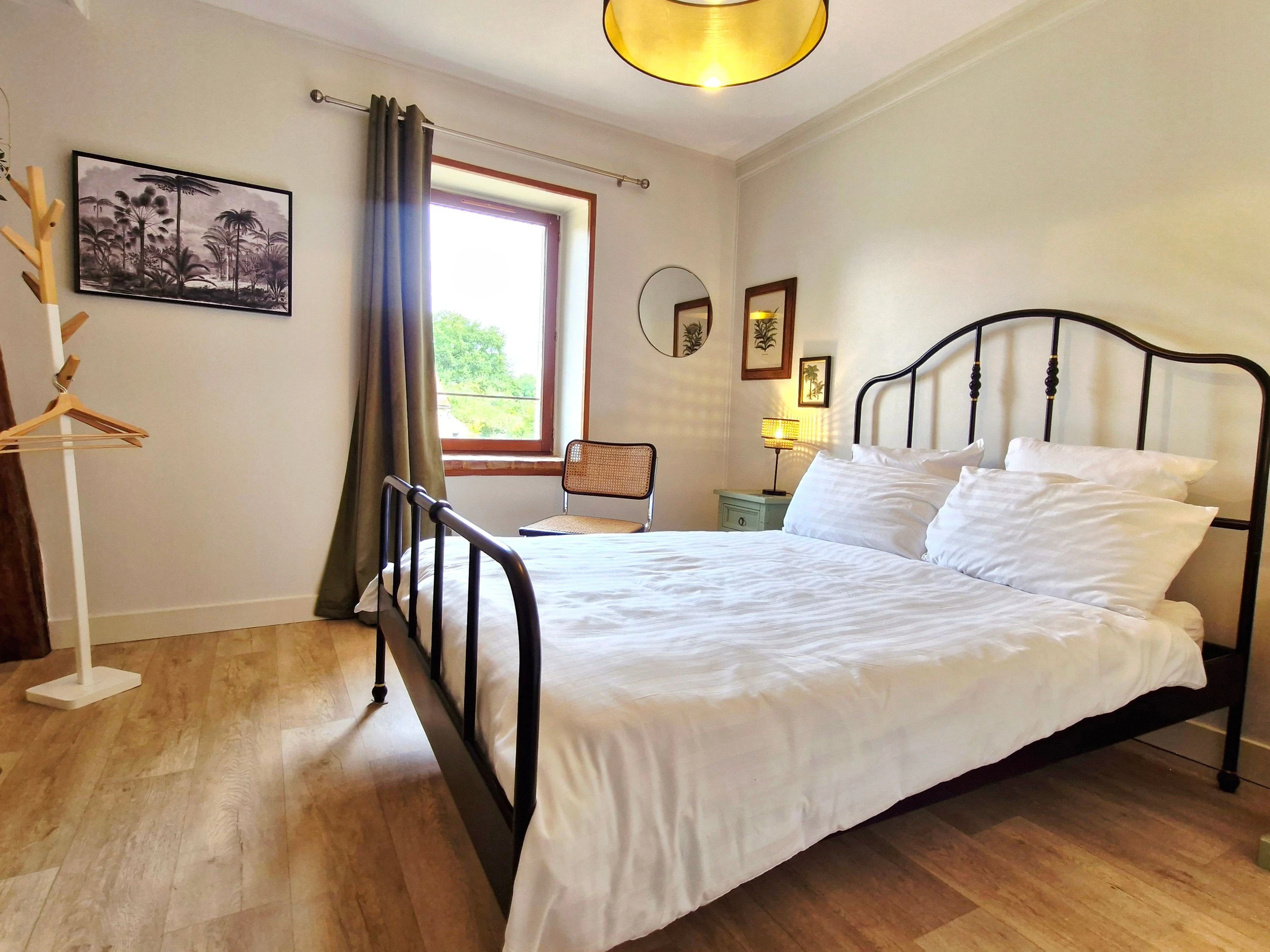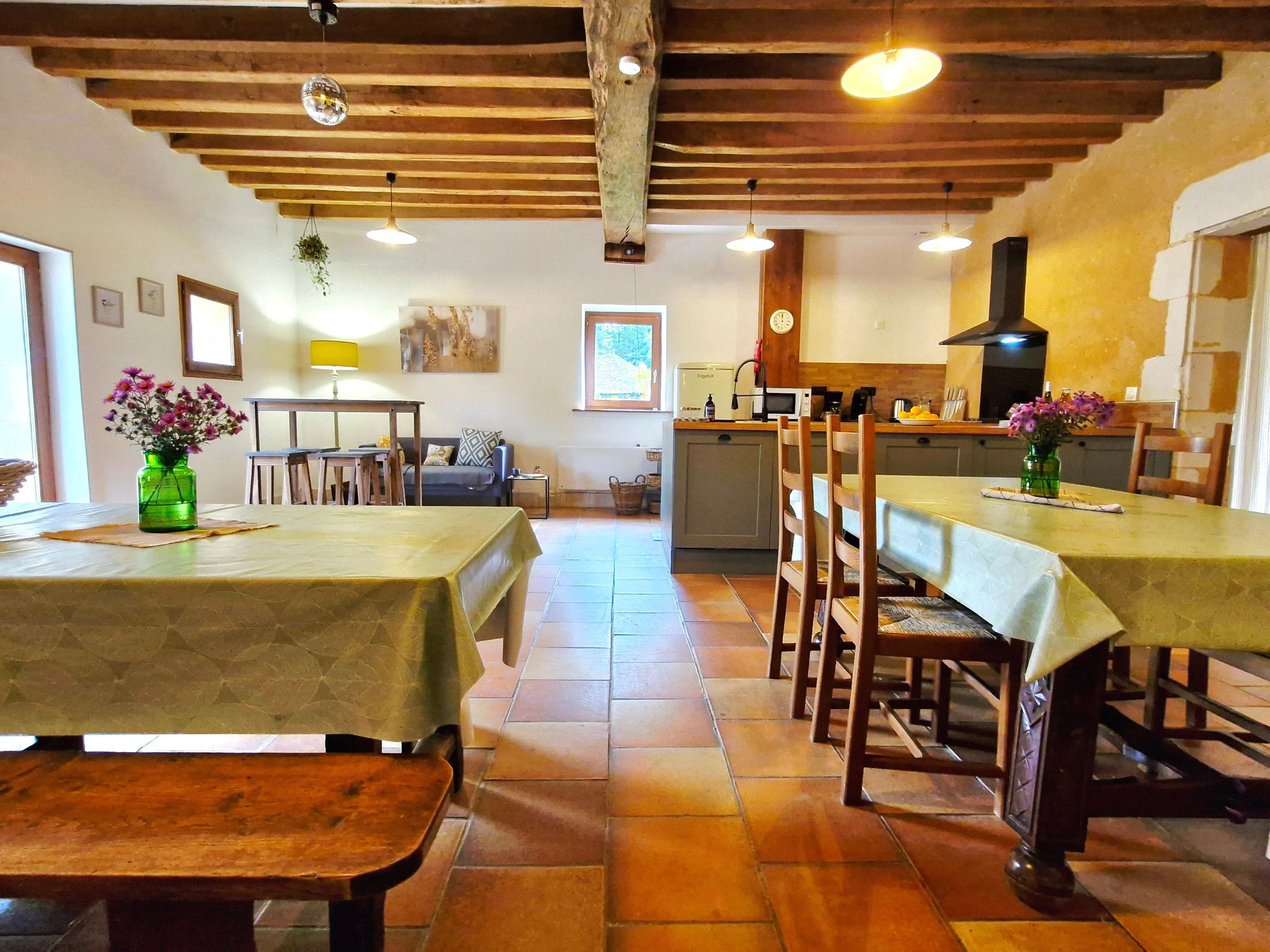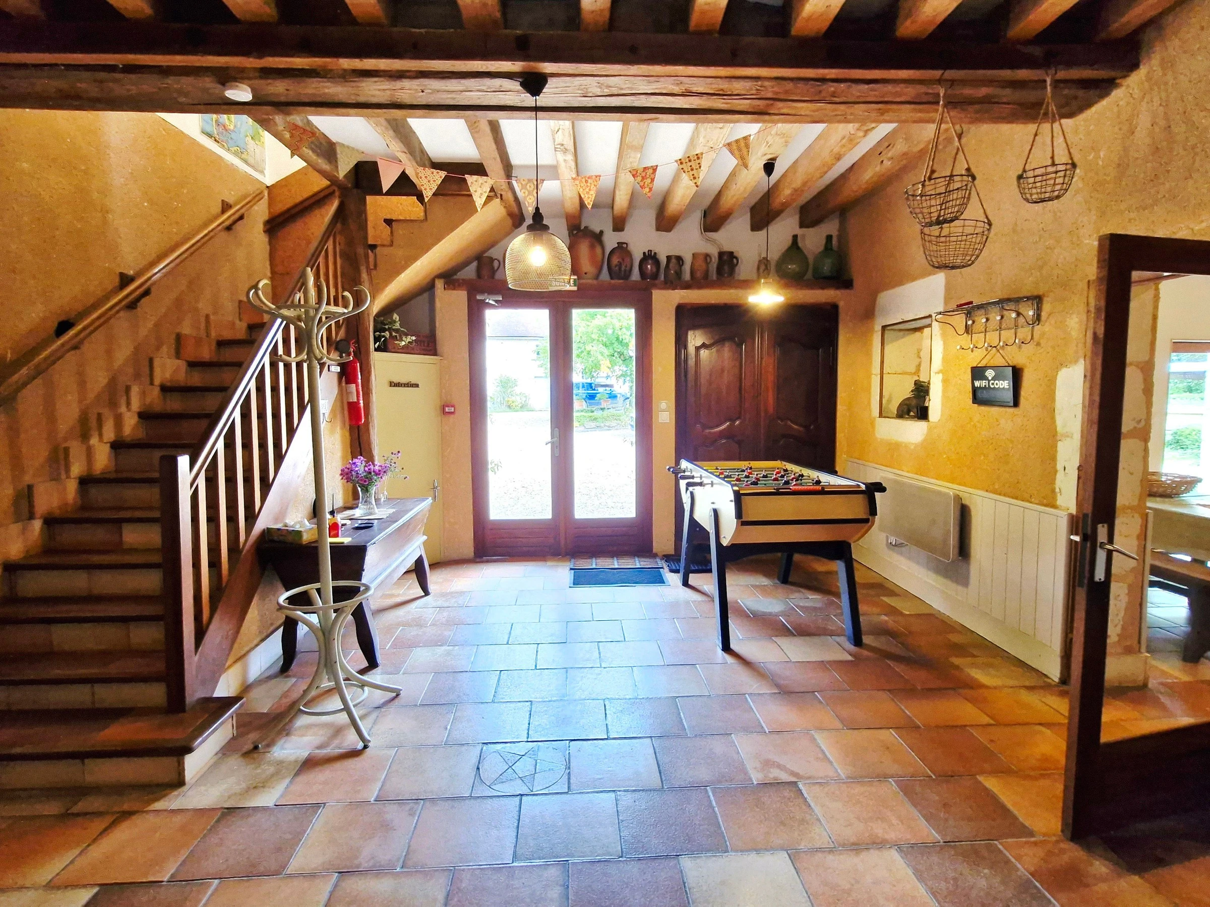 Au rez-de-chaussée, le gîte propose une grande pièce conviviale réunissant cuisine et salle à manger, idéale pour préparer les repas tout en échangeant avec les convives autour d’une grande tablée. Un salon séparé avec canapés et télévision invite à la détente, que ce soit pour lire ou regarder un film. L’entrée est aménagée avec un baby-foot, parfait pour des moments ludiques, et un WC complète cet étage. À l’étage, cinq chambres disposent chacune de leur propre salle d’eau avec douche et WC, tandis que deux autres chambres (en enfilade) partagent la salle de bains/wc. 4 chambres équipées chacune d'un lit 140x190; 2 chambres équipées de 2 lits 90x190 chacune et une chambre avec un lit 160x200. À l’extérieur, vous profiterez d’un jardin ouvert avec terrasse, espace détente et terrain de pétanque, ainsi que d’un barbecue pour vos repas estivaux. Chevaux sur place (clôture électrique). Le gîte dispose également d’un parking privé, d’une connexion Wi-Fi et met à disposition jeux de société et ouvrages locaux.