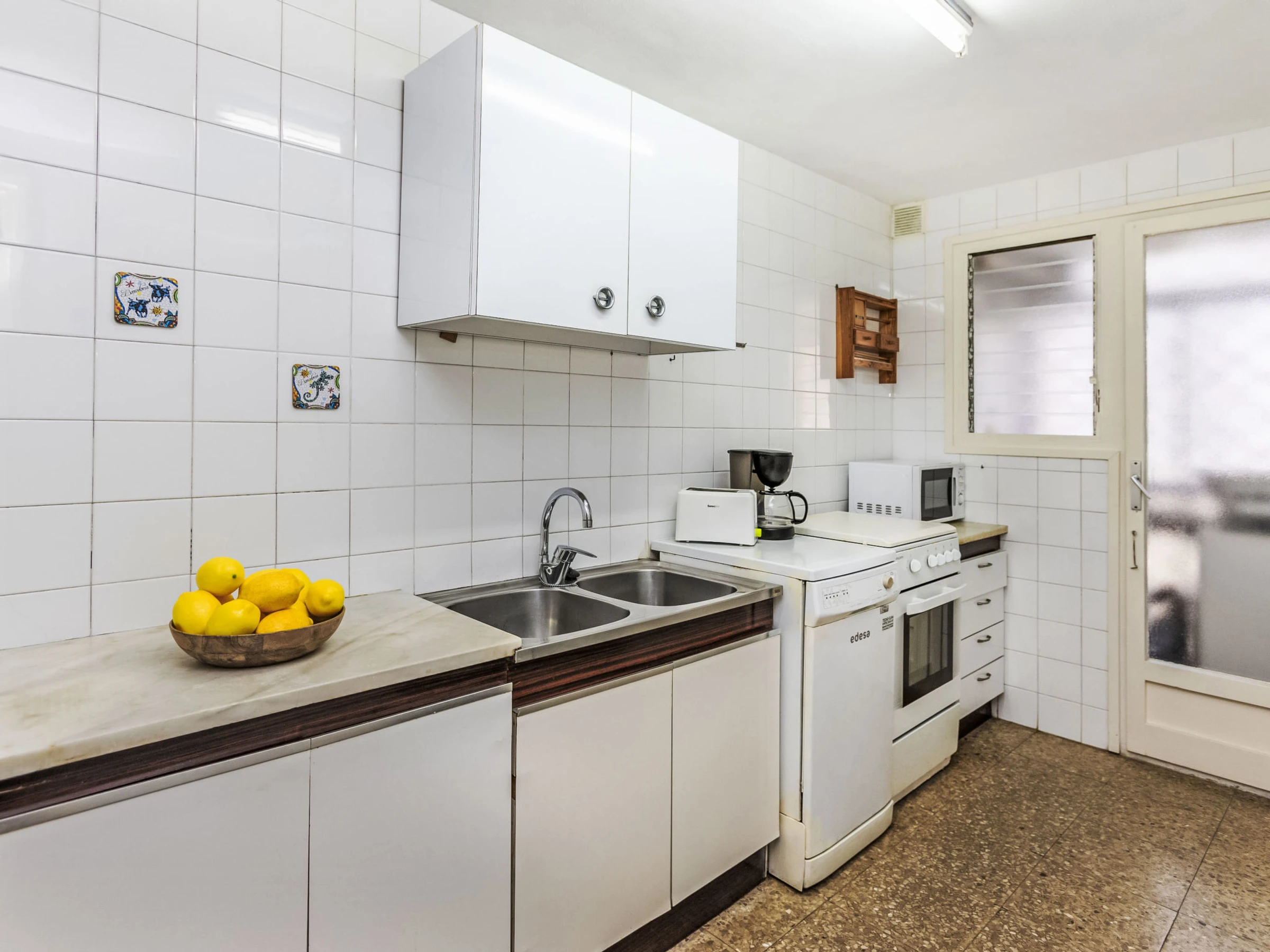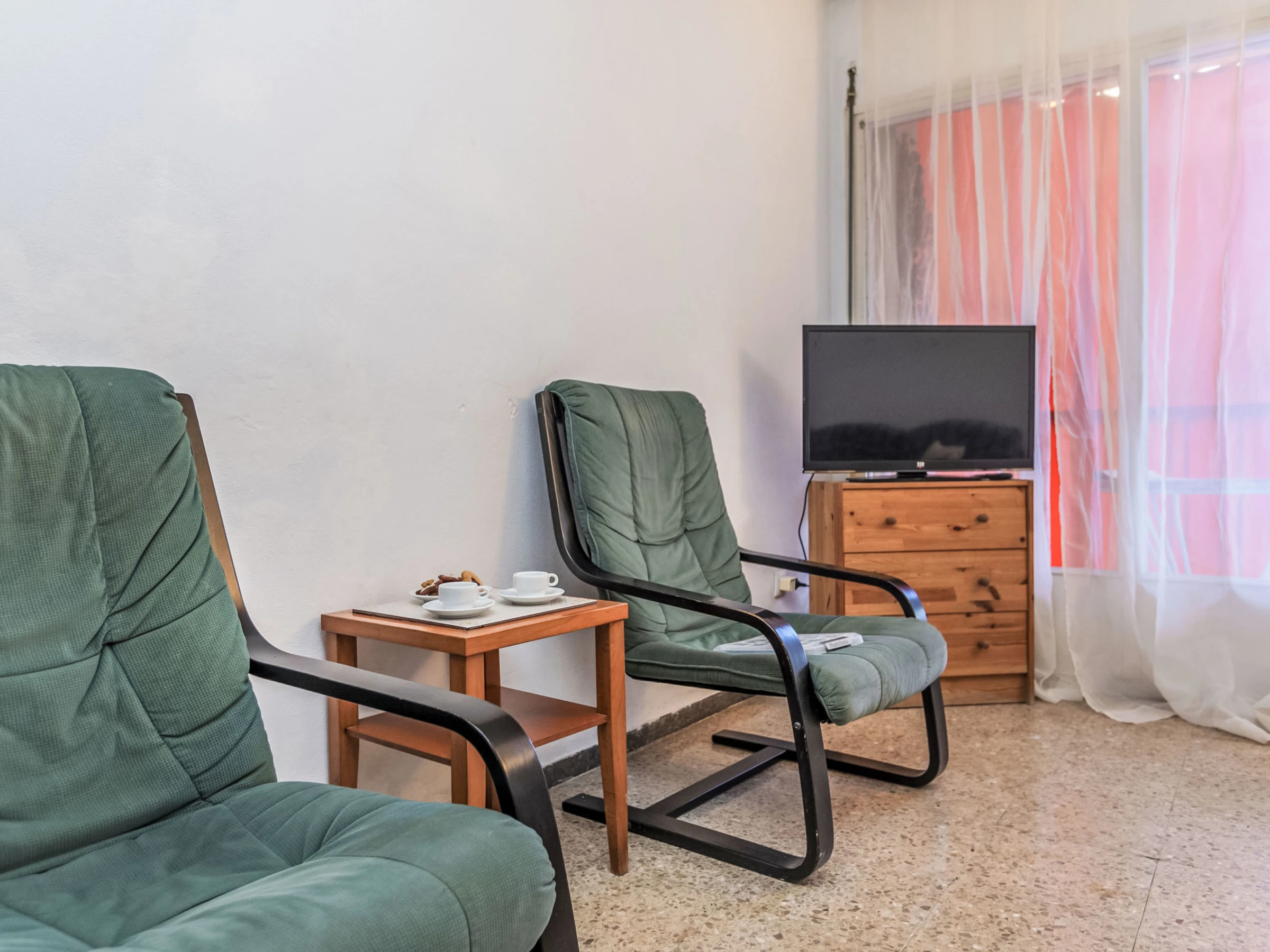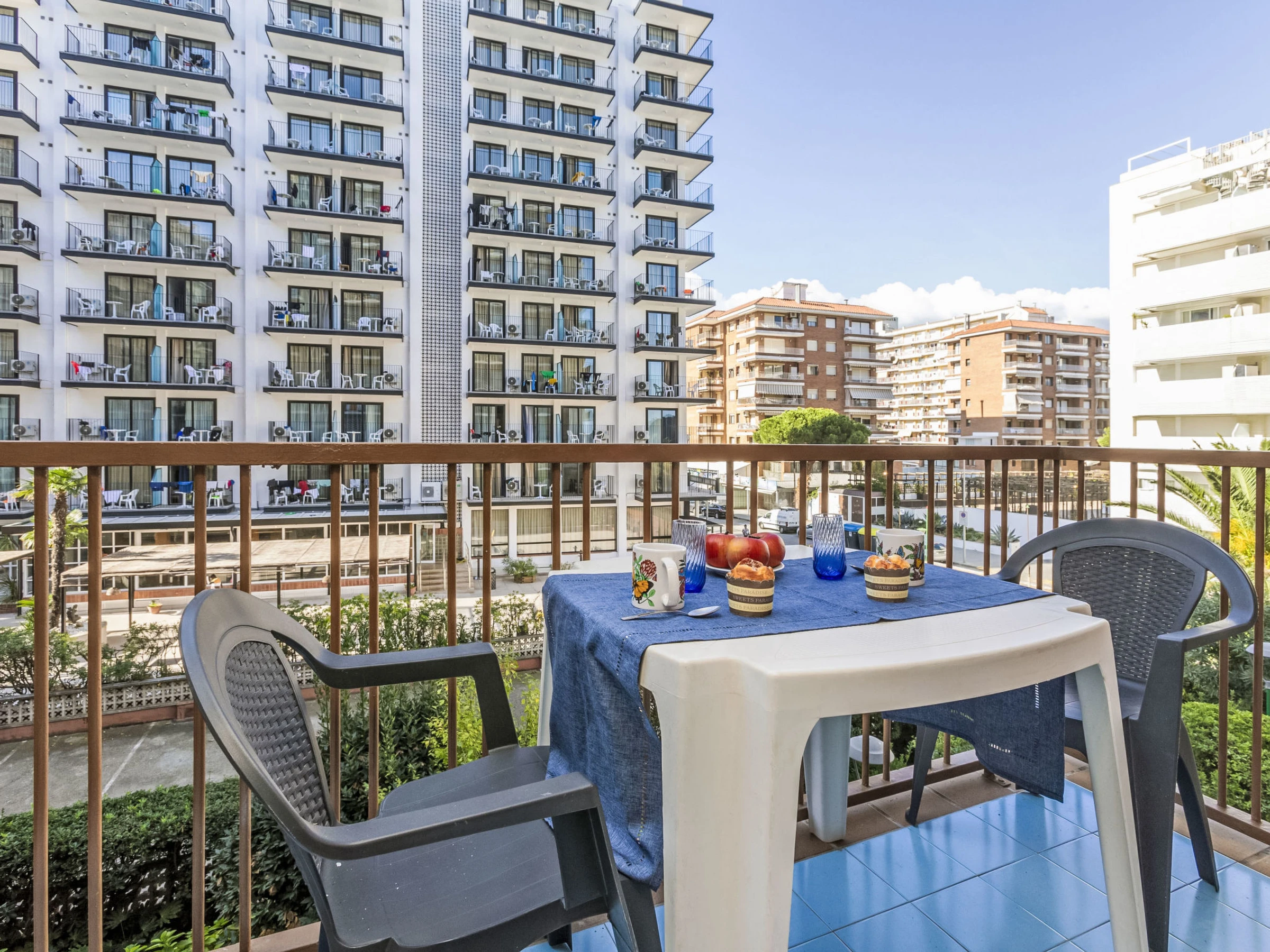 "Palmeras", apt 2 pièces 70 m2 au 2ème étage. Aménagement simple et fonctionnel: séjour/salle à manger avec table pour les repas et Télévision numérique. Sortie sur le balcon. 1 chambre double avec 1 grand-lit (150 cm, longueur 190 cm). Sortie sur le balcon. 1 chambre avec 2 x 2 lits superposés (90 cm, longueur 190 cm). Cuisine (4 plaques de cuisson, four, grille-pain, bouilloire électrique, congélateur, cafetière électrique). Bain/WC. Pas de chauffage. Mobilier de balcon. Vue sur la mer, la piscine et le jardin. A disposition: lave-linge, fer à repasser, chaise haute pour enfant, lit bébé jusqu'à 2 ans, sèche-cheveux. Internet (Connexion WIFI, gratuit). Veuillez noter: maximum 1 animal/ chien autorisé. TV seulement ES. [hidden] // Reg. Nr.: ESFCTU00001702800006469300000000000000000[hidden]7