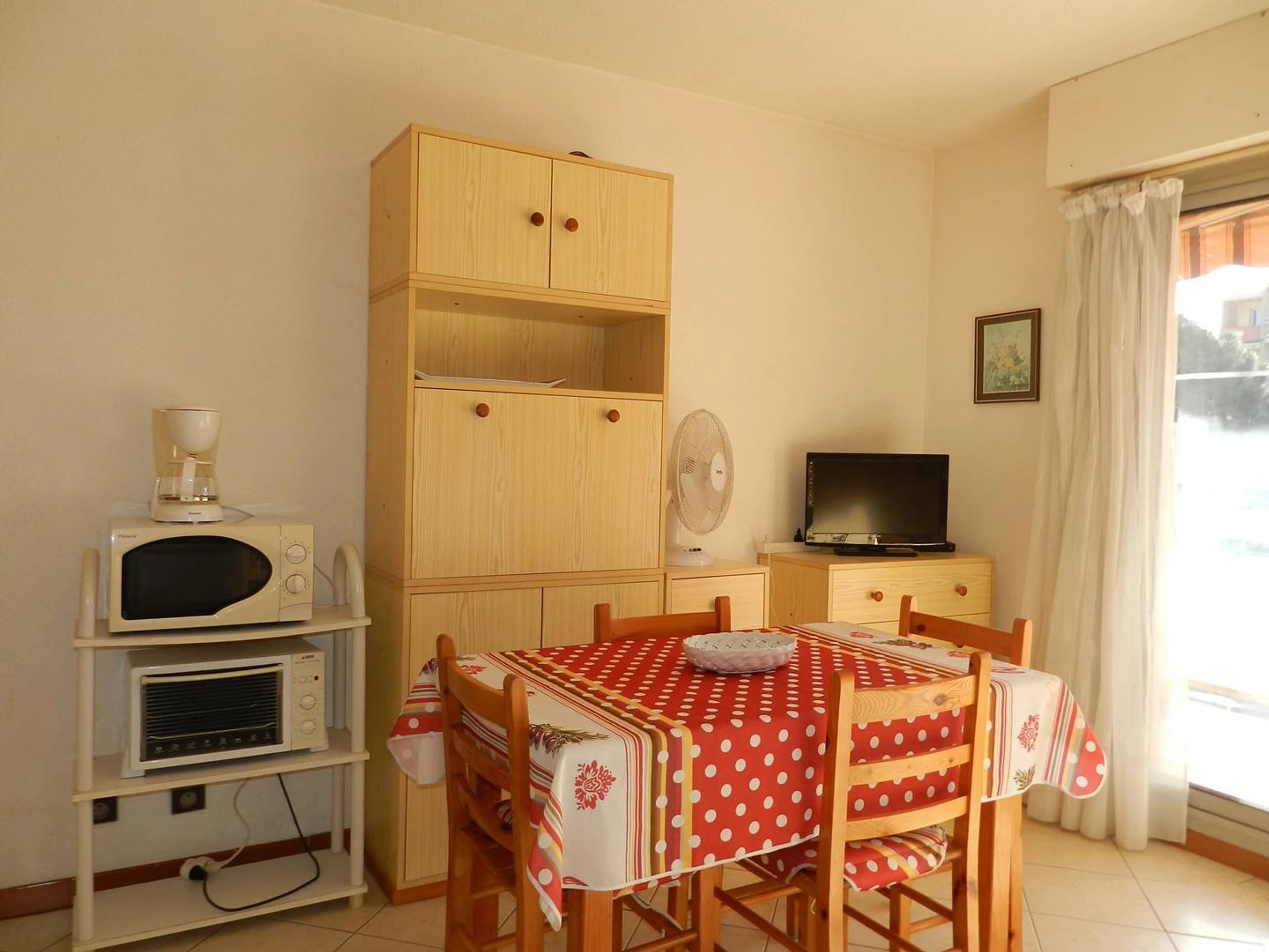 Cette location de vacances au 1er étage de la résidence vous offre une terrasse exposée SUD, avec aperçu mer donnant sur le séjour avec canapé convertible, une cuisine équipée, une entrée avec un lit superposé, une salle de bain avec wc.