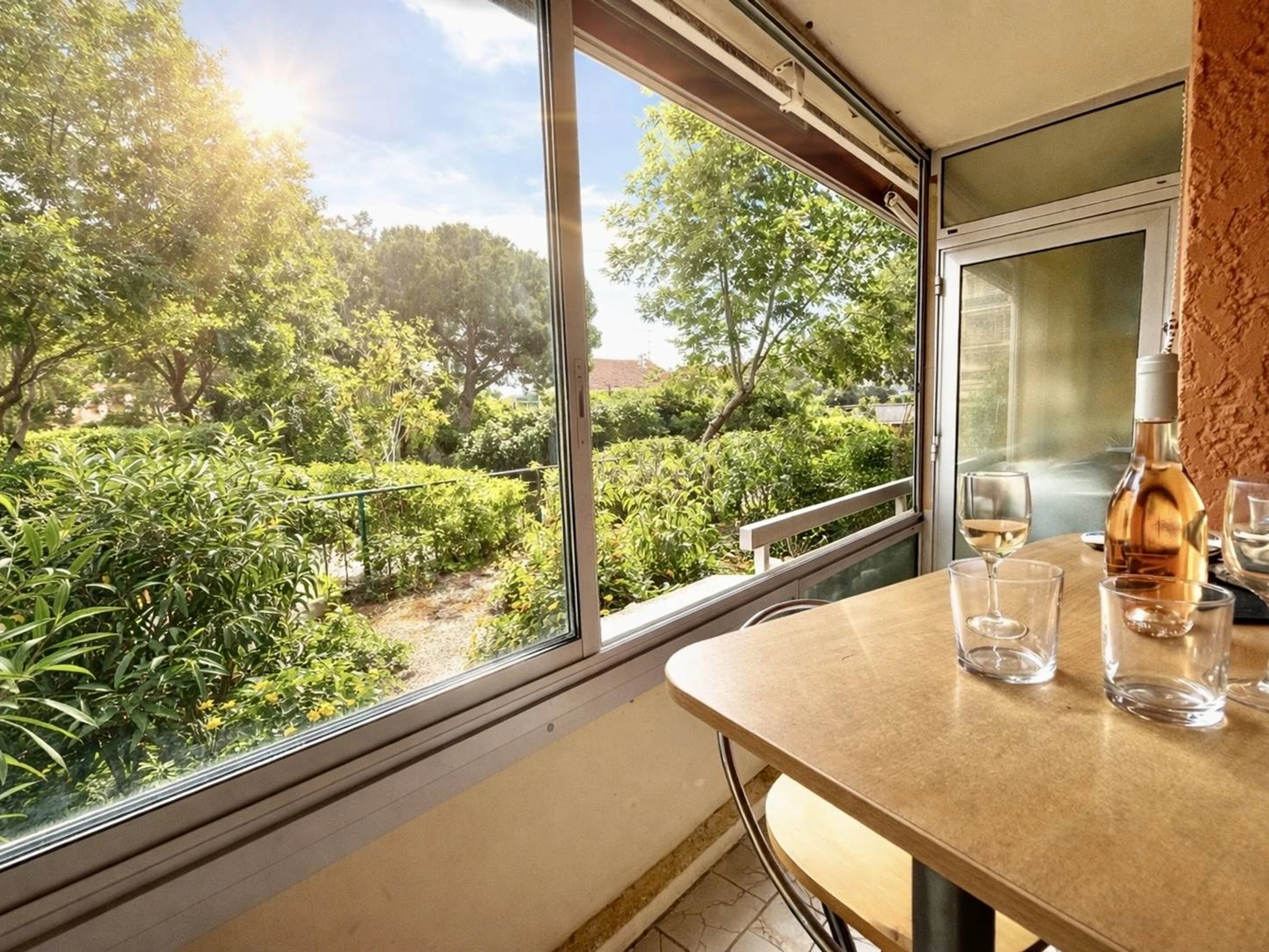 L’œil du professionnel : la véranda qui s'ouvre entièrement sur une jolie vue sur les jardins de la résidence, la verdure, un petit coin de paradis au calme mais non loin de l'effervescence de la vie estivale.