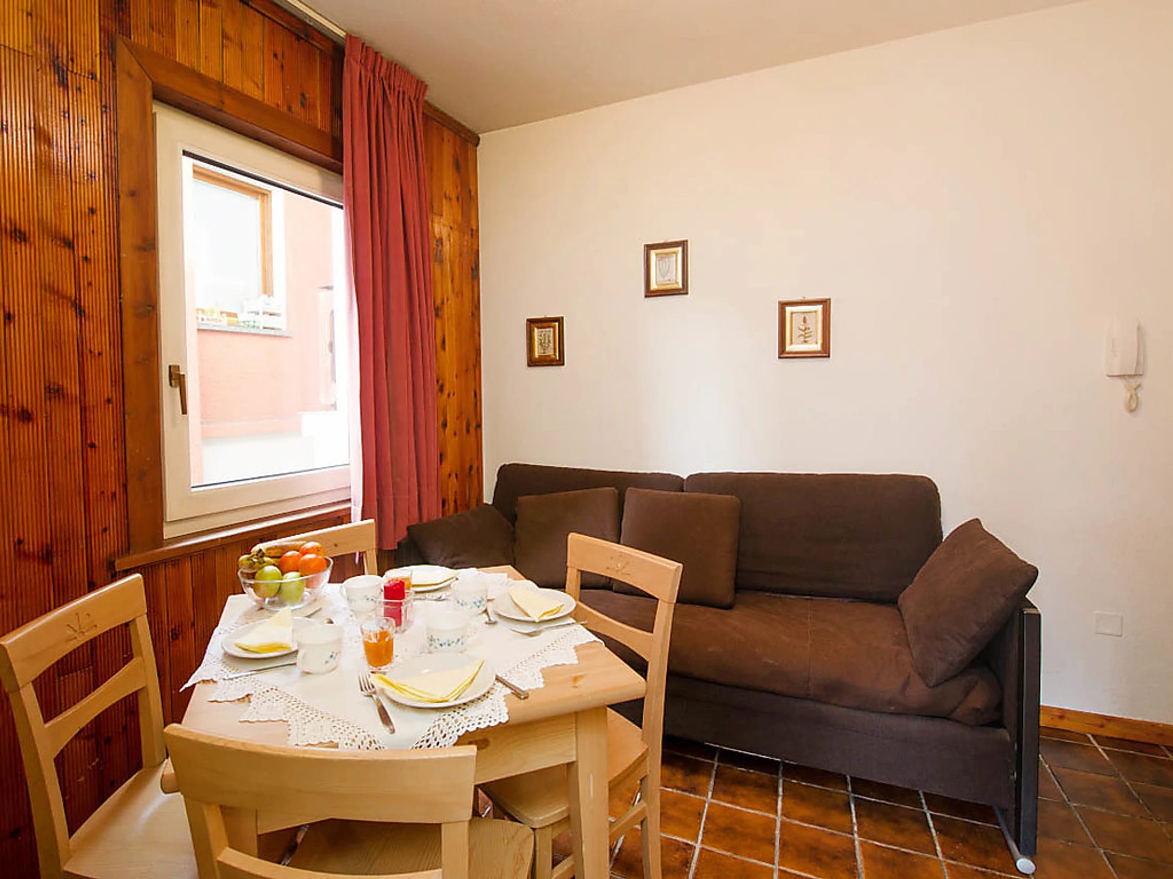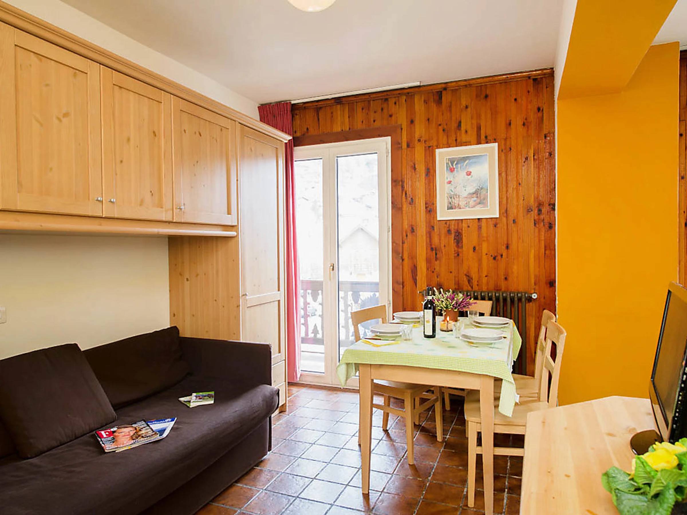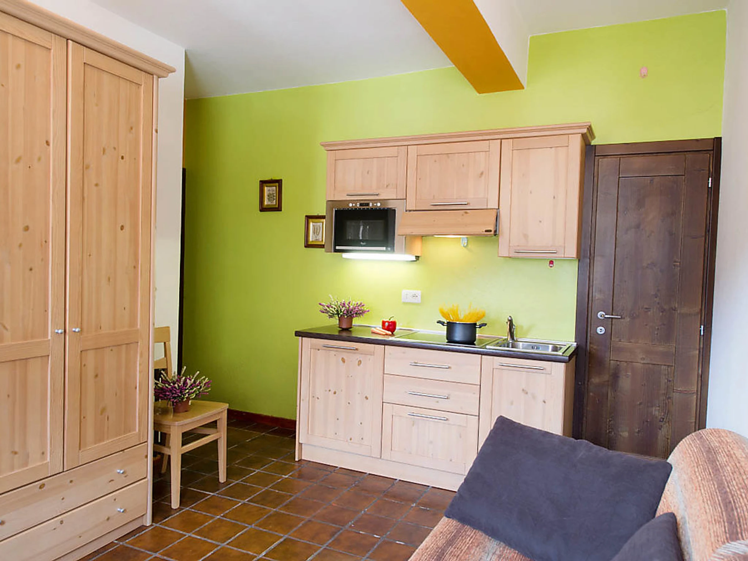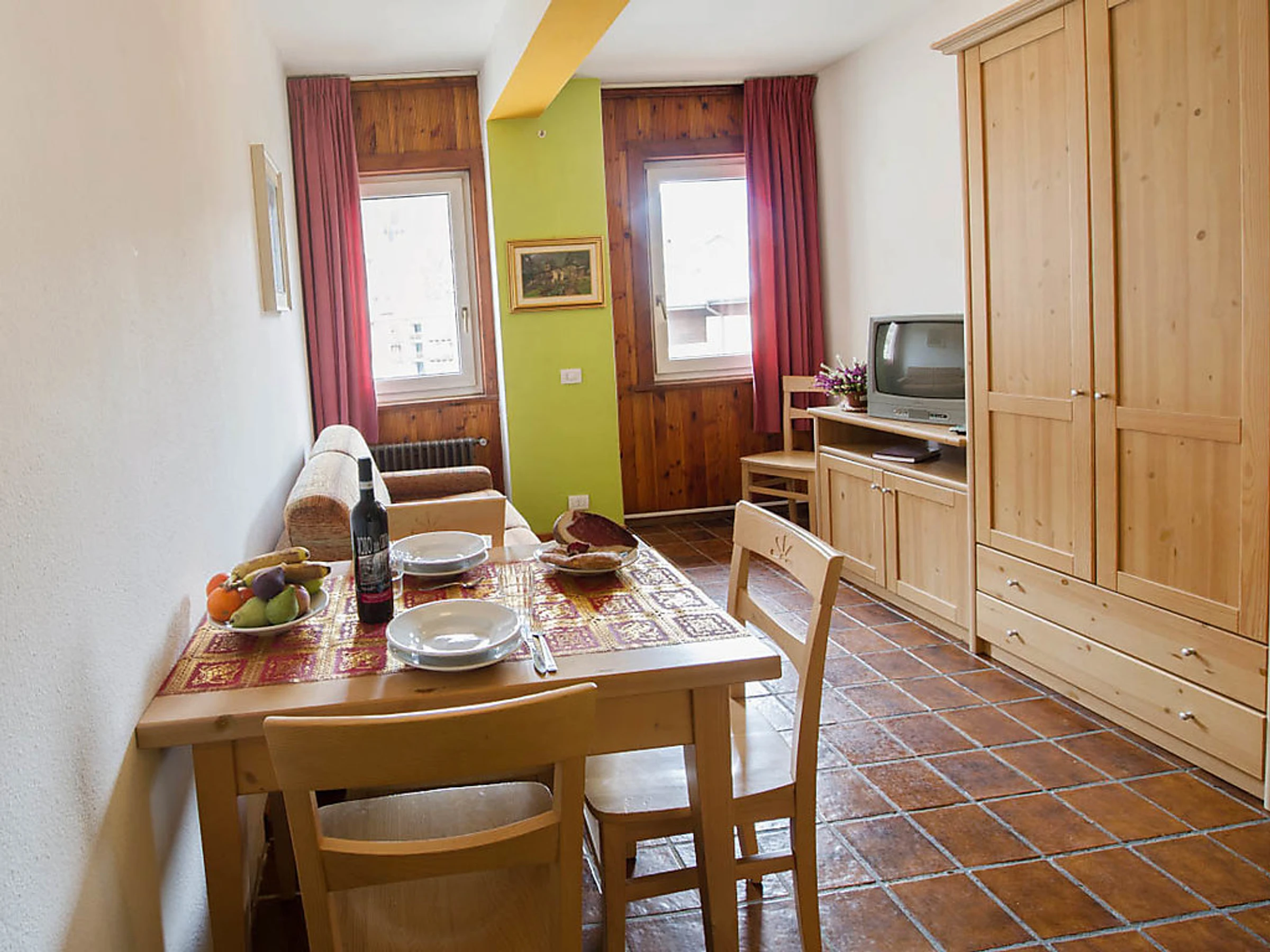 Studio 30 m2. Rénové, aménagement confortable et moderne: séjour/chambre à coucher avec 1 divan-lit double, table pour les repas et TV (satellite) (écran plat). Sortie sur le balcon. Coin cuisine (4 plaques vitrocéramique, four micro-ondes, congélateur, gril). Douche/bidet/WC. Petit balcon. Vue sur les montagnes et la vallée. A disposition: sèche-cheveux. Internet (Connexion WIFI, gratuit). Veuillez noter: logement pour non fumeurs. Maximum 2 animaux/ chiens autorisés. Sans ascenseur. Disponible sur le site avec supplément: Animaux 3.5EUR par jour, Serviettes (premier jeu) 8.0EUR par personne, Lit bébé (jusqu'à 2 ans) 10.0EUR par personne et par jour Services supplémentaires obligatoires sur le site: Nettoyage final 15.0EUR par personne, Taxe de séjour 1.3EUR par personne et par jour