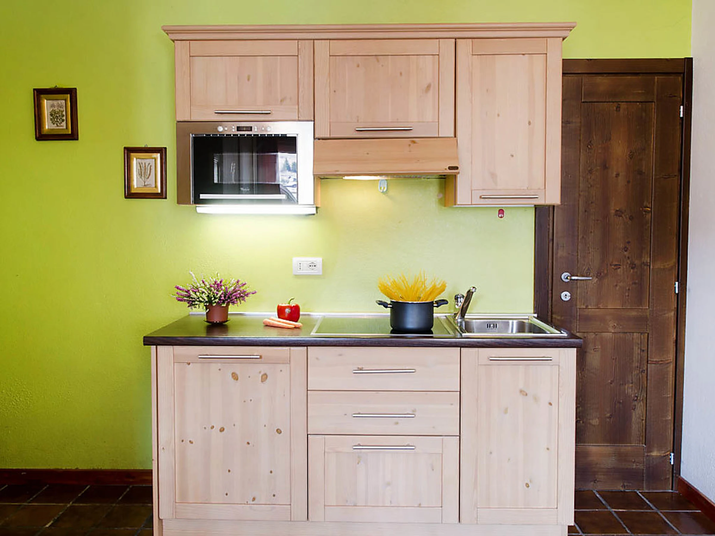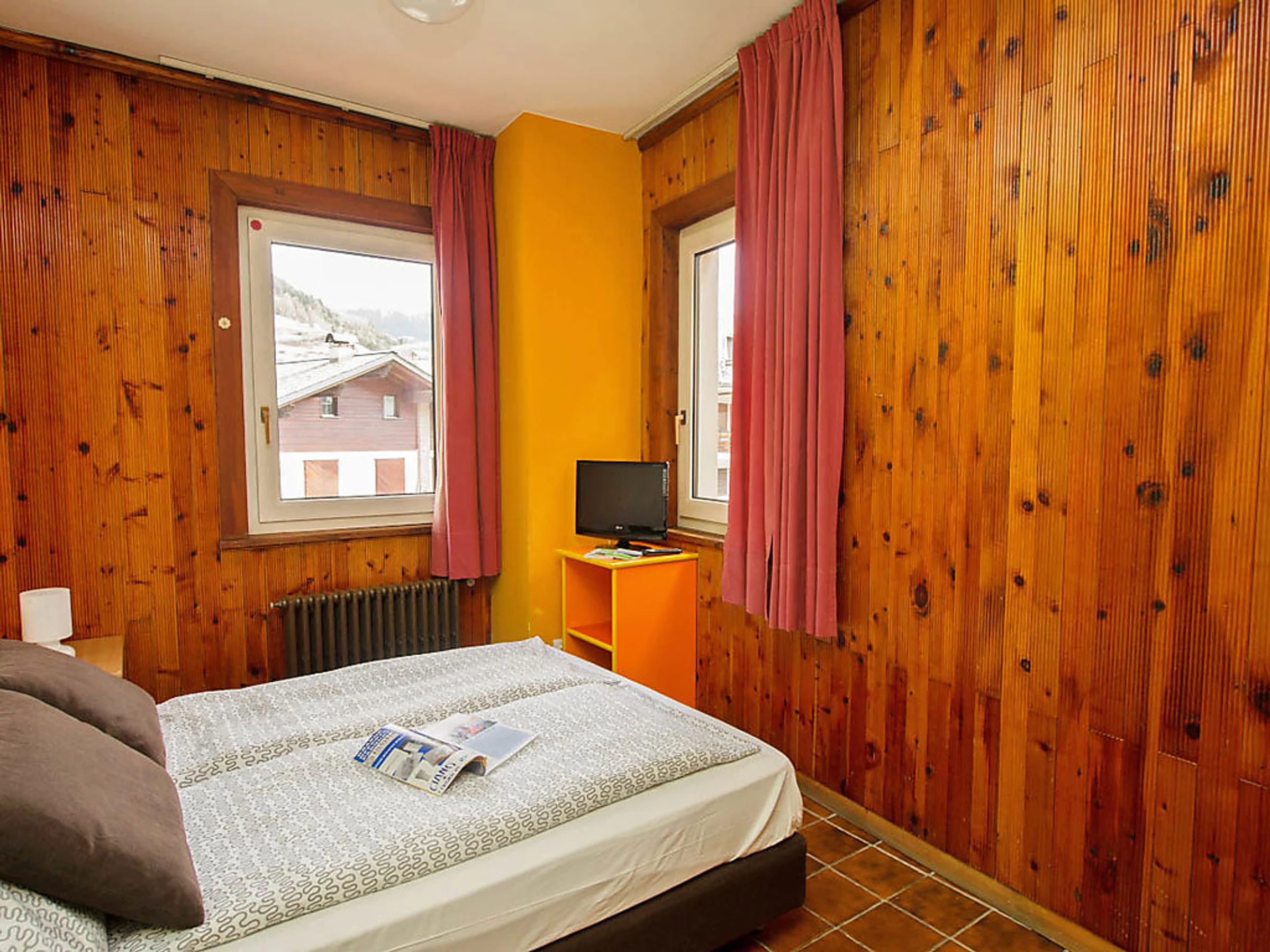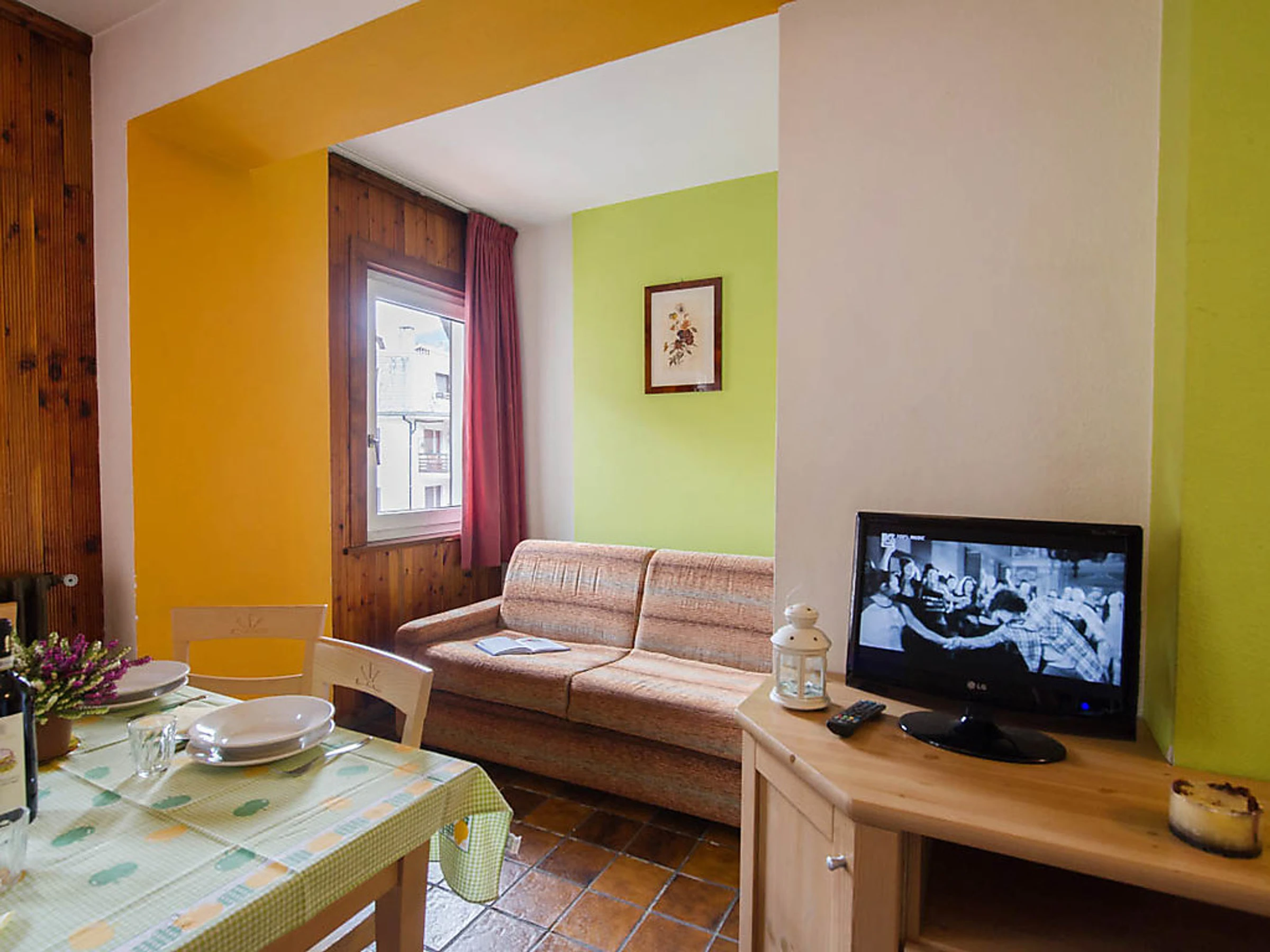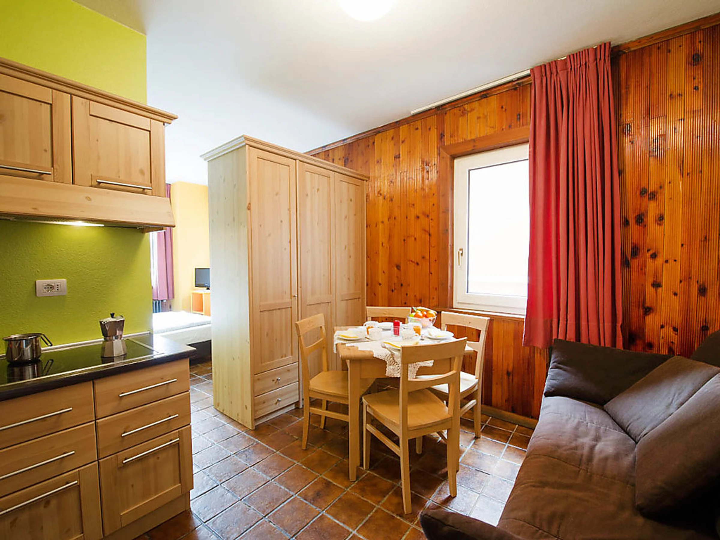 Studio 30 m2. Rénové, aménagement confortable et moderne: séjour/chambre à coucher avec 1 divan-lit double, table pour les repas et TV (satellite) (écran plat). Sortie sur le balcon. Coin cuisine (4 plaques vitrocéramique, four micro-ondes, congélateur, gril). Douche/bidet/WC. Petit balcon. Vue sur les montagnes et la vallée. A disposition: sèche-cheveux. Internet (Connexion WIFI, gratuit). Veuillez noter: logement pour non fumeurs. Maximum 2 animaux/ chiens autorisés. Sans ascenseur. Disponible sur le site avec supplément: Animaux 3.5EUR par jour, Serviettes (premier jeu) 8.0EUR par personne, Lit bébé (jusqu'à 2 ans) 10.0EUR par personne et par jour Services supplémentaires obligatoires sur le site: Nettoyage final 15.0EUR par personne, Taxe de séjour 1.3EUR par personne et par jour