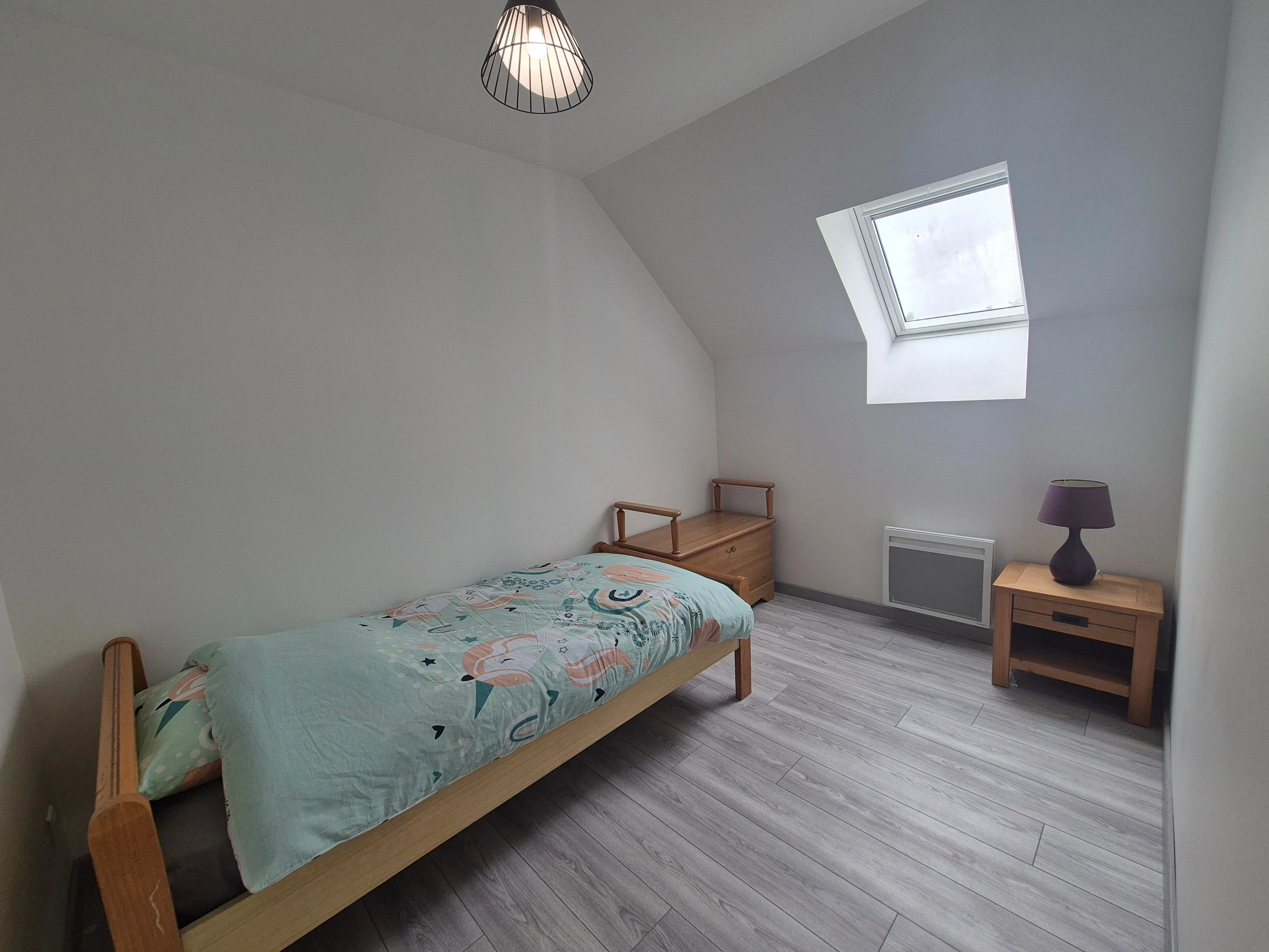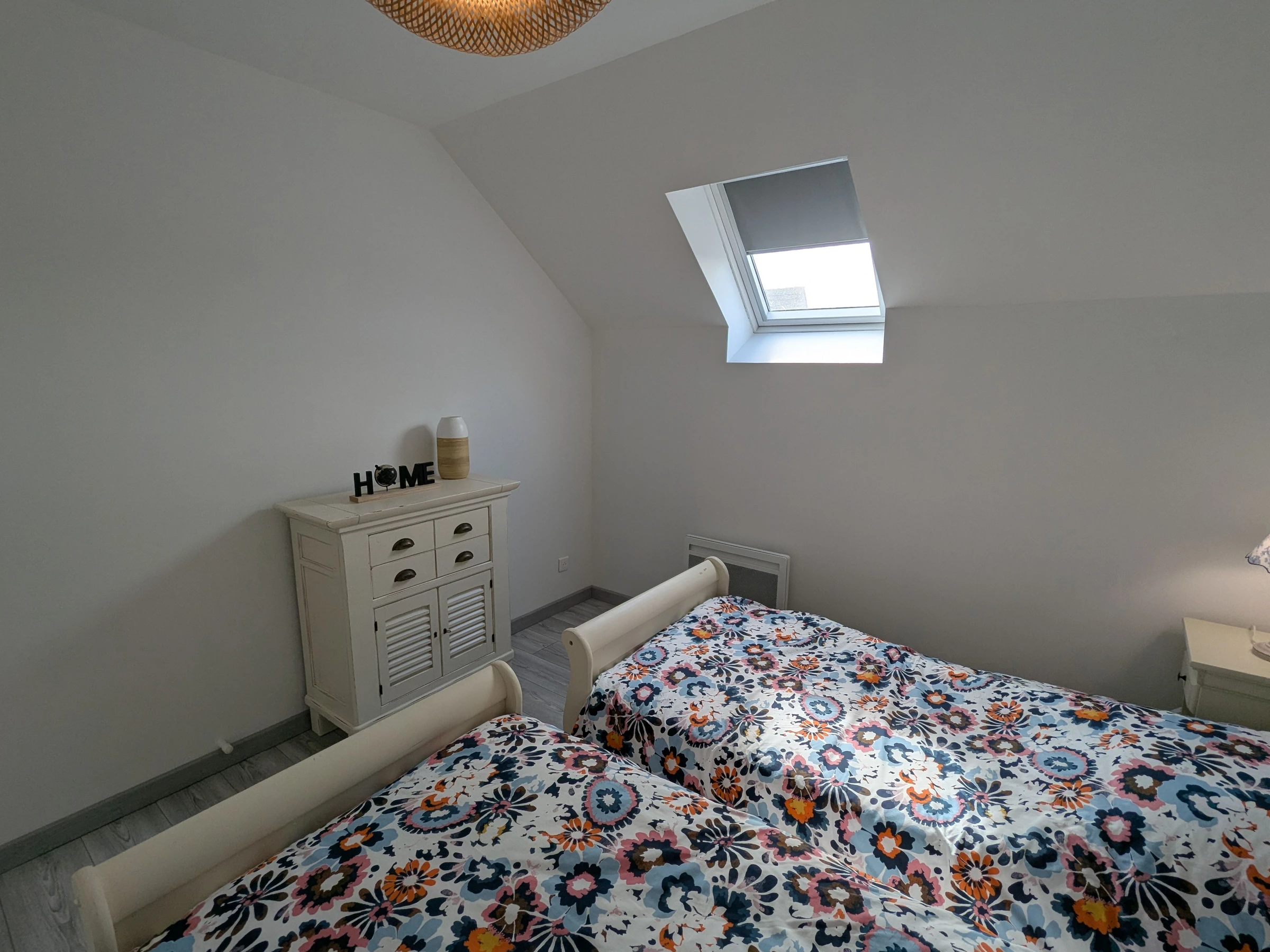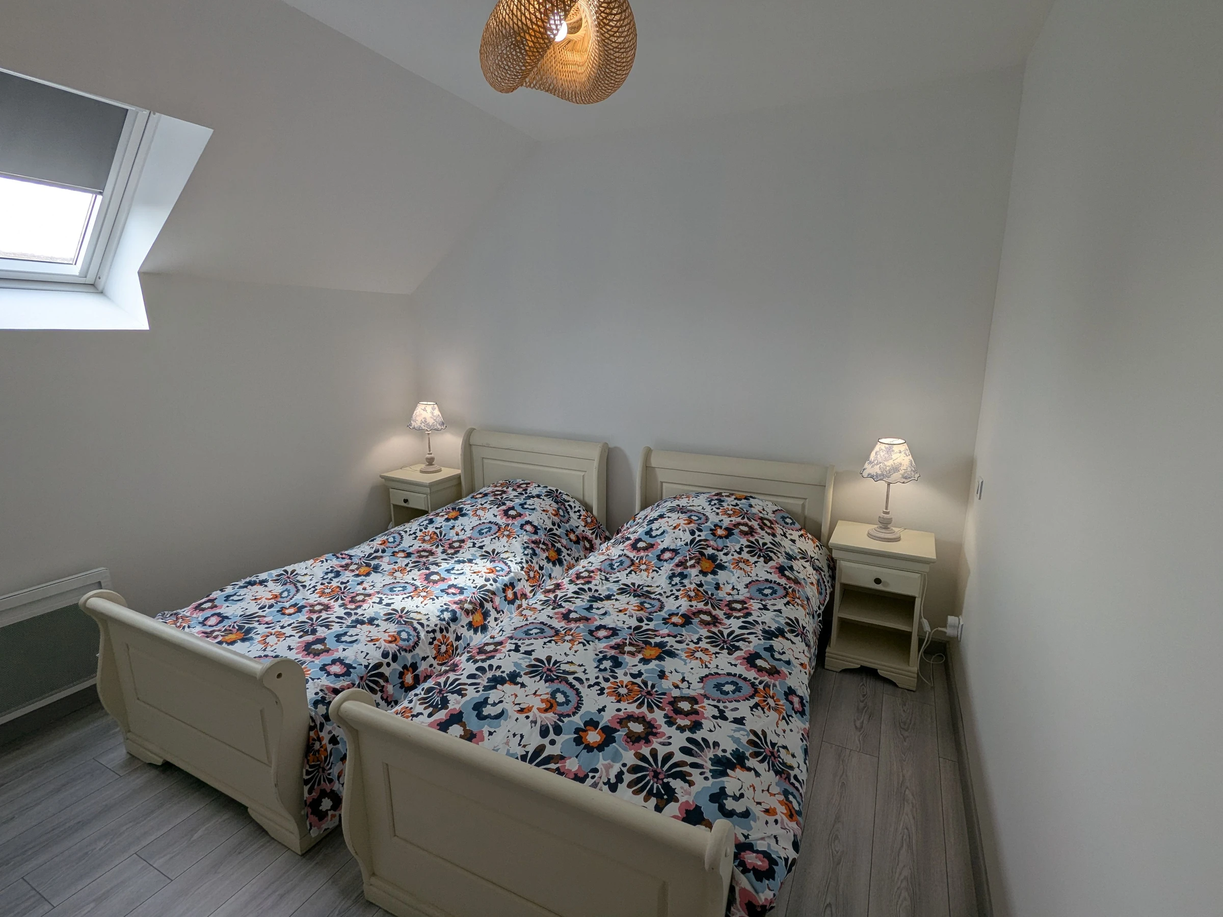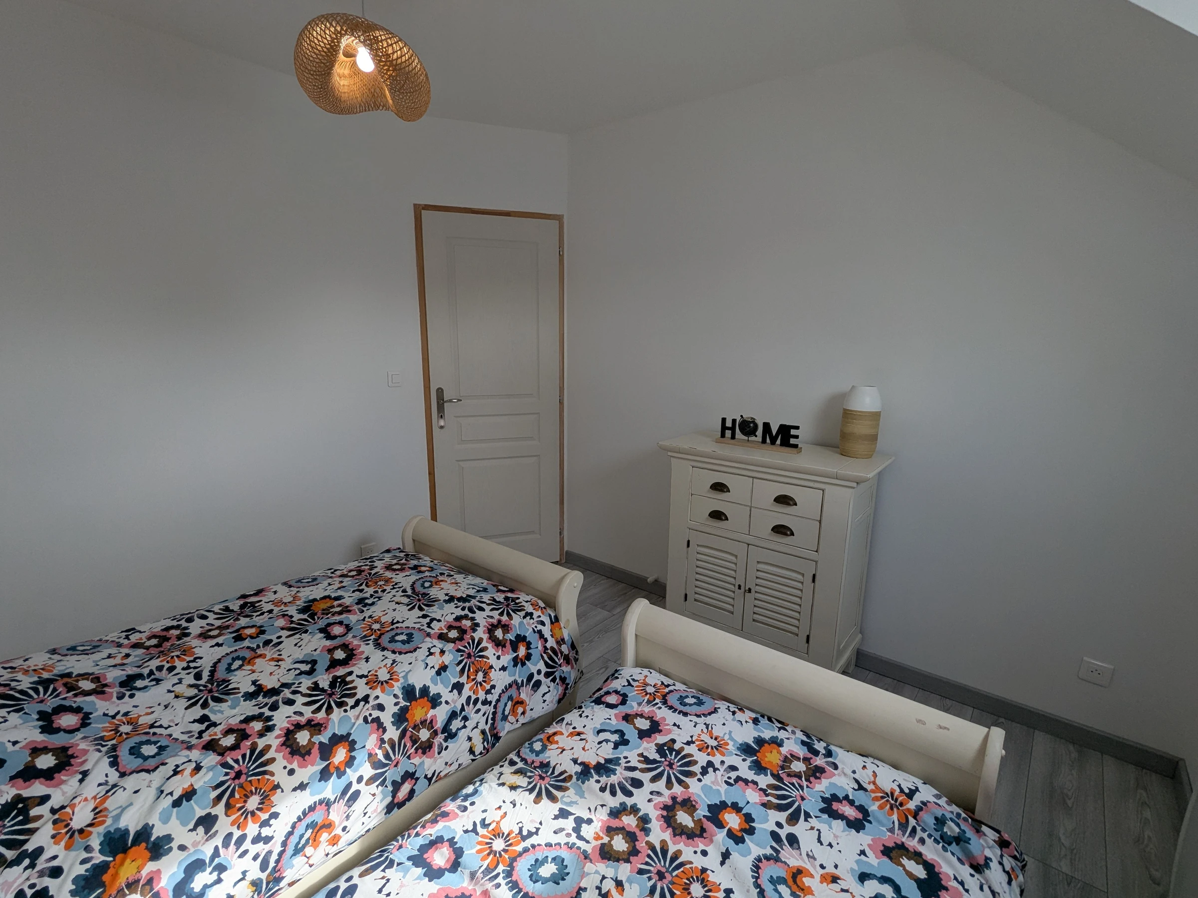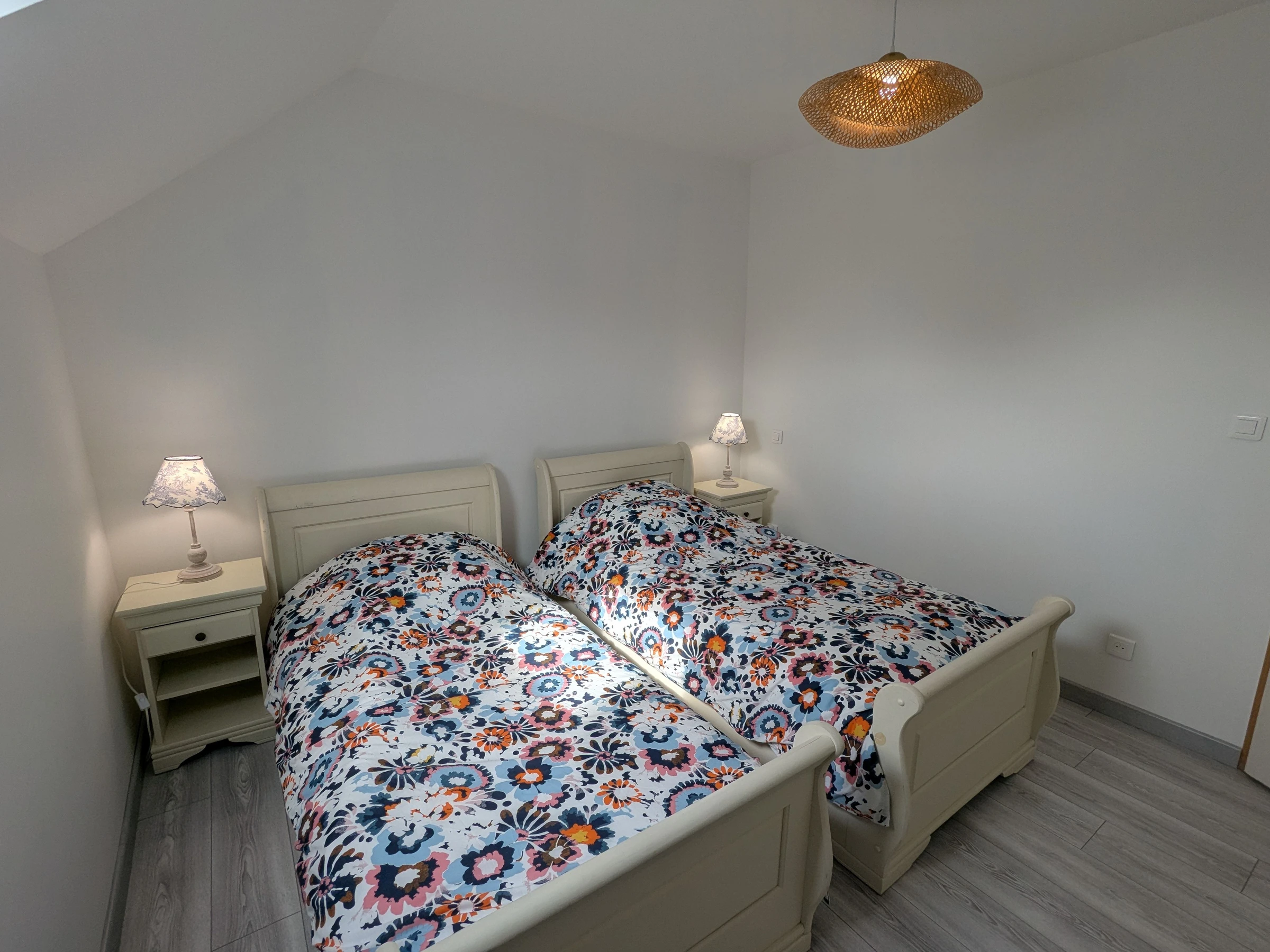 A l'étage, quatre chambres, deux chambres avec chacune un lit double 140x190 cm, une chambre avec deux lits simple 90x190 cm, une chambre avec un lit simple 90x190 cm et un wc indépendant.