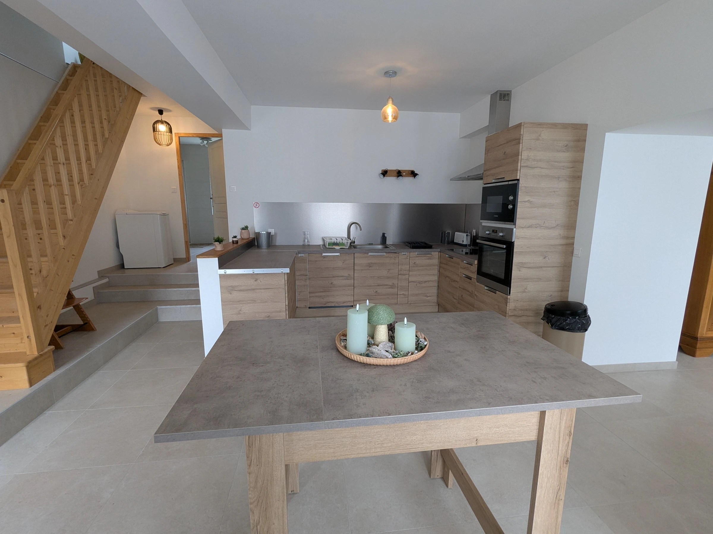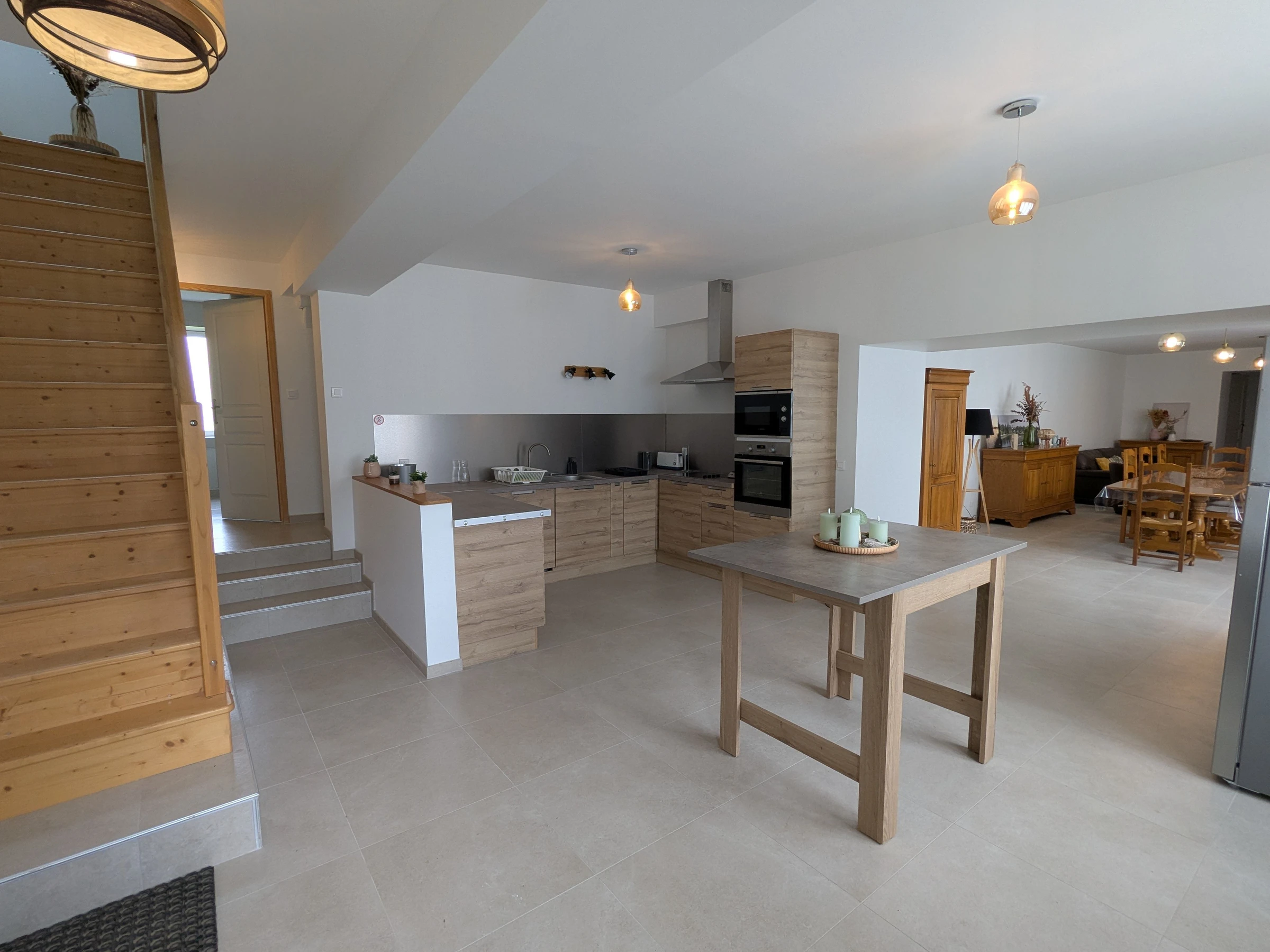 Un intérieur spacieux et convivial, avec au rez-de-chaussée, une vaste pièce de vie de 110 m² : hall avec vestiaire, deux WC indépendants avec lave-mains, un salon chaleureux, une salle à manger conviviale et une cuisine entièrement équipée, idéale pour préparer de bons repas à partager. Egalement une chambre avec un lit double 160x200 cm et une salle d'eau avec wc.