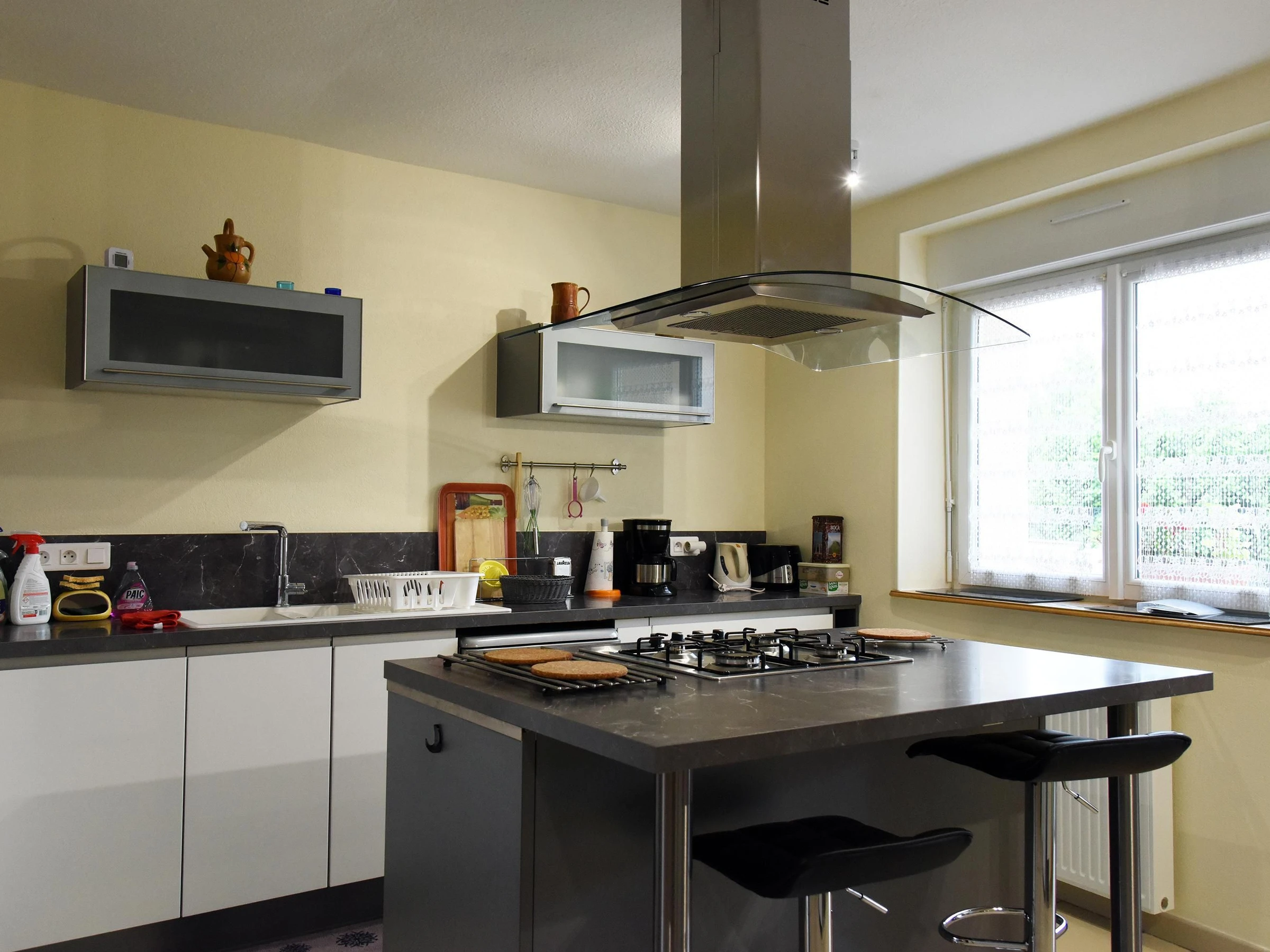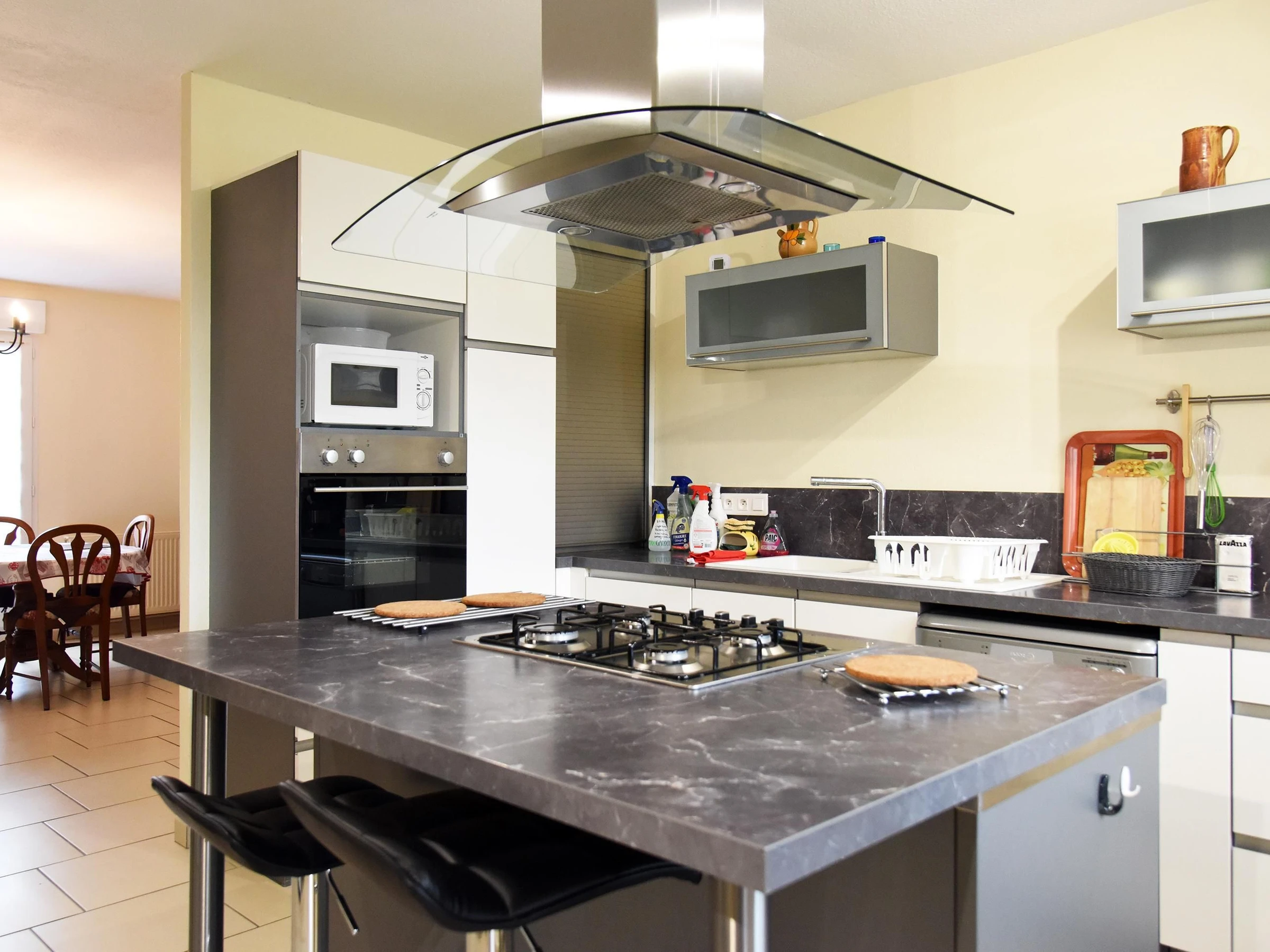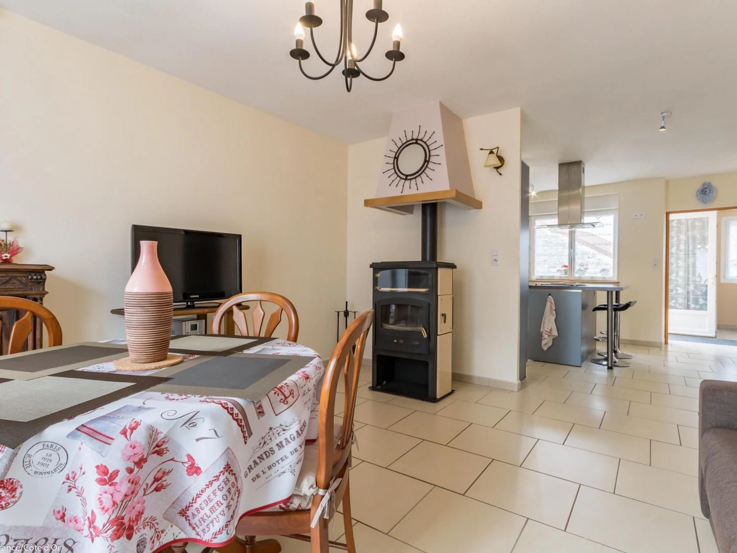 Entrée avec lit gigogne (2 x 80) et bureau, cuisine intégrée avec ilot central, ouverte sur le séjour avec salon (canapé convertible également), salle à manger et poêle à bois d'agrément.