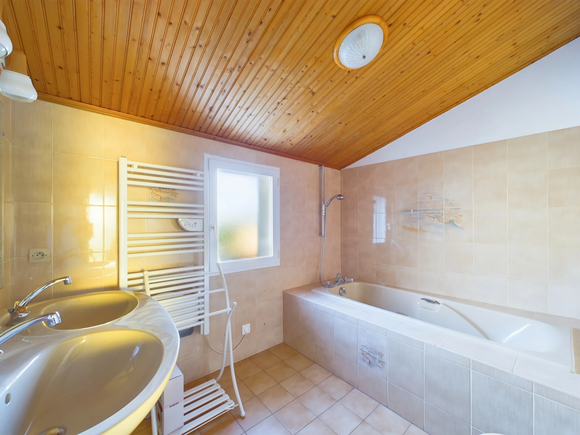 Une salle de bain (baignoire, double vasque, sèche-serviette), un WC séparé et une chambre.
