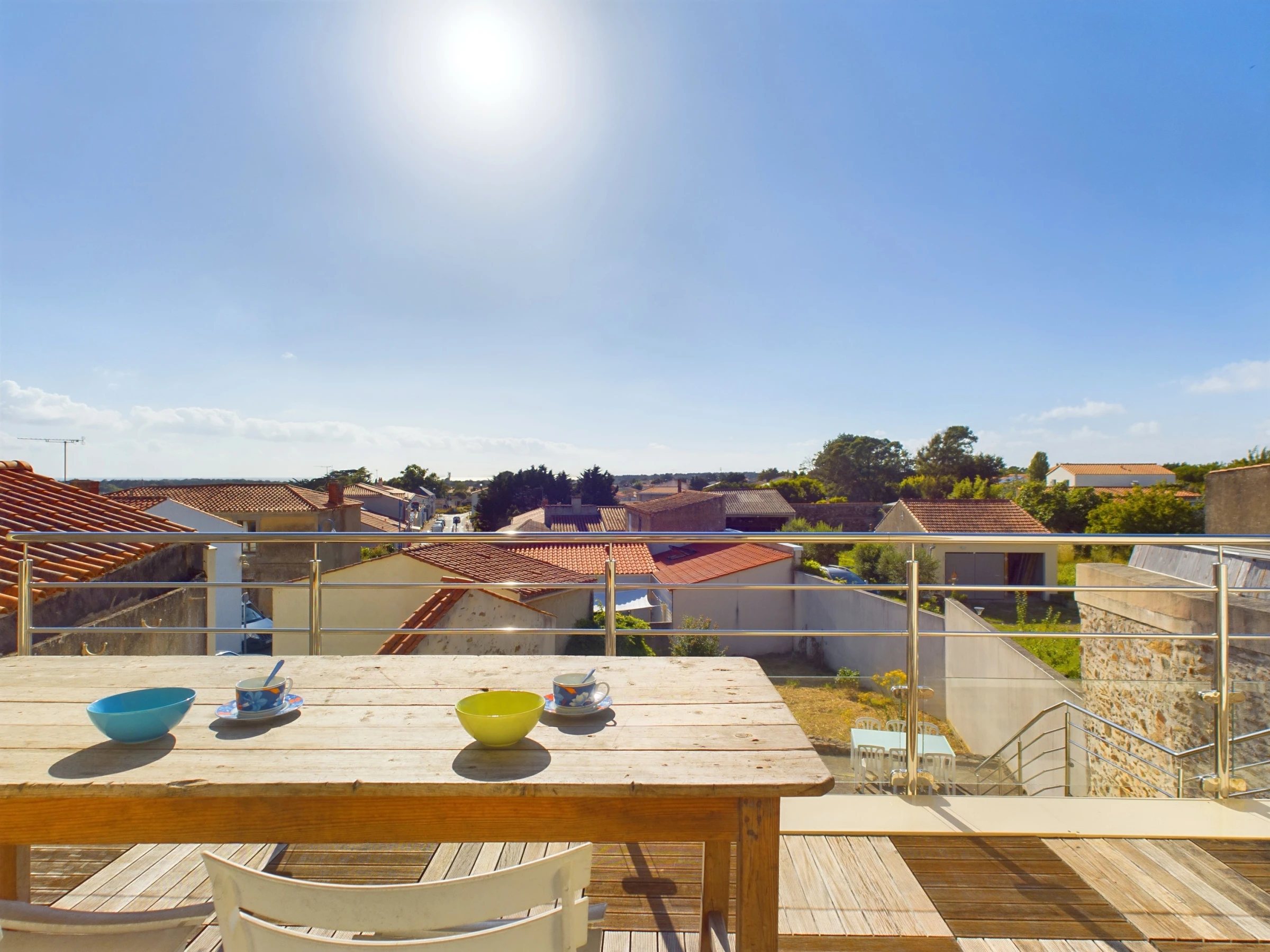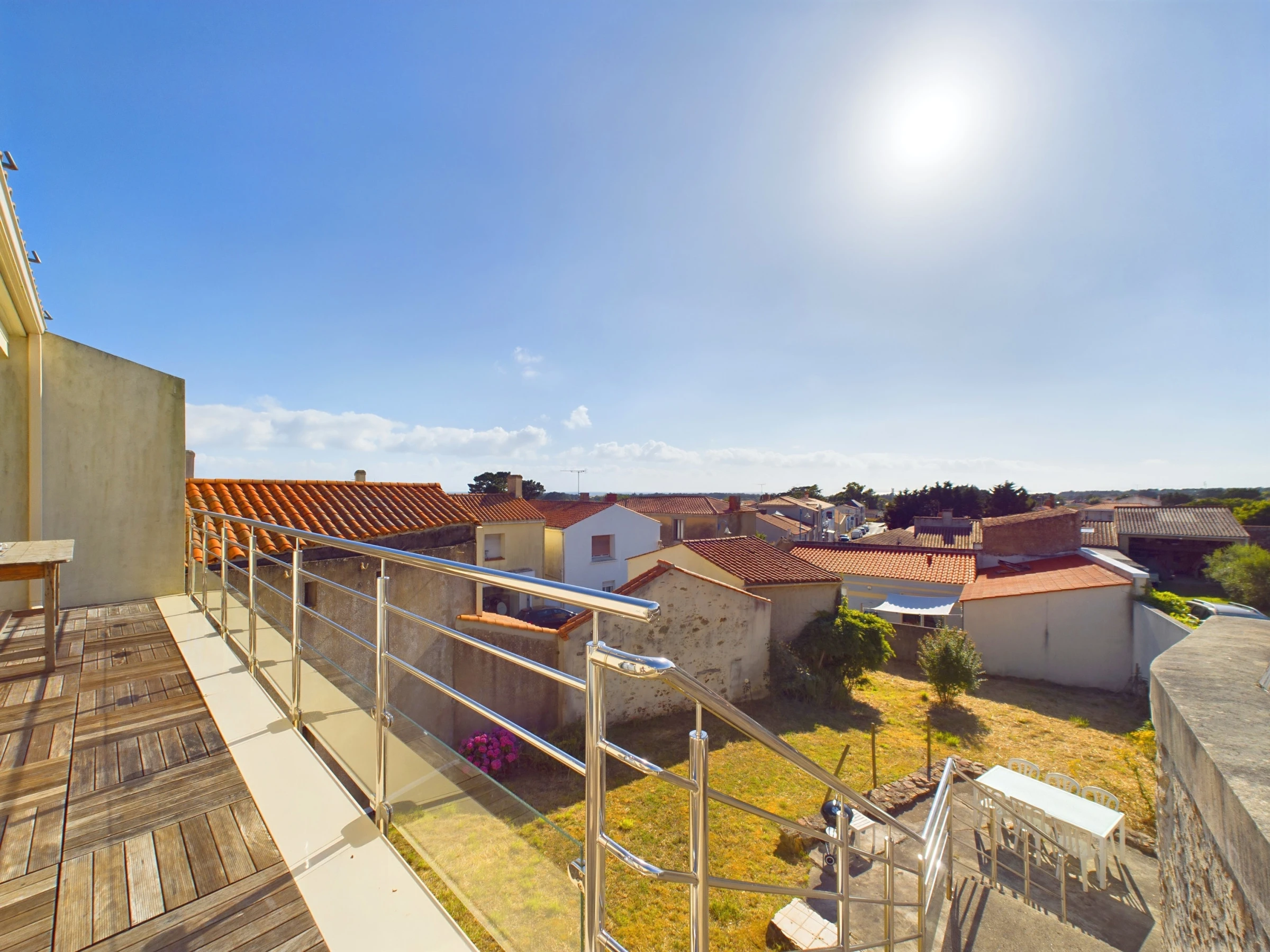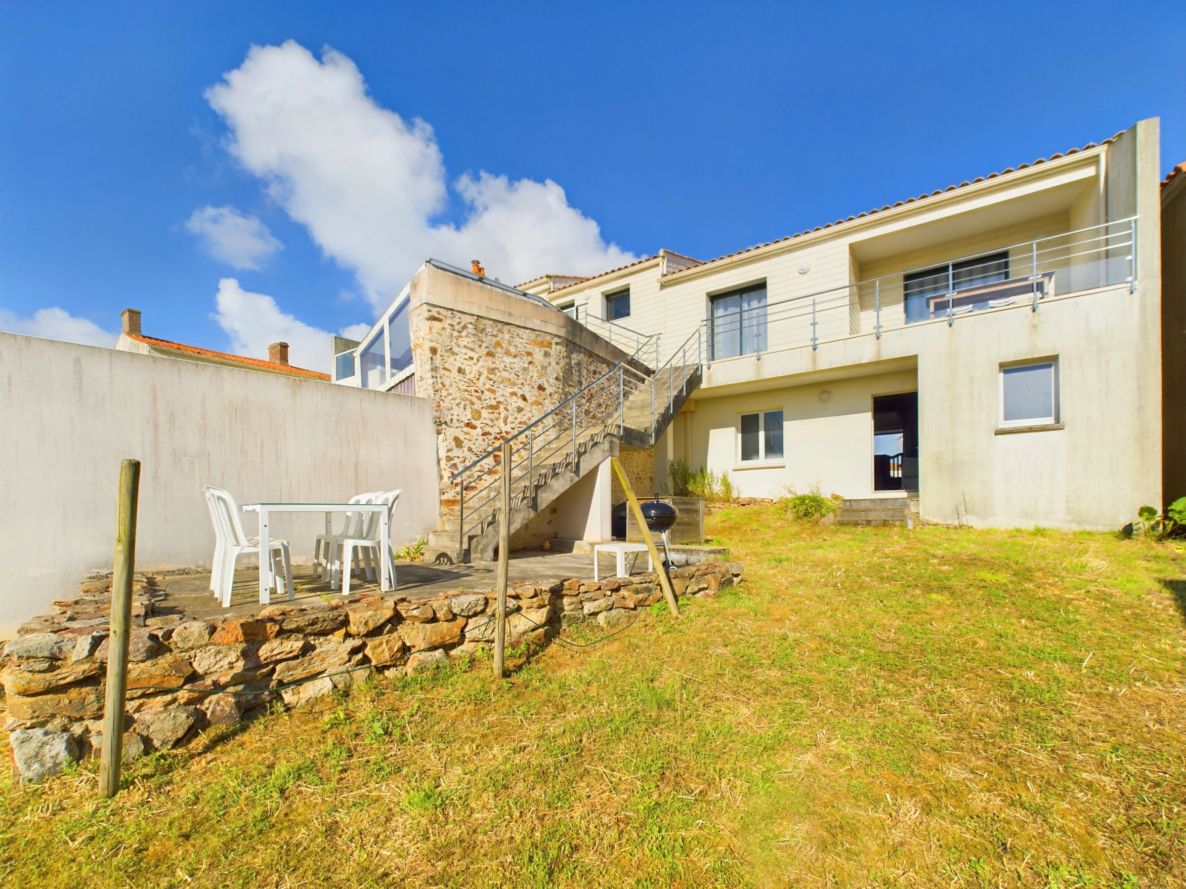 Un escalier permet d'accéder au jardin avec terrasse et salon de jardin (table, chaises).
