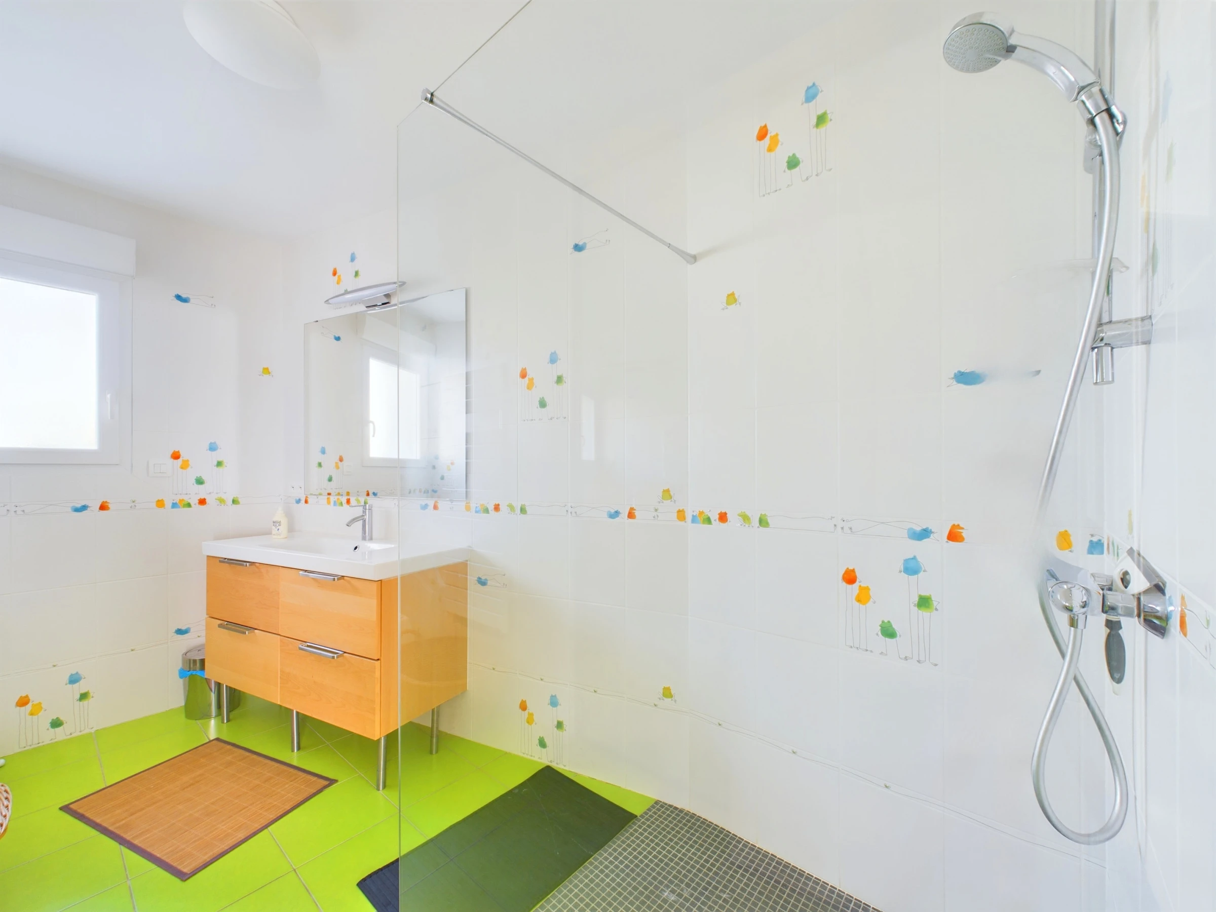 Toujours au même niveau, une seconde partie de la maison a été rénovée et propose 3 autres chambres, un WC indépendant et une salle d'eau (douche italienne, meuble vasque).