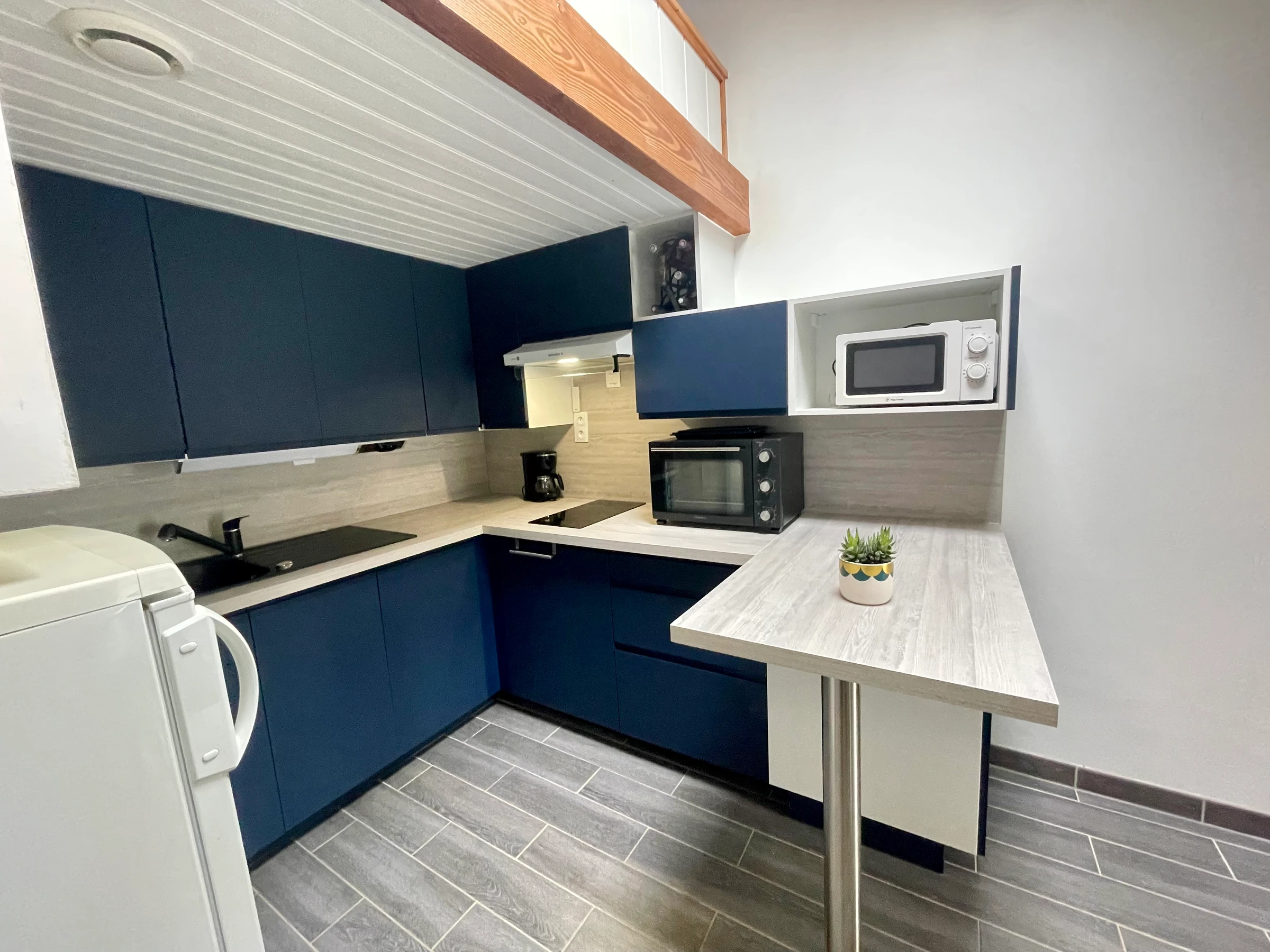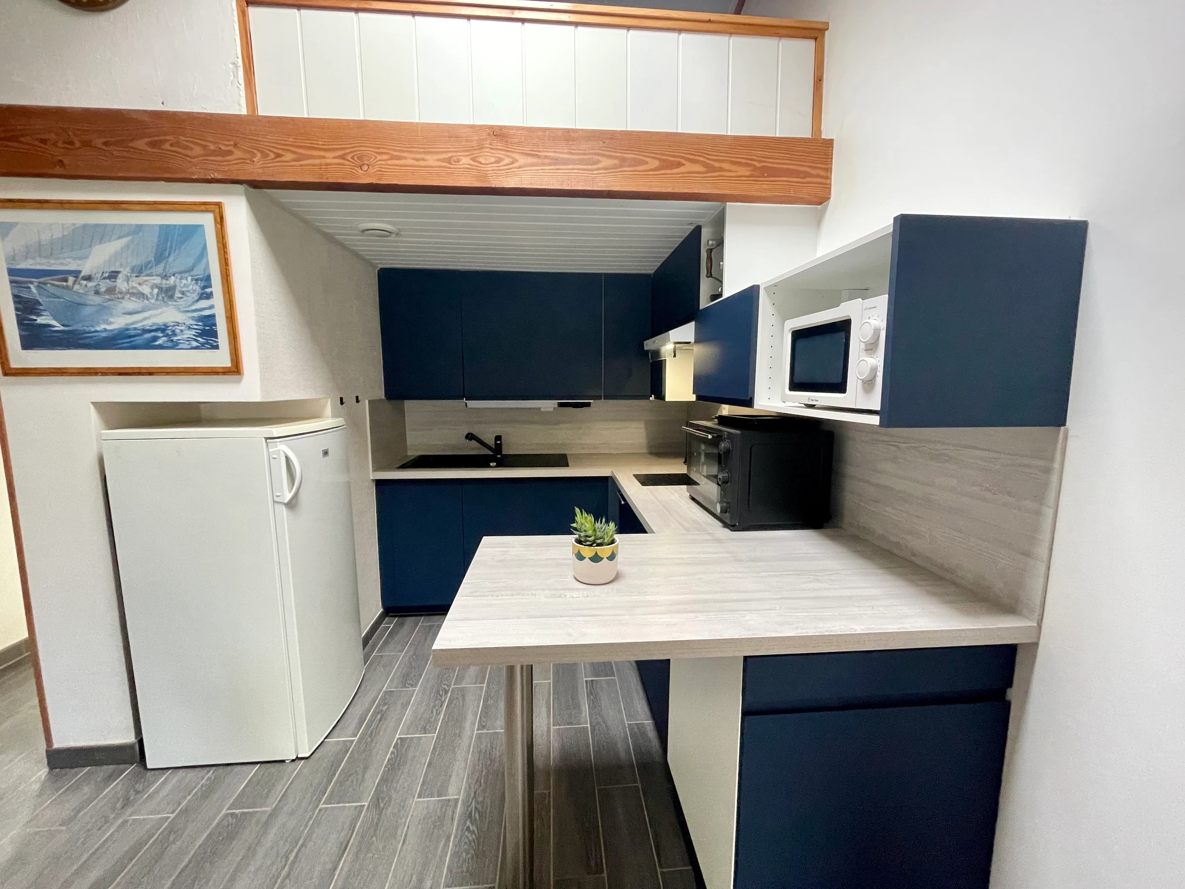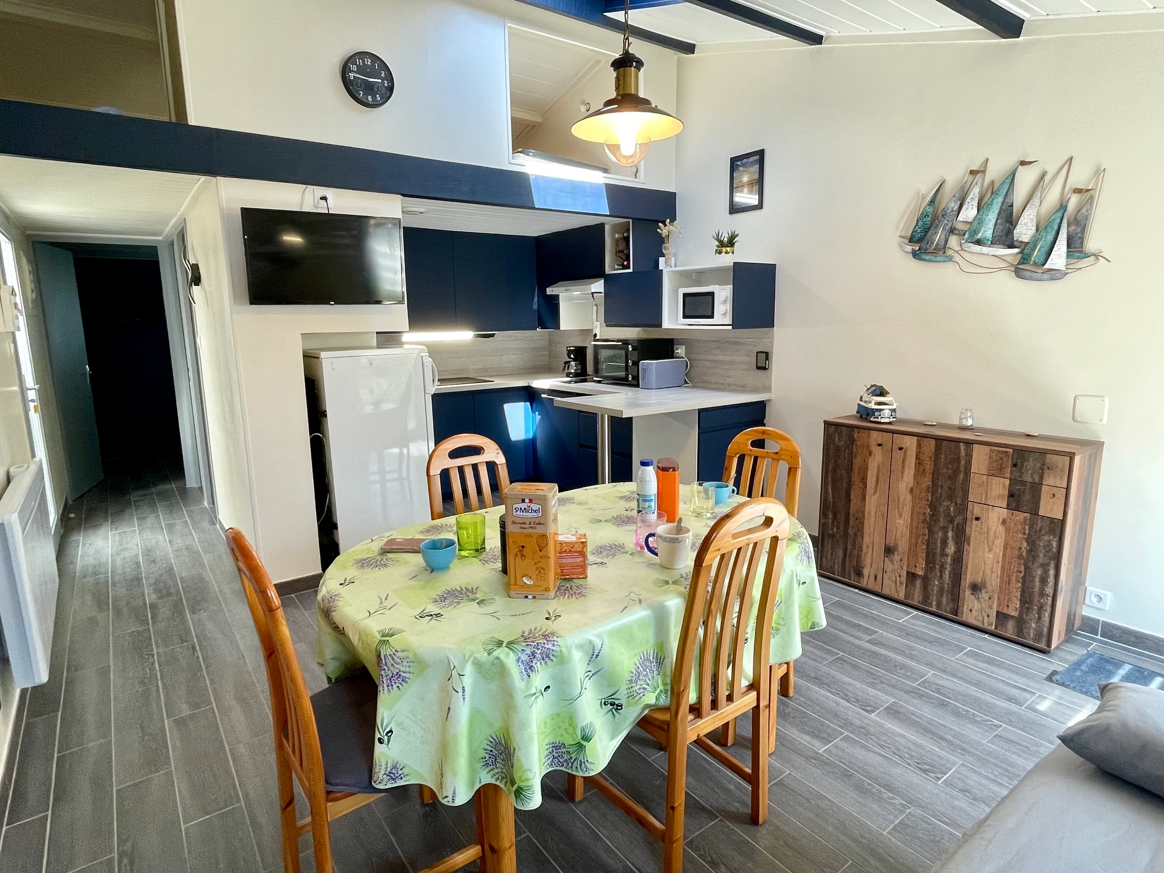 Dans une résidence de vacances avec piscine collective chauffée (ouverte entre mi-juin et mi-septembre), tennis, aire de jeux, terrain de pétanque et espaces verts communs, agréable Ferme Marine récemment rénovée de type 2 comprenant un séjour avec coin repas (table, chaises, buffet), coin repos (canapé lit type "clic-clac", TV écran plat) et une cuisine aménagée et équipée (plaque induction, hotte, four, lave-vaisselle, micro-ondes, réfrigérateur avec partie freezer).