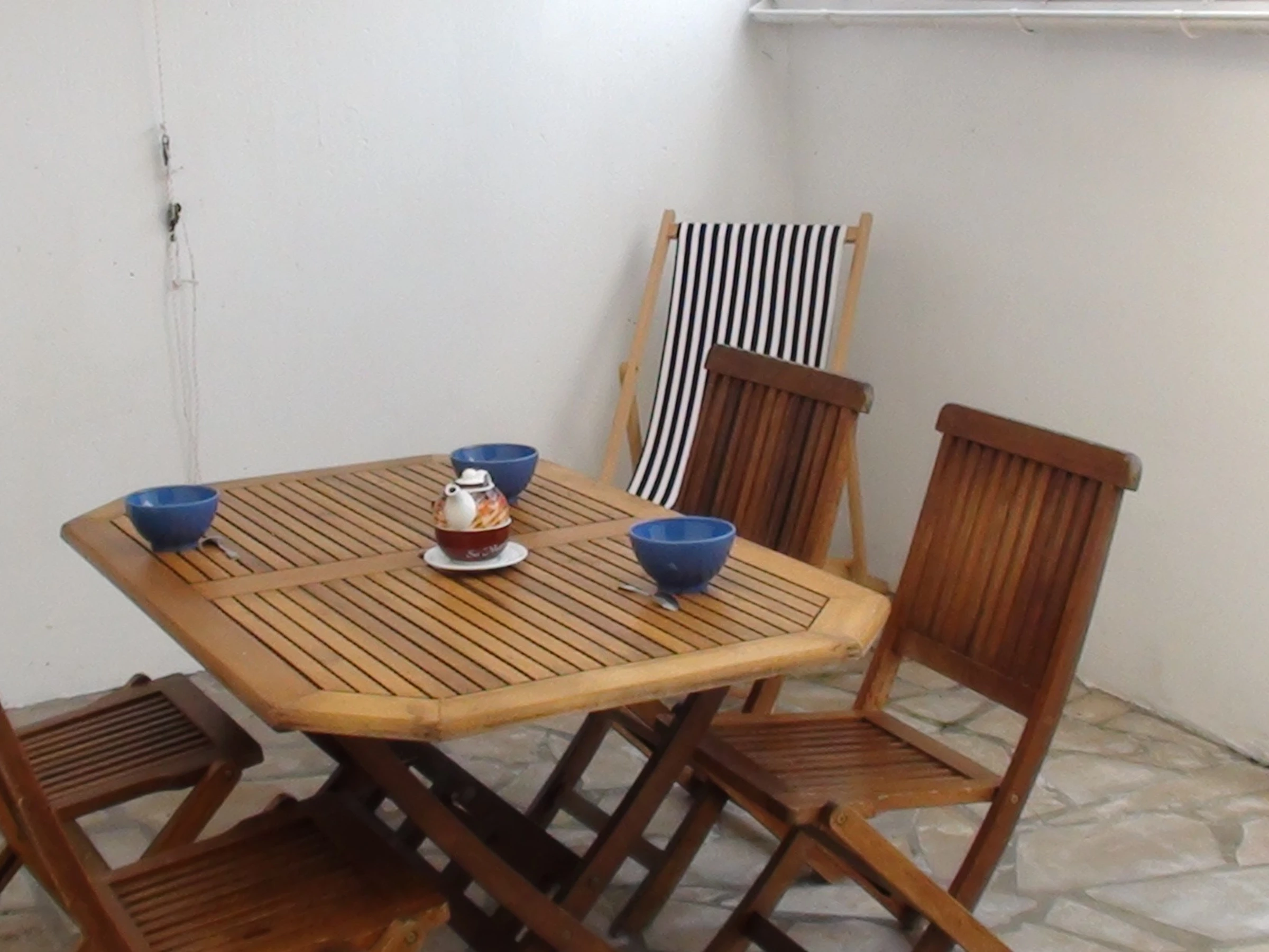 Patio carrelé avec auvent (ouvrant sur espaces verts) avec salon de jardin (table, chaises, barbecue à charbon).