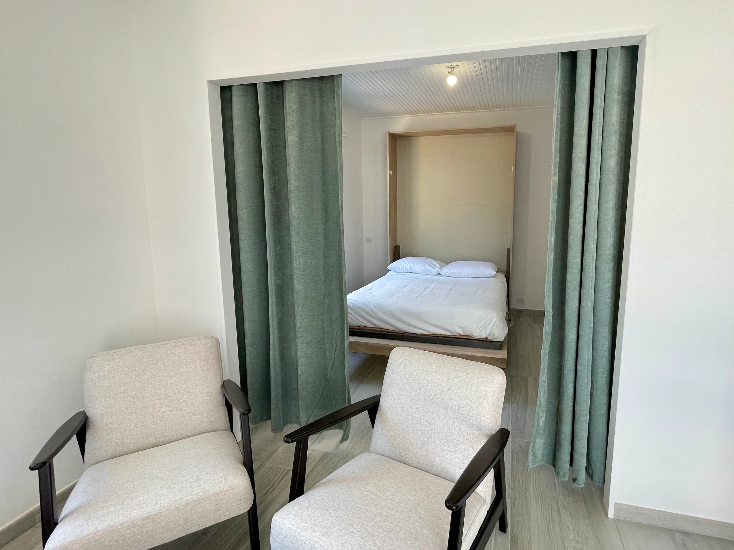 Depuis le salon, on accède à une chambre alcôve (fermée par un rideau): un lit double (140) + rangements (accès possible également par une porte depuis l'entrée).