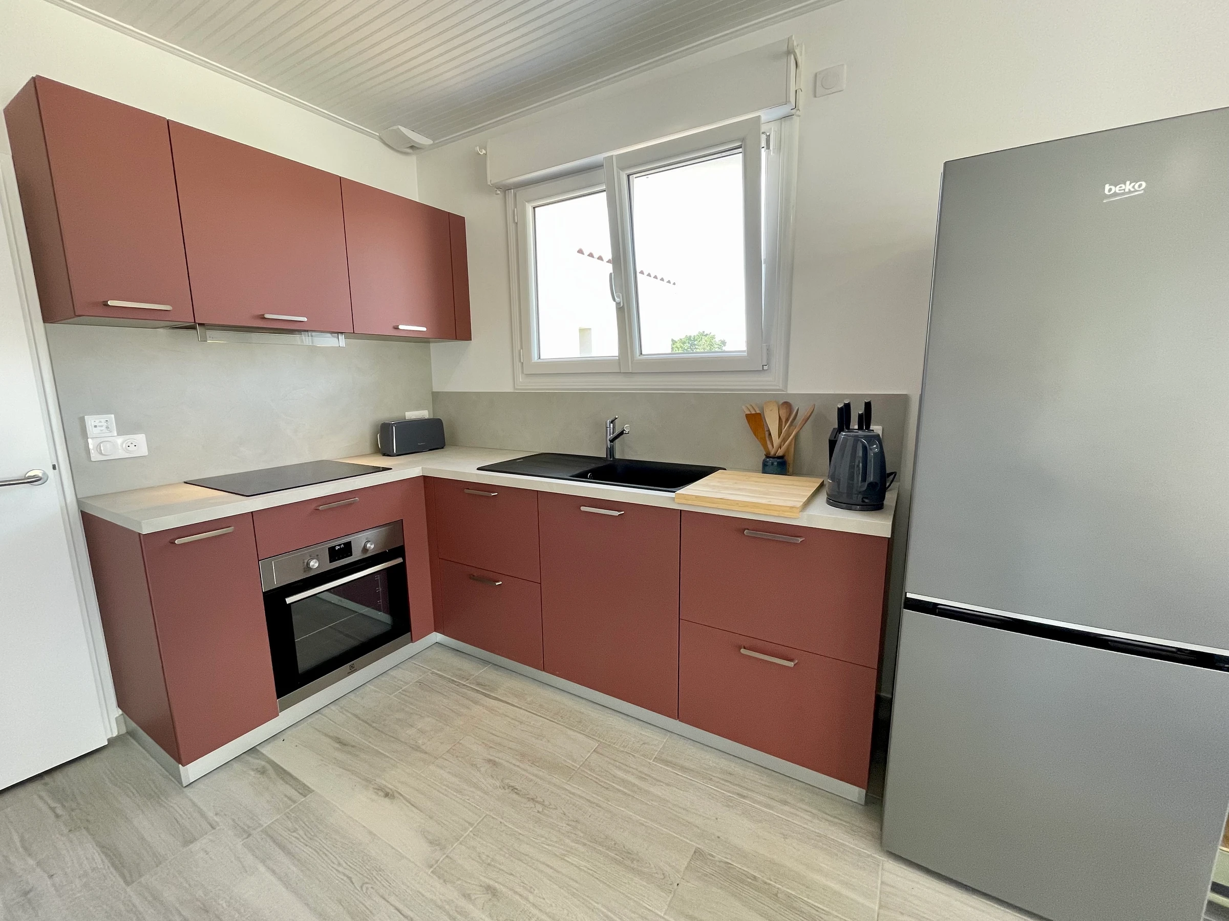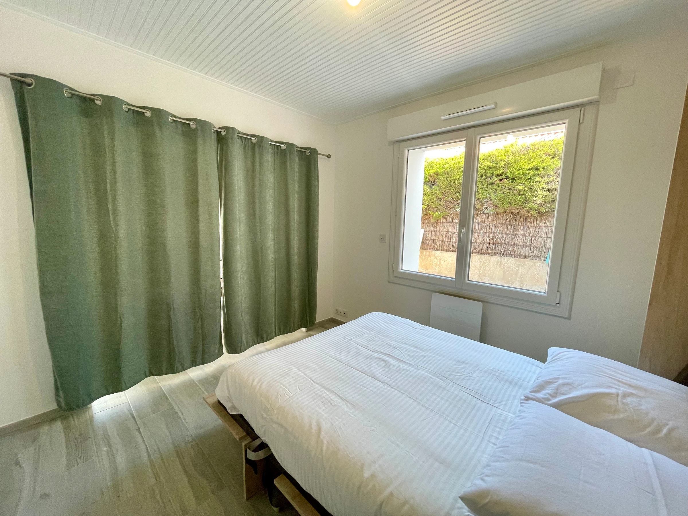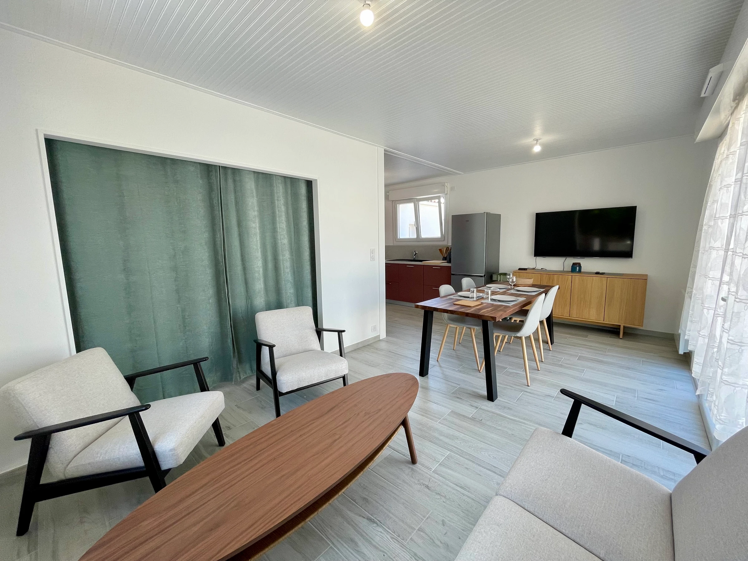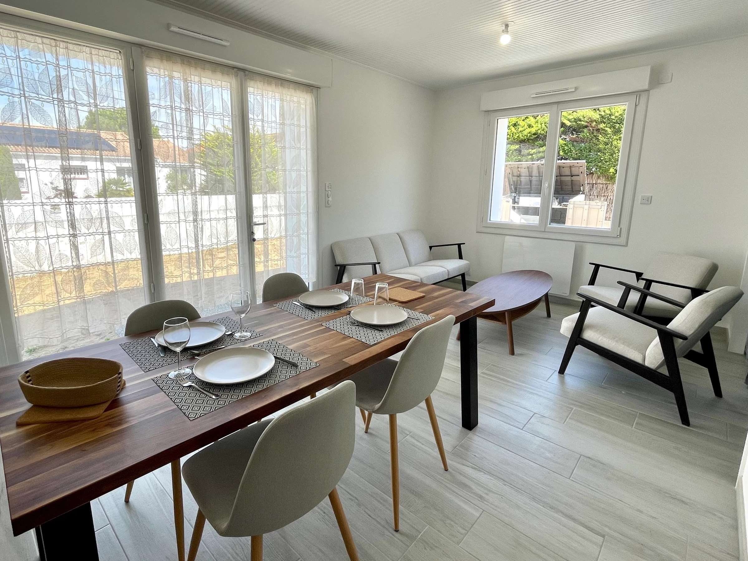 Idéalement située à mi-chemin du bord de mer et du centre ville et au sein d'un quartier résidentiel calme, jolie maison de 59m² de plain pied entièrement rénovée.