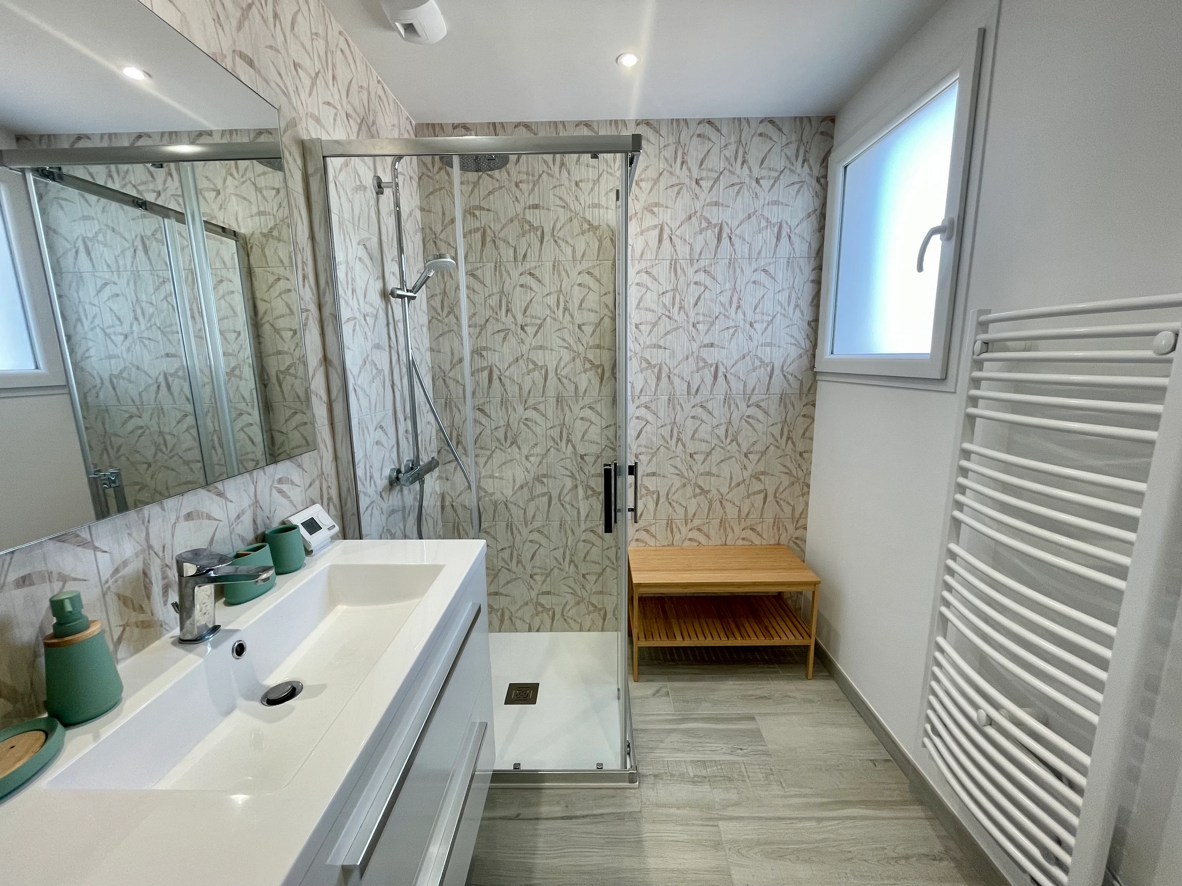 Depuis l'entrée, un dégagement dessert une seconde chambre, un toilette et la salle d'eau (douche, meuble vasque, sèche serviette et combiné lave-linge/sèche-linge).