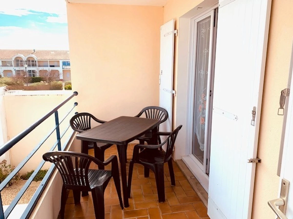 Dans la résidence Plage 2000, avec accès direct à la plage du Marais Girard, appartement de Type 2 + mezzanine (-1.80m), situé au 1er (et dernier) étage de la résidence comprenant: une pièce de vie équipée d'une table de séjour et de chaises, de 2 buffets de rangement, un meuble TV + TV écran plat avec lecteur DVD, un fauteuil.