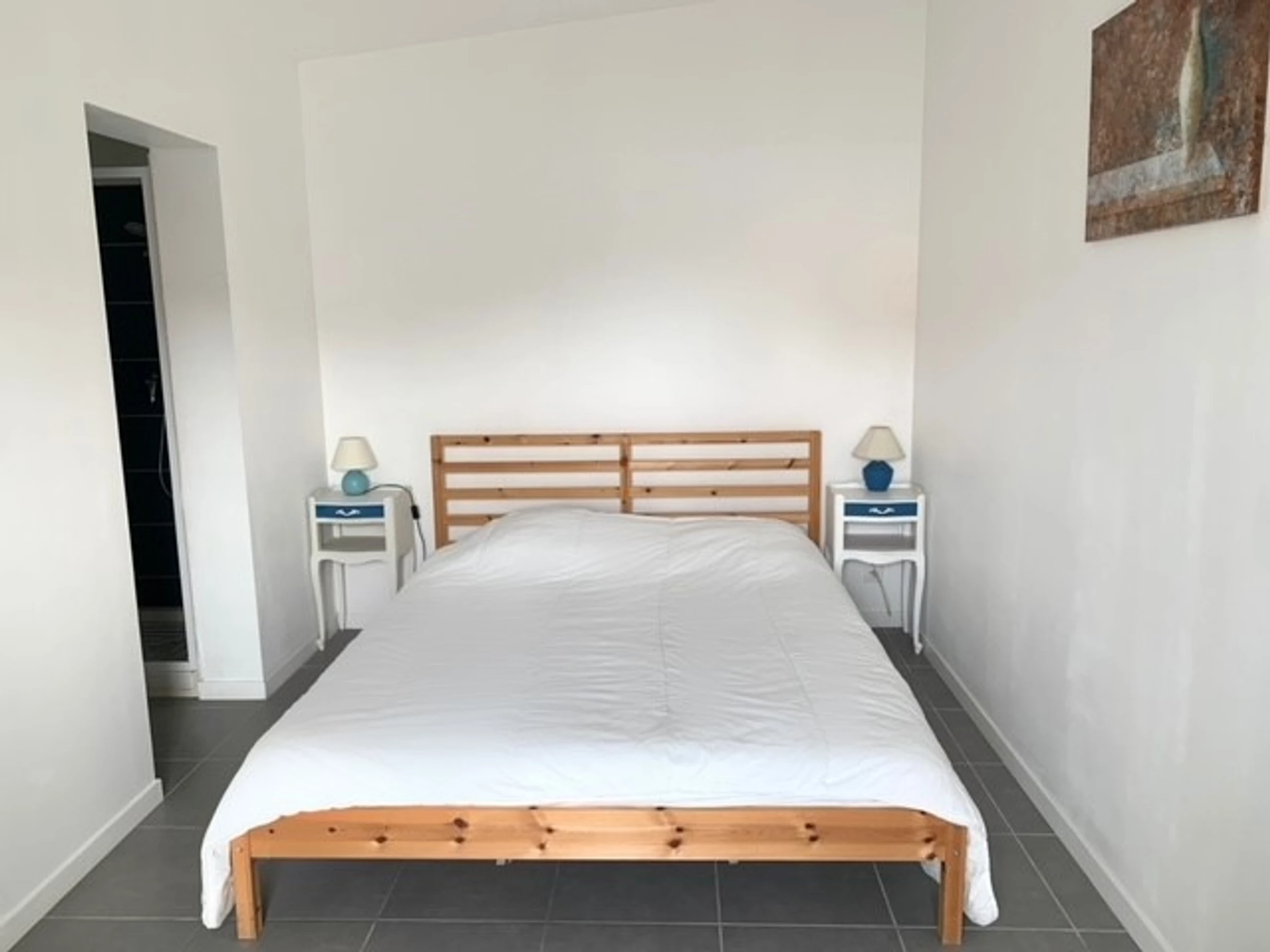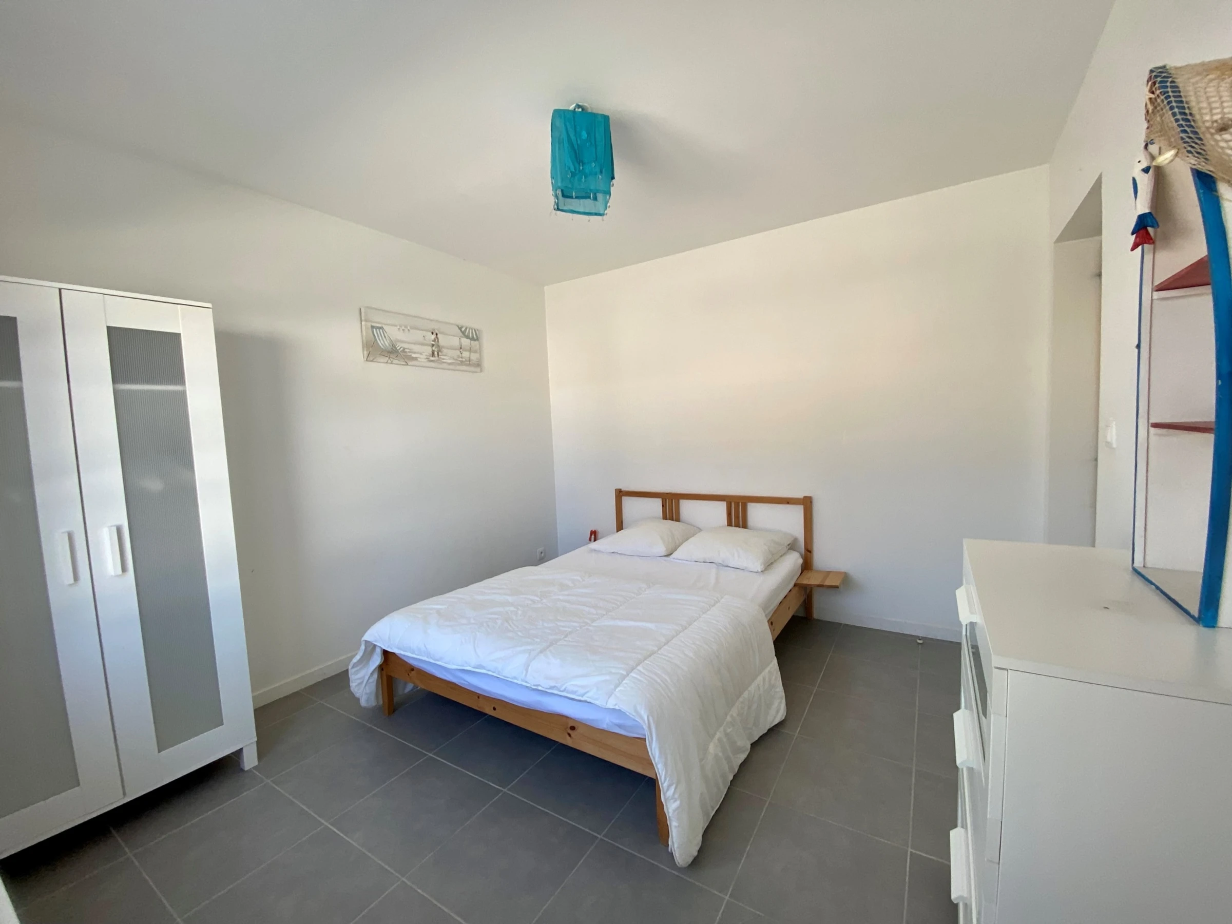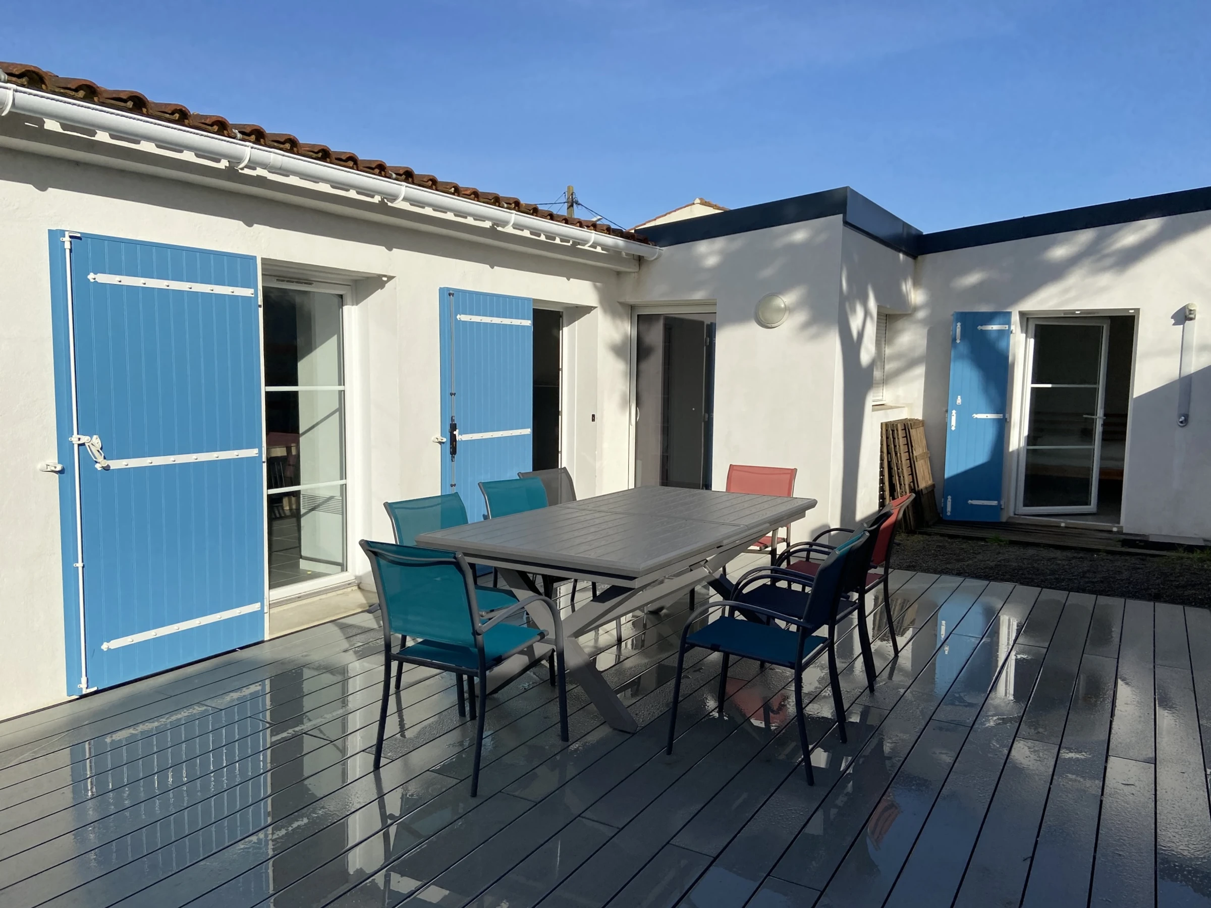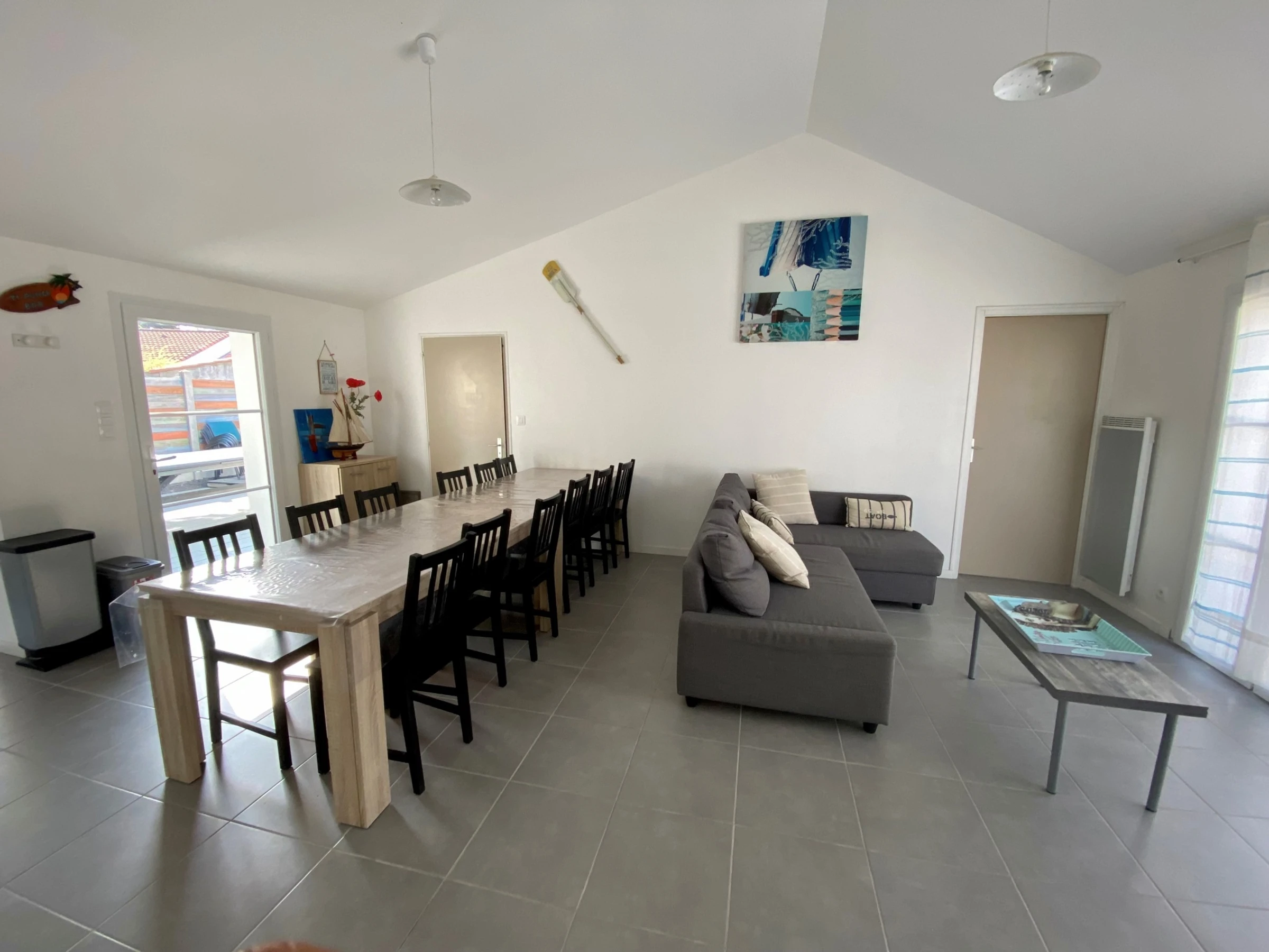 A 250 m de la mer, belle maison entièrement rénovée (de plain-pied) avec terrain clos comprenant une entrée directe dans séjour/salon (canapé d'angle, meuble TV avec TV écran plat, grande table, 12 chaises), cuisine aménagée et équipée (réfrigérateur avec partie congélateur, micro-ondes, four, plaques vitrocéramiques, lave-vaisselle), salle d'eau (double vasque, douche, toilette et lave-linge + rangement) et un toilette indépendant.