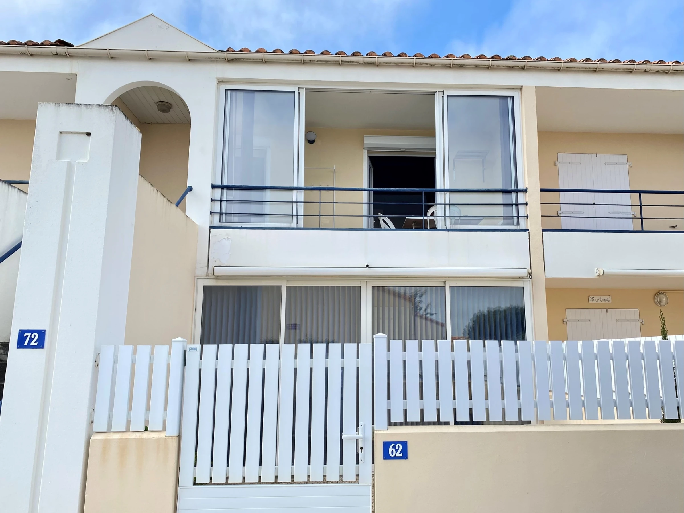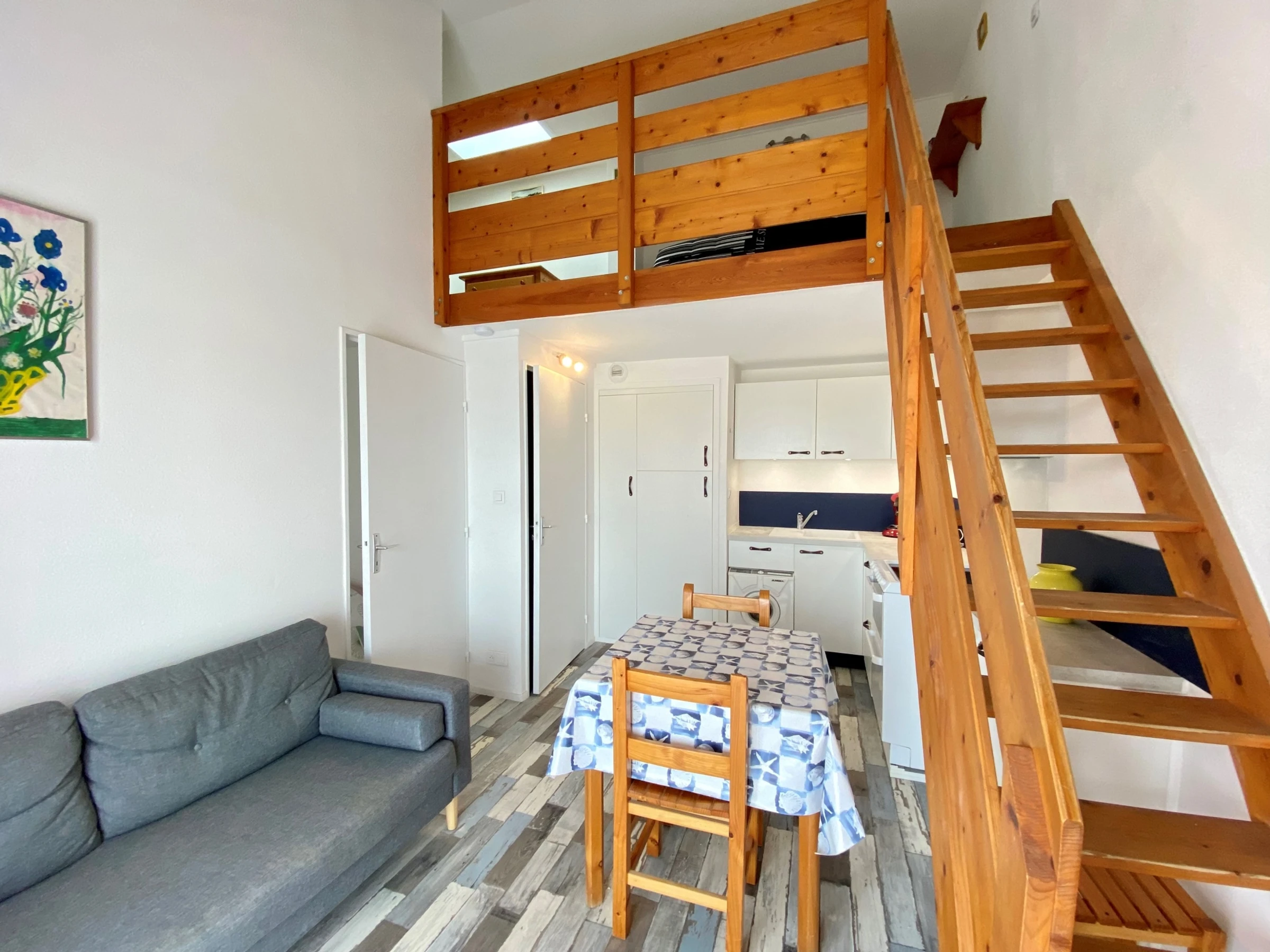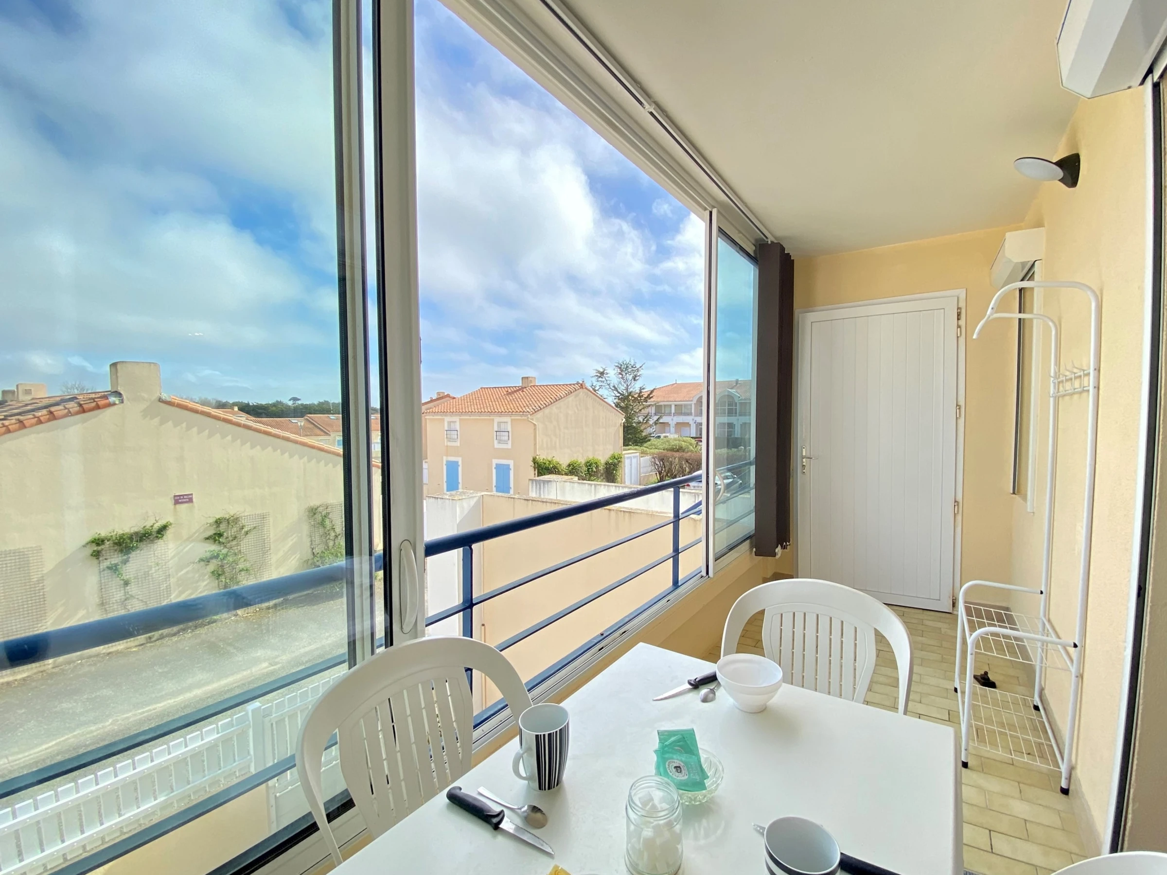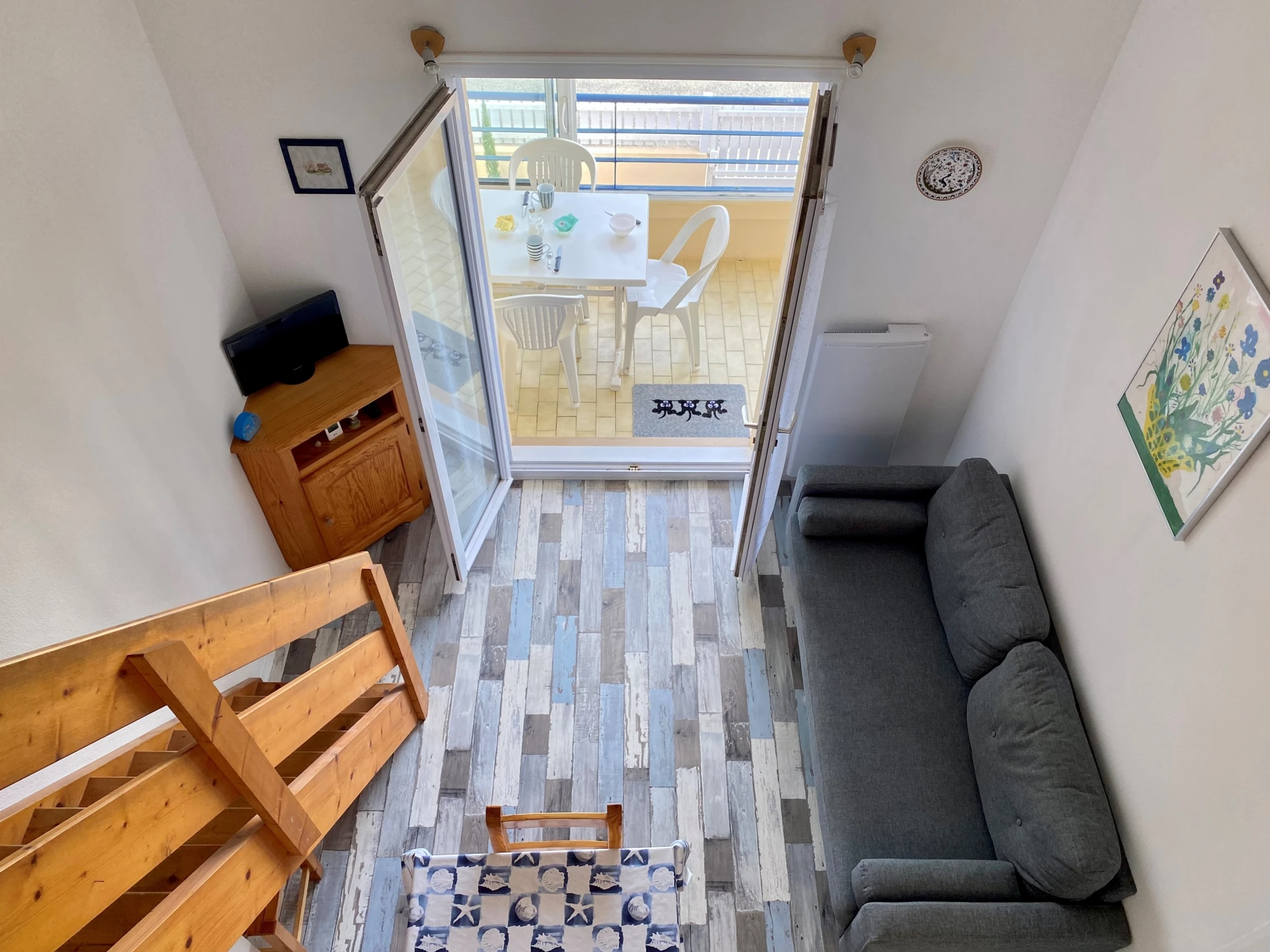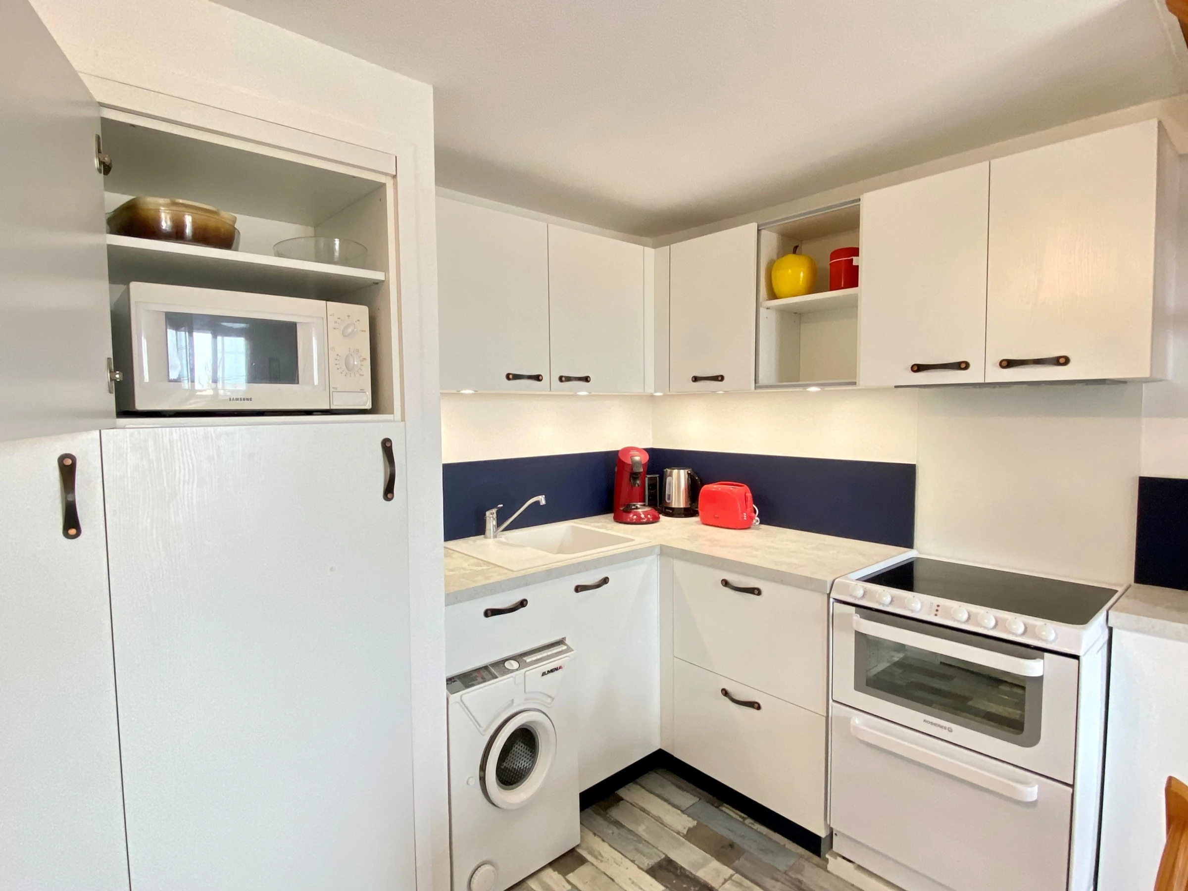 Idéalement situé dans une résidence en 1ère ligne (100m de la mer), appartement au 1er (et dernier) étage comprenant: une entrée par la loggia avec coin repas (table, chaises et plancha de table), pièce de vie avec coin repas (table + chaises), coin détente (canapé, TV) et cuisine équipée (grand réfrigérateur avec partie freezer, micro-ondes, lave-linge 2.5kg, lave-vaisselle 6 couverts, four, plaque vitro et hotte).