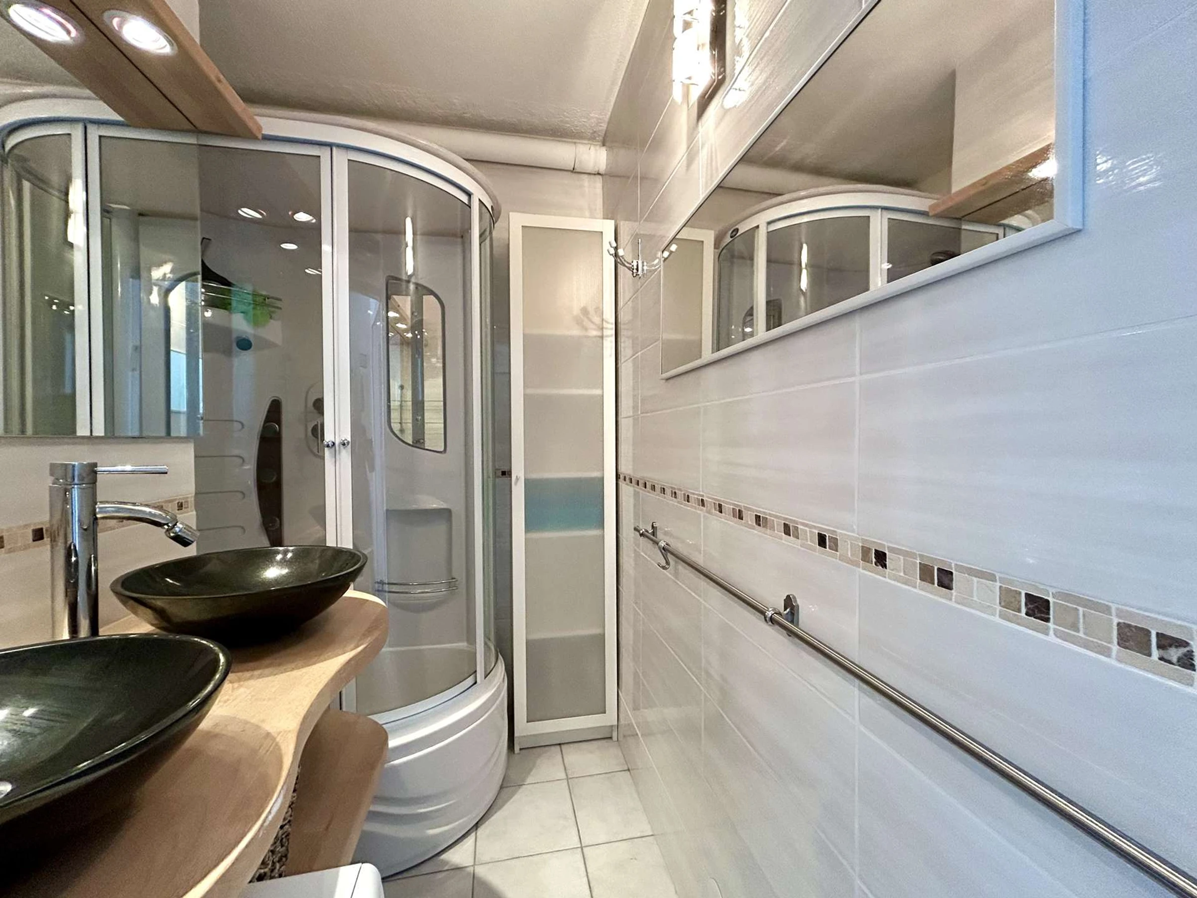 - d'une alcôve située dans l’entrée, équipée d’un lit double (140 × 190) et séparée de la cuisine par une porte.