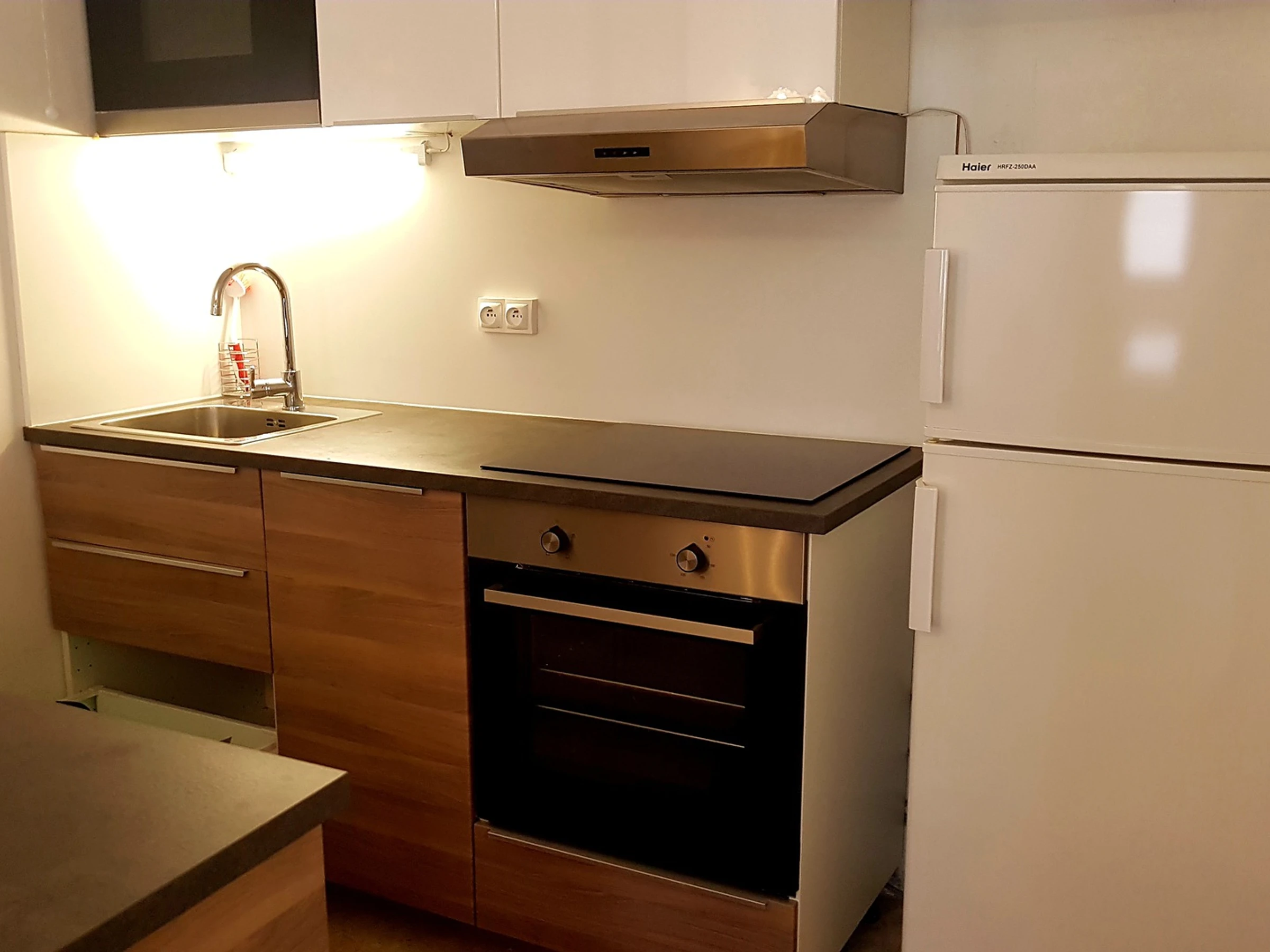 Ouvert sur la pièce à vivre avec 4 plaques vitrocéramiques, lave-vaisselle, four, micro-ondes, hotte, réfrigérateur et congélateur.