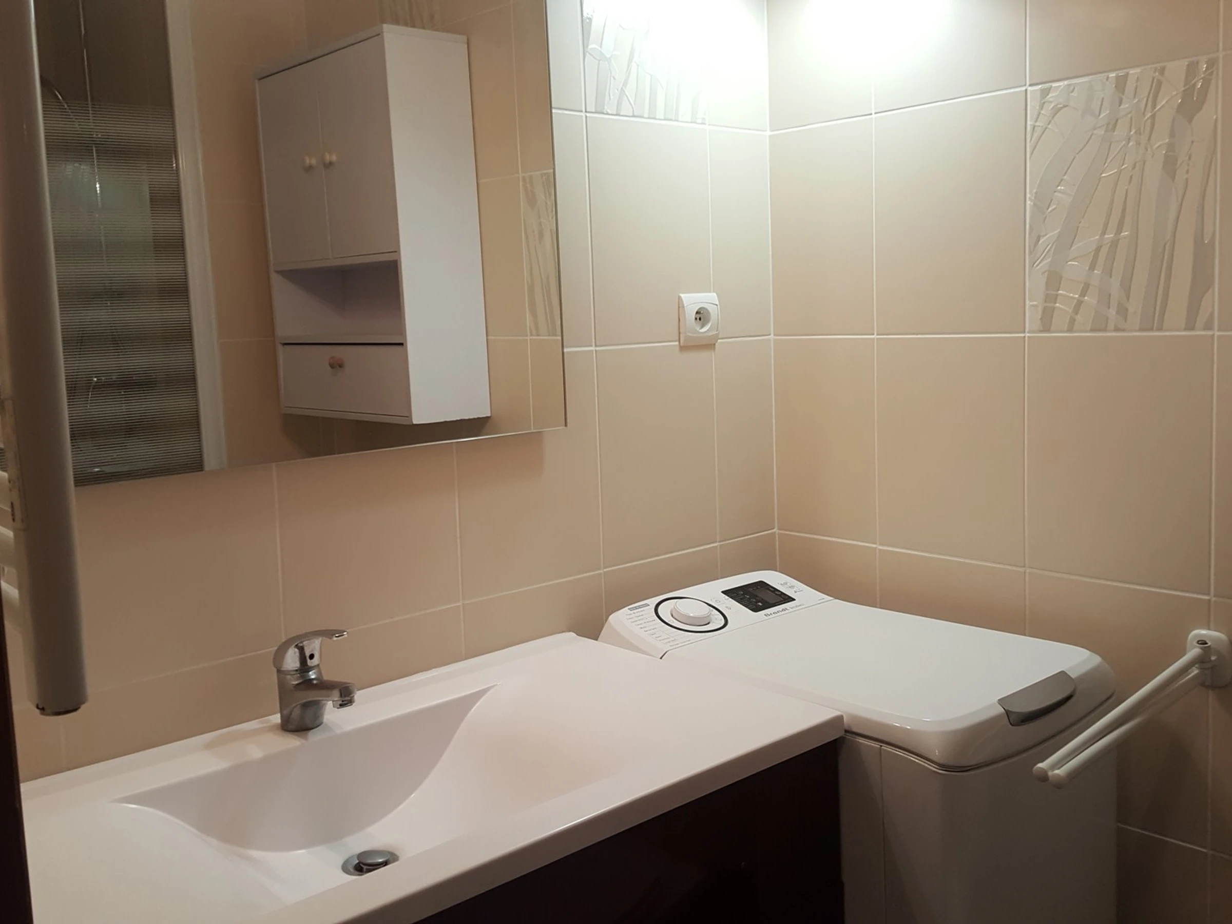 Avec une cabine de douche, lave-linge et toilettes.