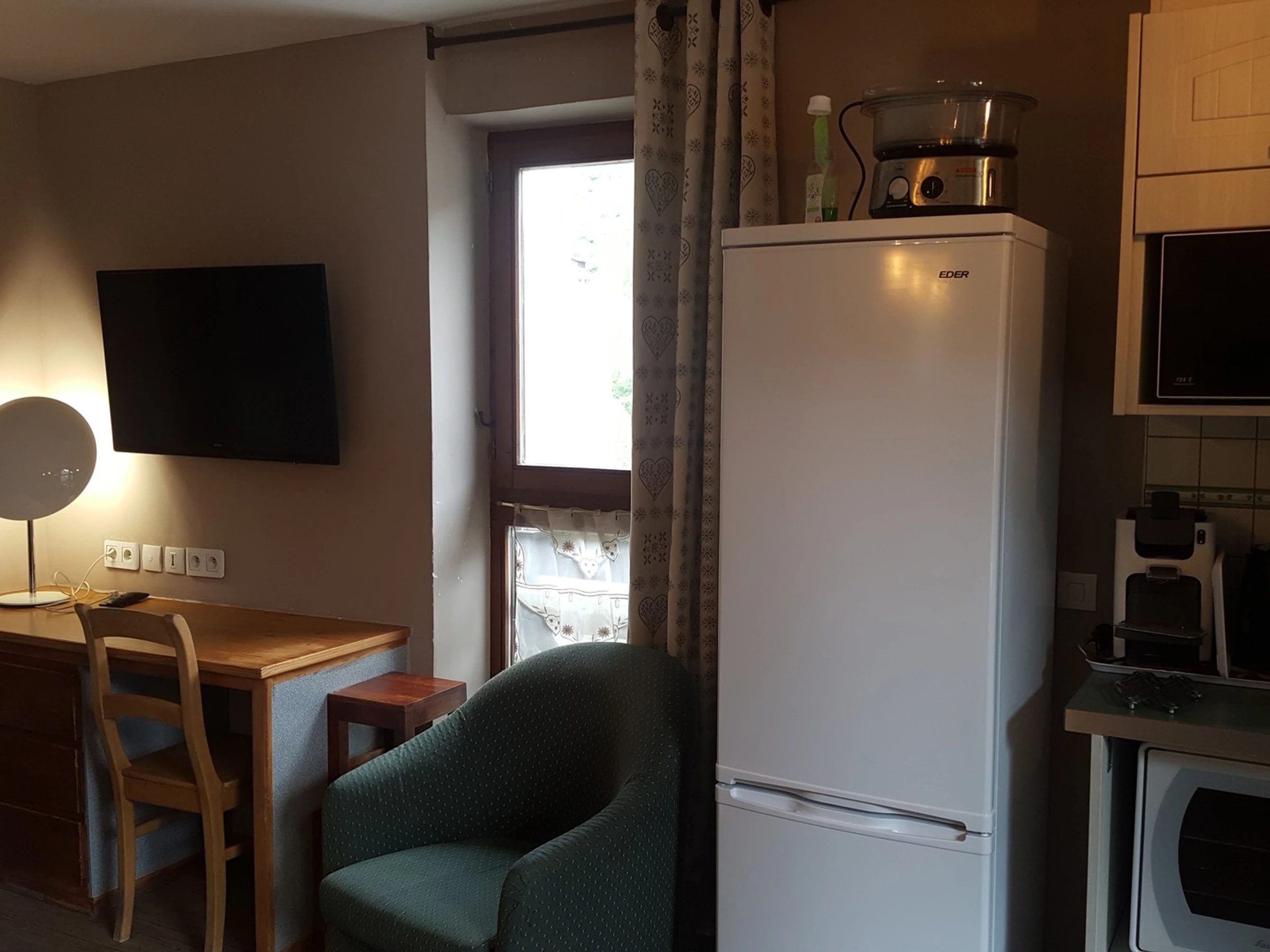 - Coin montagne (séparé du séjour) : un ensemble de lits superposés (2 personnes) avec télévision.