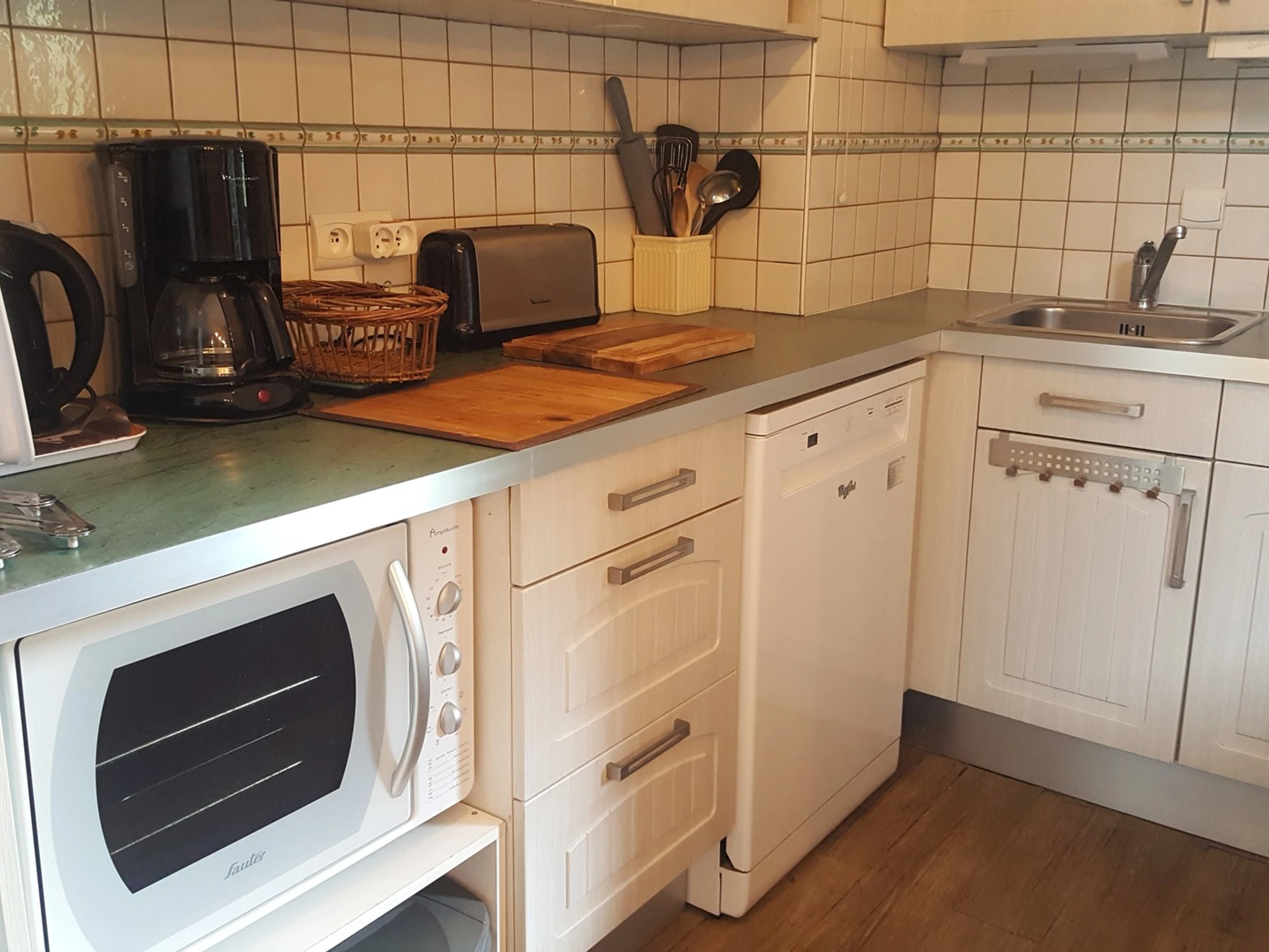 Espace cuisine en angle ouvert sur le séjour équipé avec plaques vitrocéramiques avec hotte aspirante, micro-ondes, four traditionnel, réfrigérateur avec congélateur, lave-vaisselle.