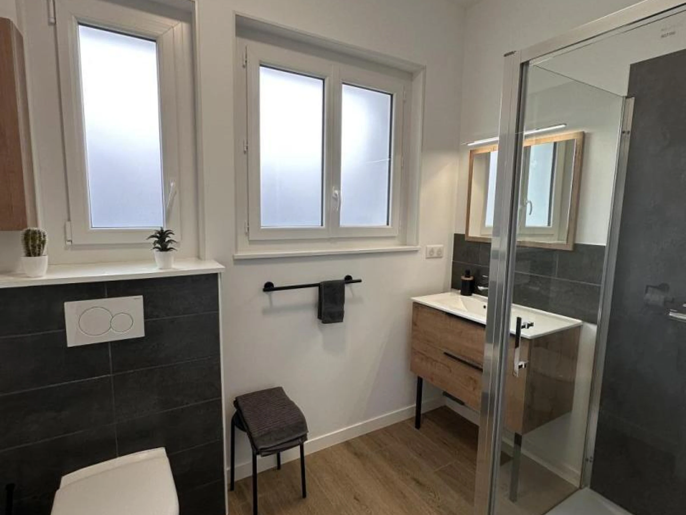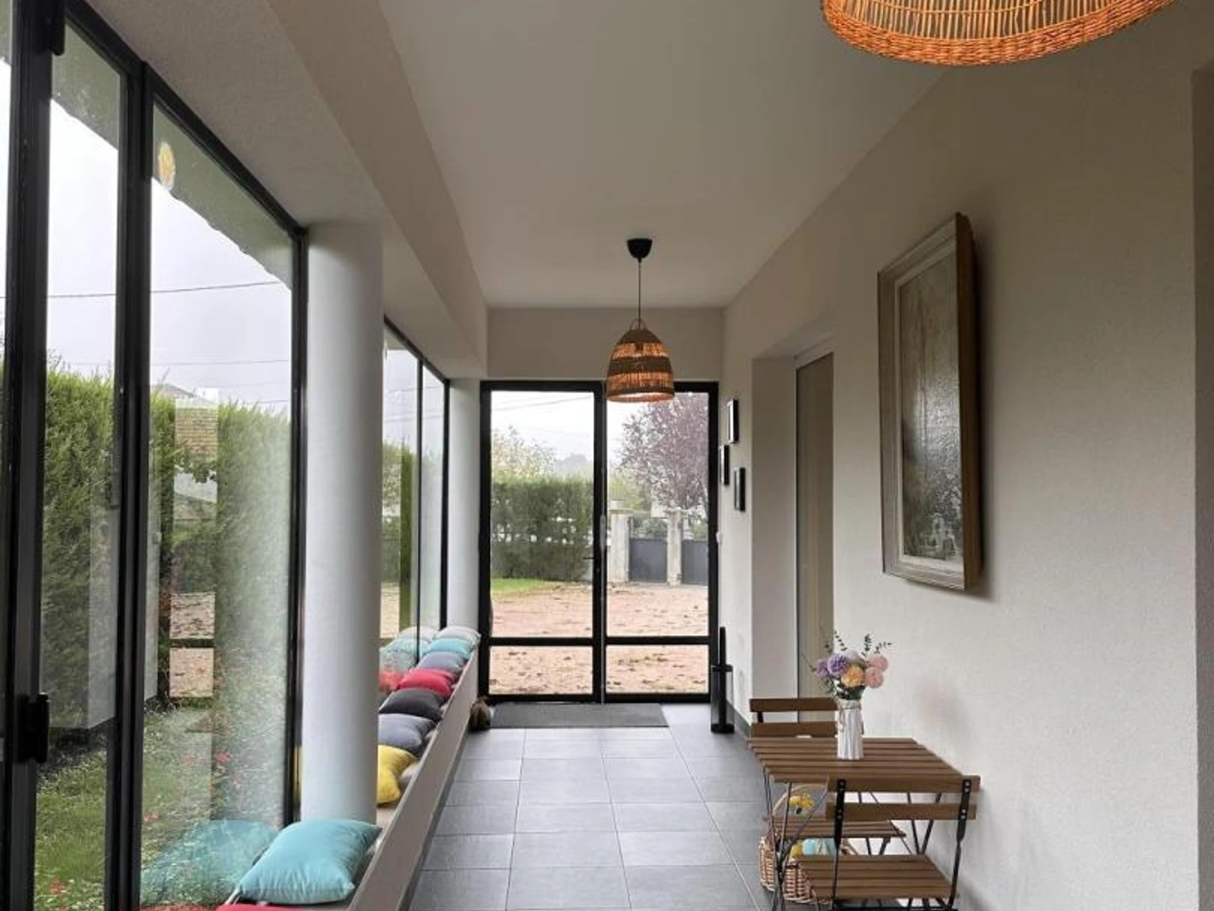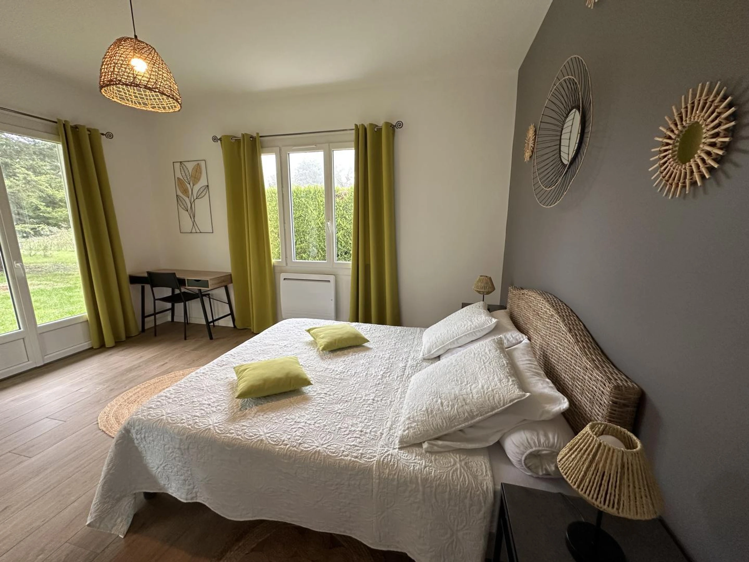 Entièrement rénové, ce pavillon invite à la détente, dans une ambiance contemporaine. Situé à 400 m du centre du village, et de ses commerces, dans une rue calme, ce gîte bénéficie d'un bel espace vert arboré (1000 m - mi-clos). L'entrée se fait dans la véranda, bien aménagée, où l'on peut même s'installer en belle saison pour un moment de lecture, pour y prendre des repas ou encore comme salle de jeux pour les plus petits. Le séjour, très lumineux intègre la cuisine bien équipée et le salon.