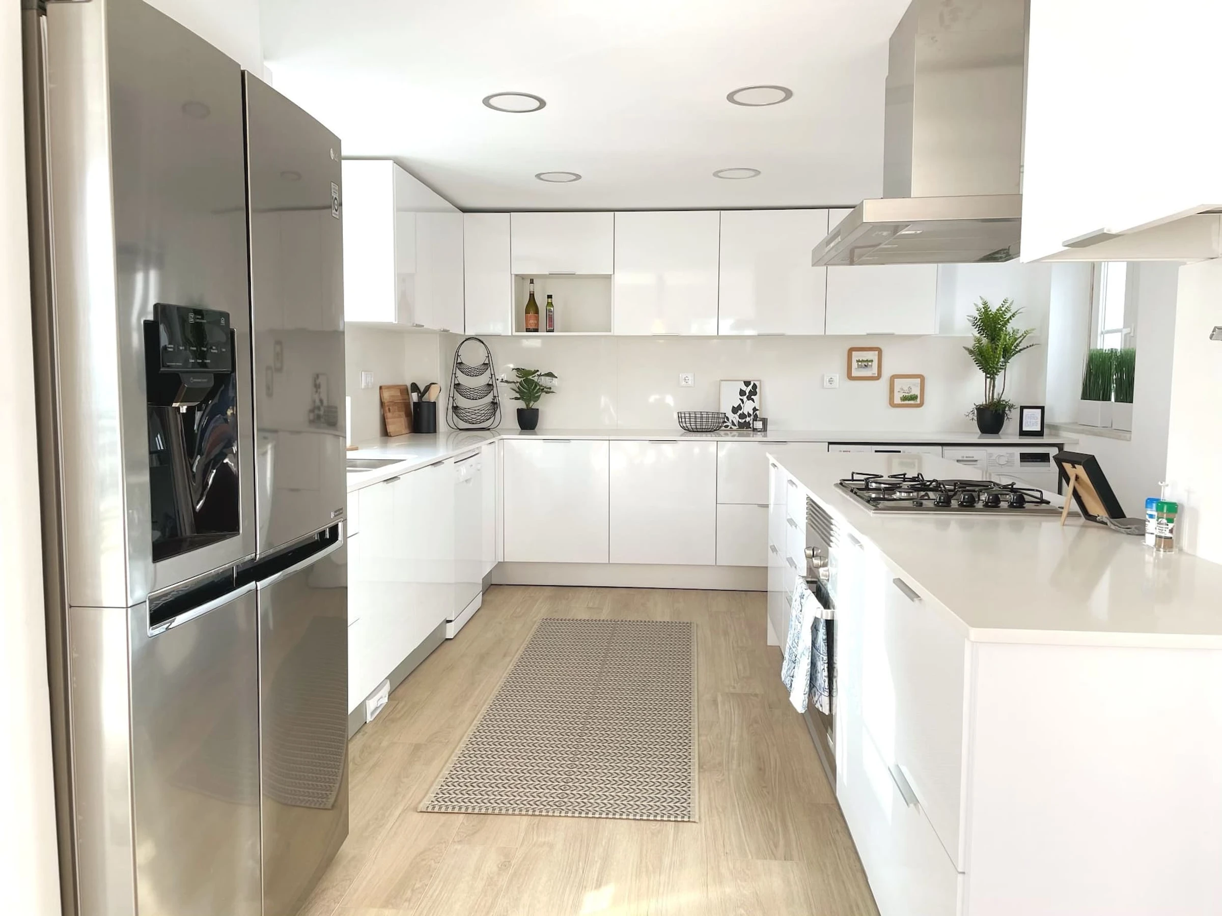 Dès l'entrée principale, vous êtes accueilli dans un intérieur éblouissant et lumineux, magnifiquement aménagé avec des meubles blancs et gris ornés de décorations murales et d'ornements contrastés. Dans cet espace ouvert ultra-moderne, un canapé confortable vous invite à vous asseoir et à vous détendre devant la télévision intelligente à écran plat, tandis qu'une élégante table de salle à manger en verre face aux grandes fenêtres françaises crée l'endroit parfait pour un dîner d'été. Le canapé se convertit en lit d'appoint pour les visiteurs occasionnels - idéal si vous souhaitez qu'un ami ou deux reste quelques nuits supplémentaires. La cuisine attenante est un véritable bonheur. Les plans de travail et les armoires blancs créent une expérience culinaire fabuleuse, complétés par une superbe sélection d'appareils et de gadgets, dont un réfrigérateur congélateur américain et un lave-vaisselle - parfait pour tout chef de vacances en herbe ! Pour plus de commodité, des toilettes pour invités sont également situées à ce niveau, ainsi qu'un lave-linge et un sèche-linge.
