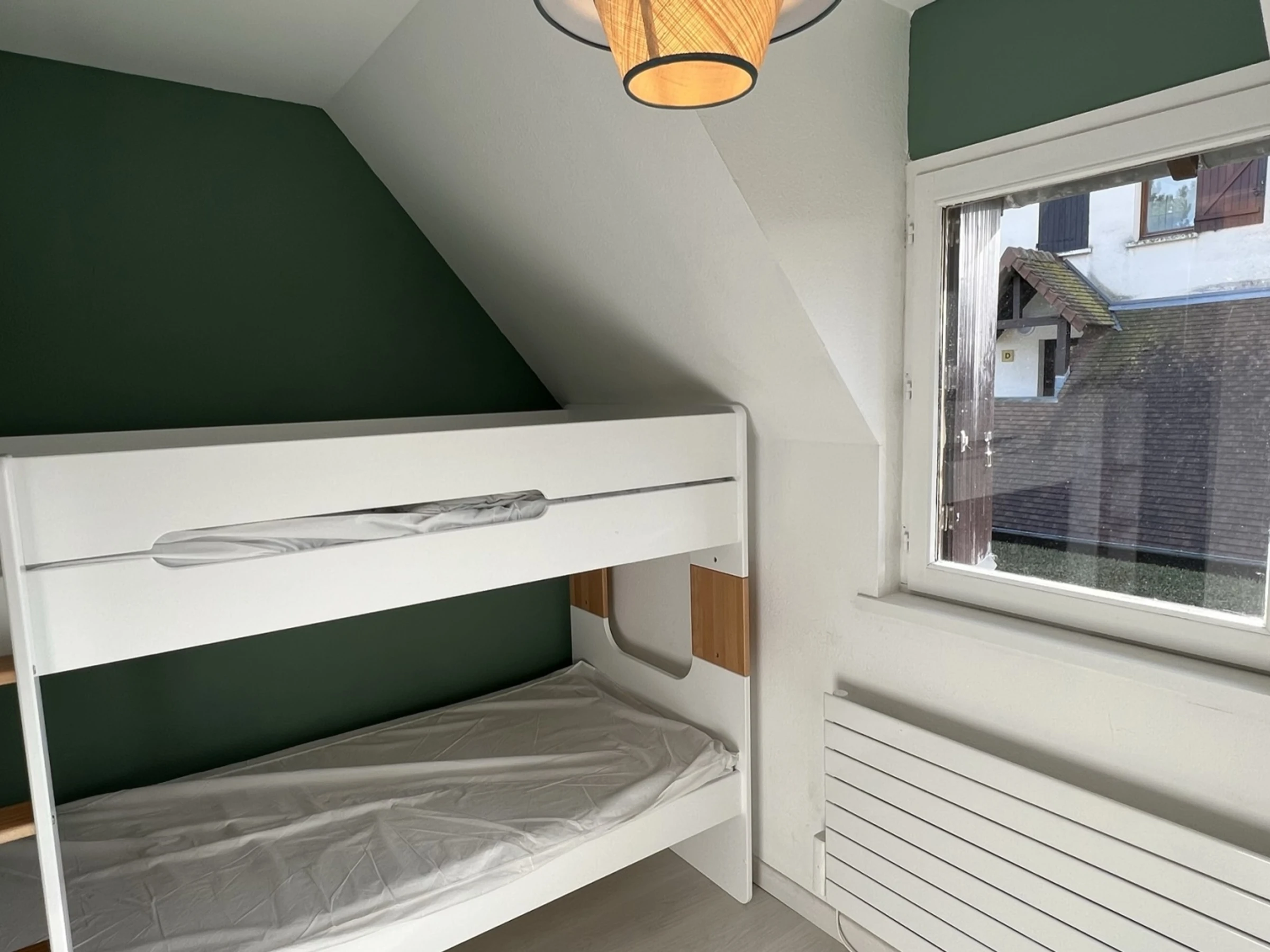Agréable Cottage de 3 pièces d'une capacité d'accueil de 6 personnes et d'une superficie de 43m² environ avec une terrasse et un grand jardin privatif de 260m² exposé Sud-est. Le cottage comprend : un séjour/salon (avec une TV et un canapé convertible de 140x190) avec une cuisine ouverte (un lave-vaisselle, un lave linge, un réfrigérateur et 2 plaques vitrocéramiques). A l'étage, une pièce palière desservant la première chambre (avec un lit de 160x200), puis la seconde chambre (avec 2 lits superposés de 90x190), la salle de bains (avec douche) et un wc indépendant. Le cottage dispose d'une place de parking privative numérotée et d'un accès Internet gratuit. Les animaux de compagnie ne sont pas acceptés dans cette location.