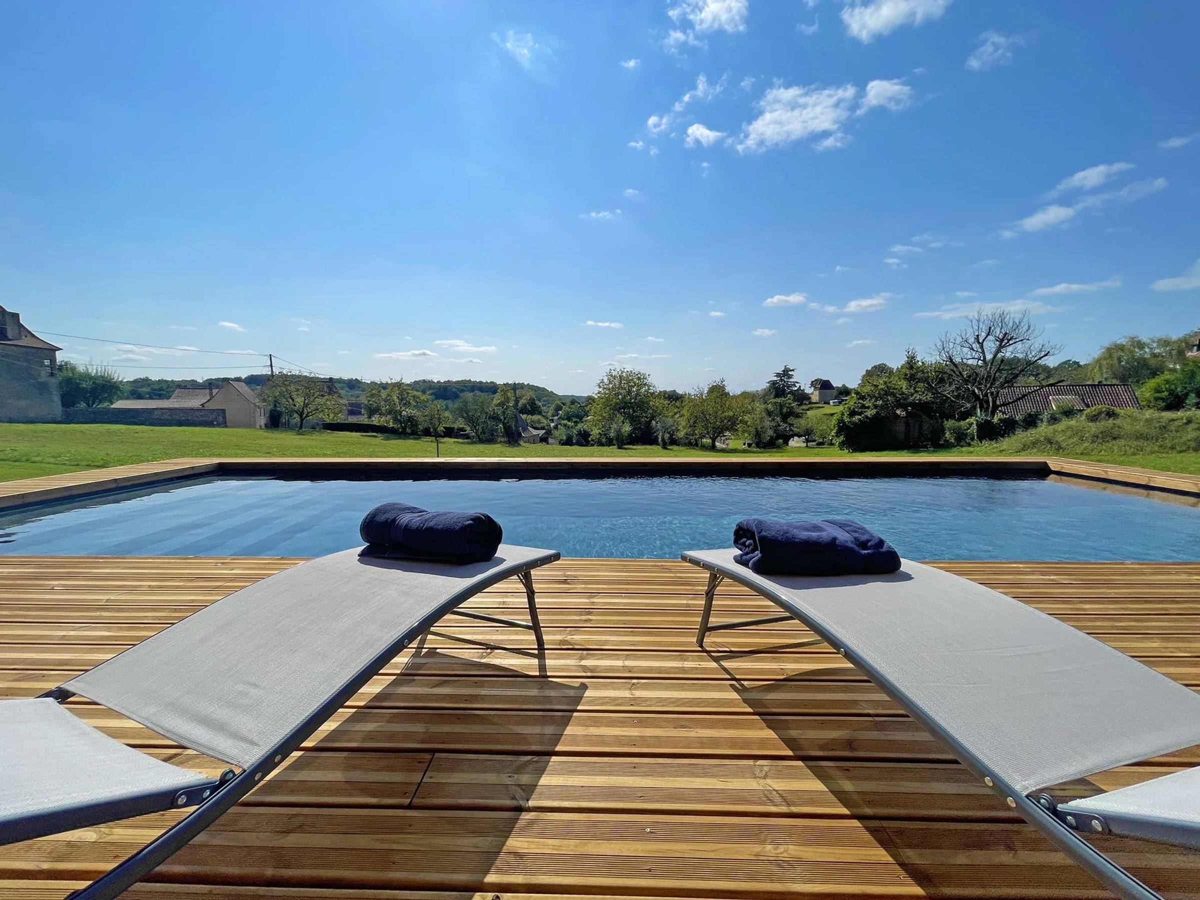 La piscine est entourée d’un deck en bois et bordée de gabions en pierre — un mélange de moderne et d’authentique. Elle est protégée par un volet roulant de sécurité. Transats, vue dégagée sur les champs et le village de Calès. Sous le grand arbre, une table en fer forgé attend vos dîners d’été. Le grand terrain vous assure une parfaite intimité. Un salon lumineux avec des canapés confortables. Une cuisine équipée ouverte sur le jardin.