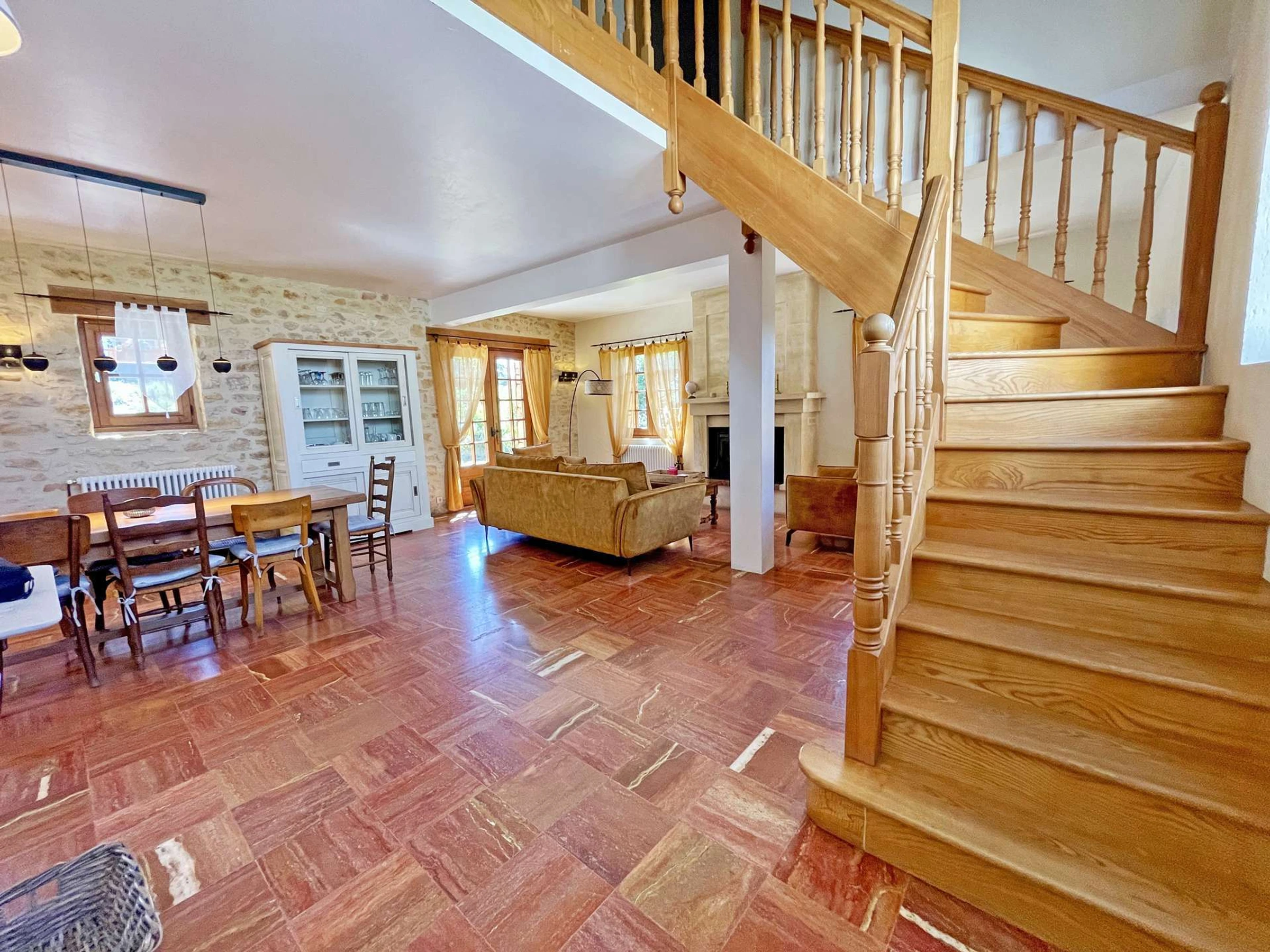 Au rez-de-chaussée, la porte d'entrée en bois massif s’ouvre sur la pièce à vivre et la cuisine ouverte, munie d’une porte fenêtre donnant sur la terrasse, le jardin et la piscine dotée de bains de soleil et parasols.