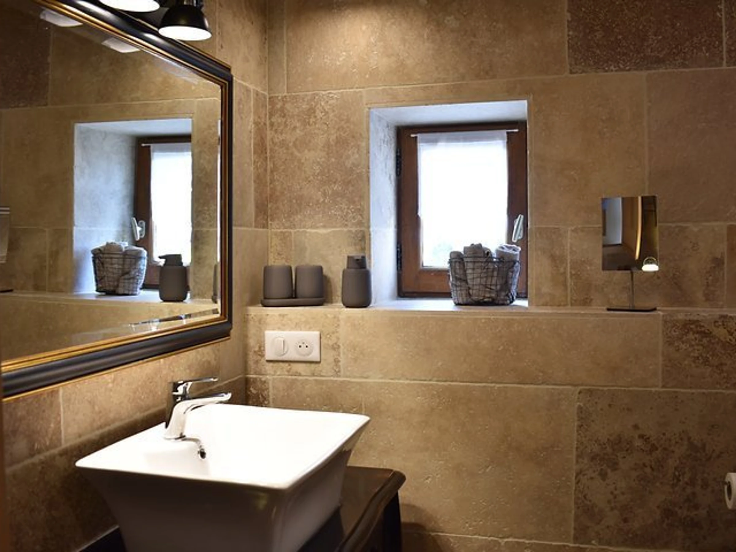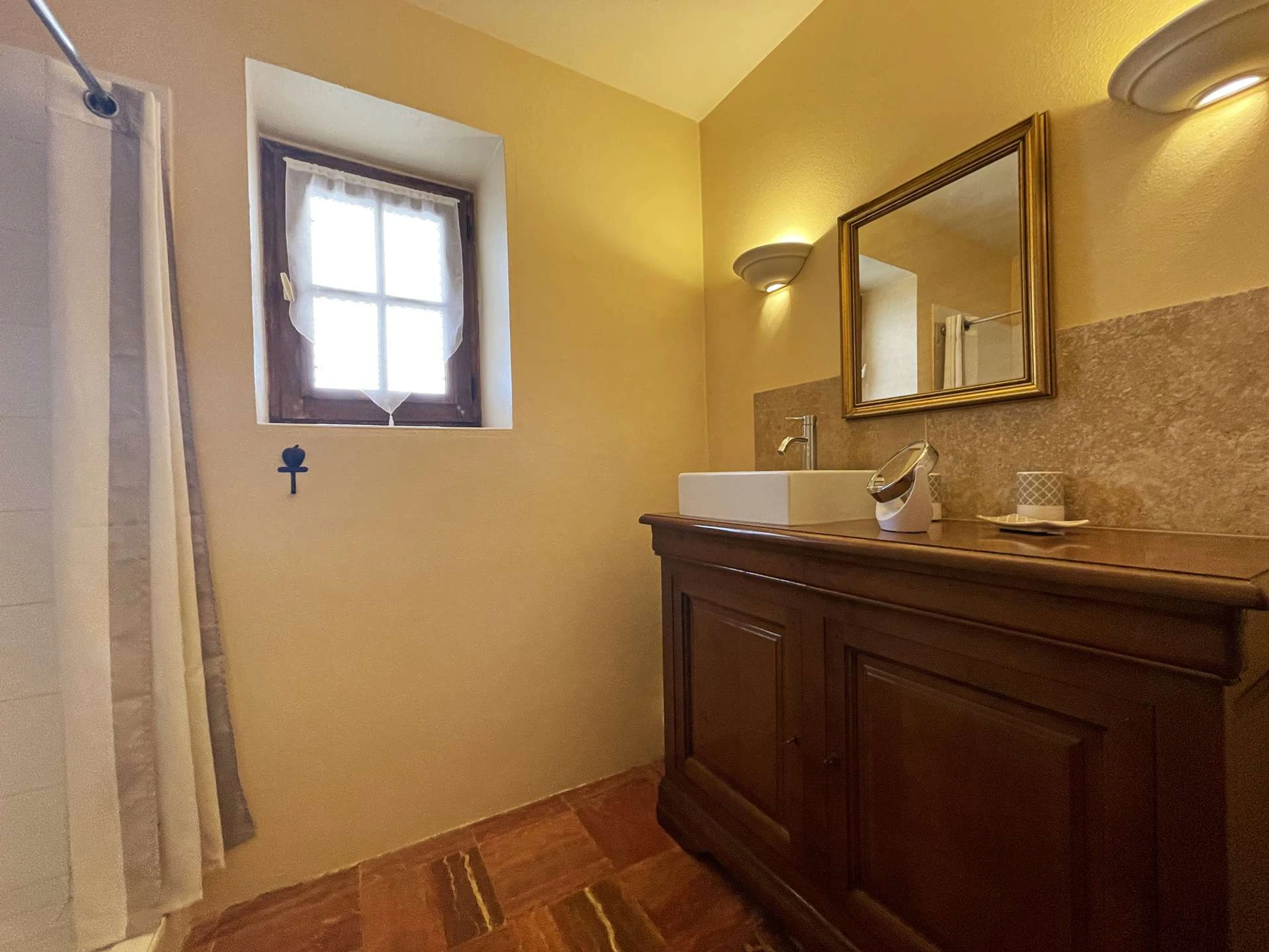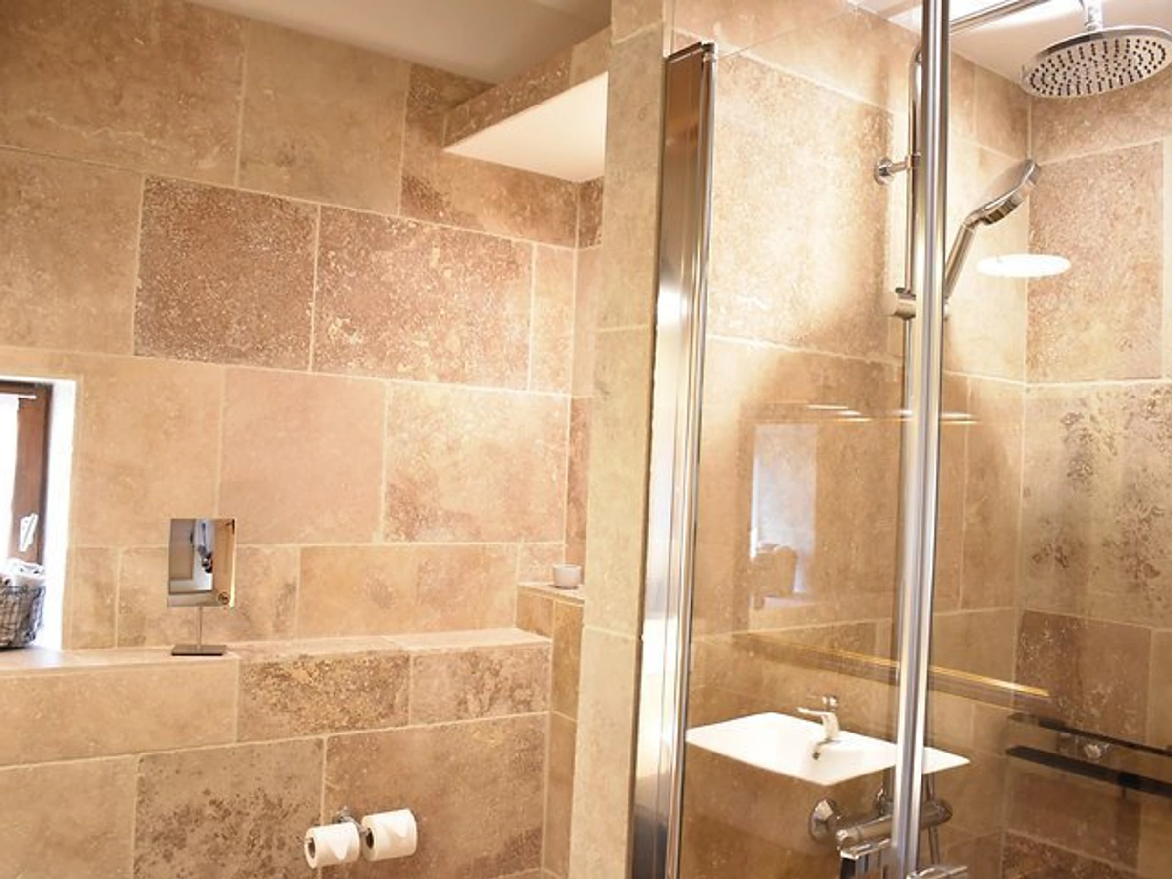 À ce niveau, se trouve également une salle de douche comprenant une grande douche à l'italienne, des toilettes et un lavabo.