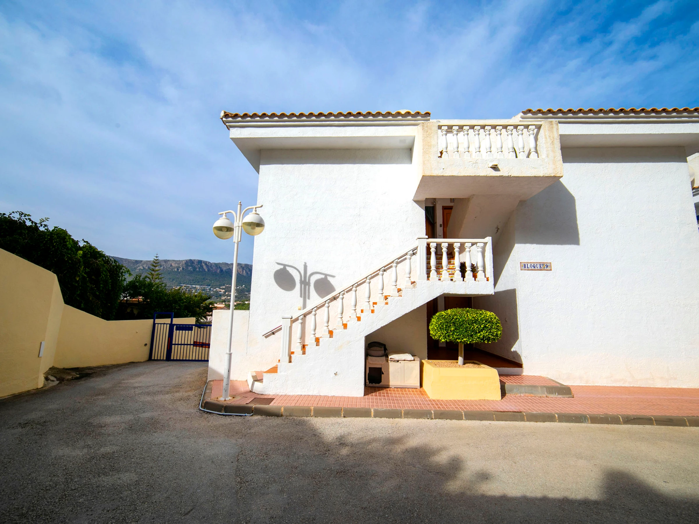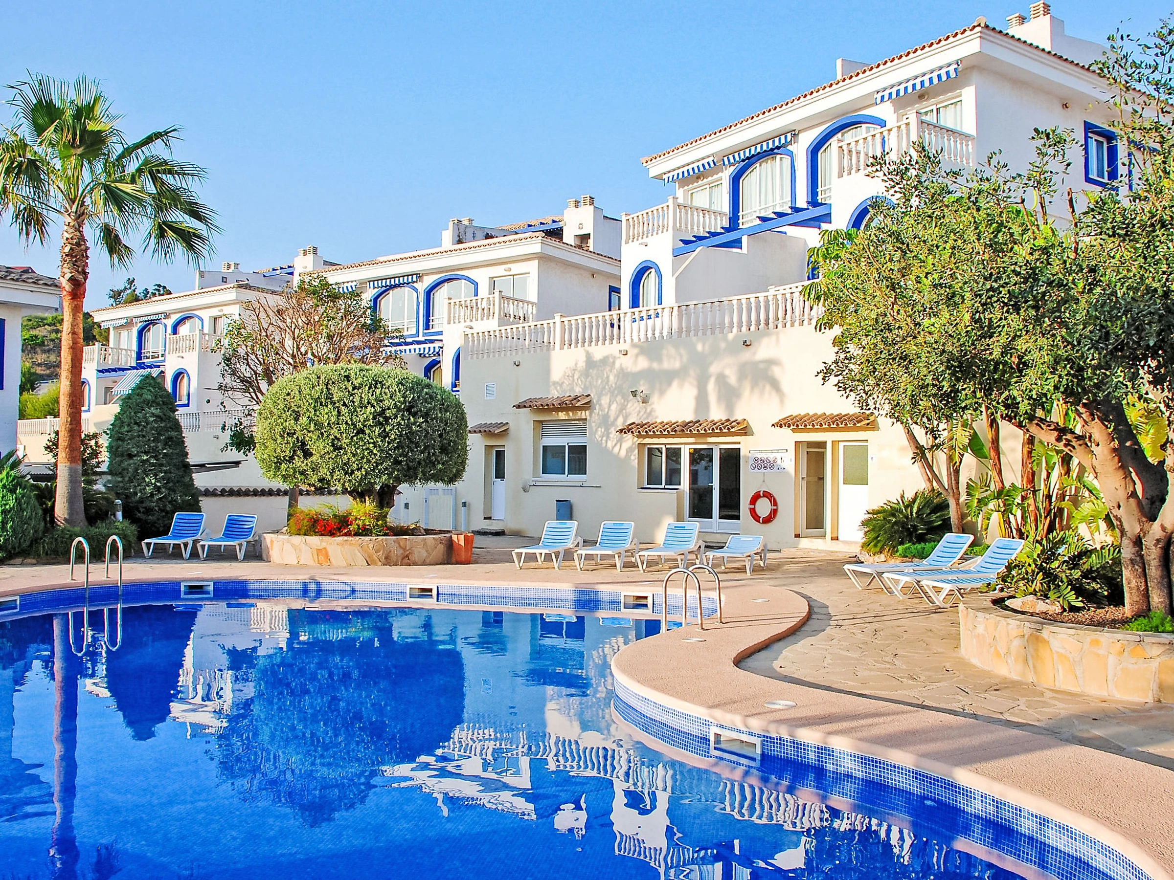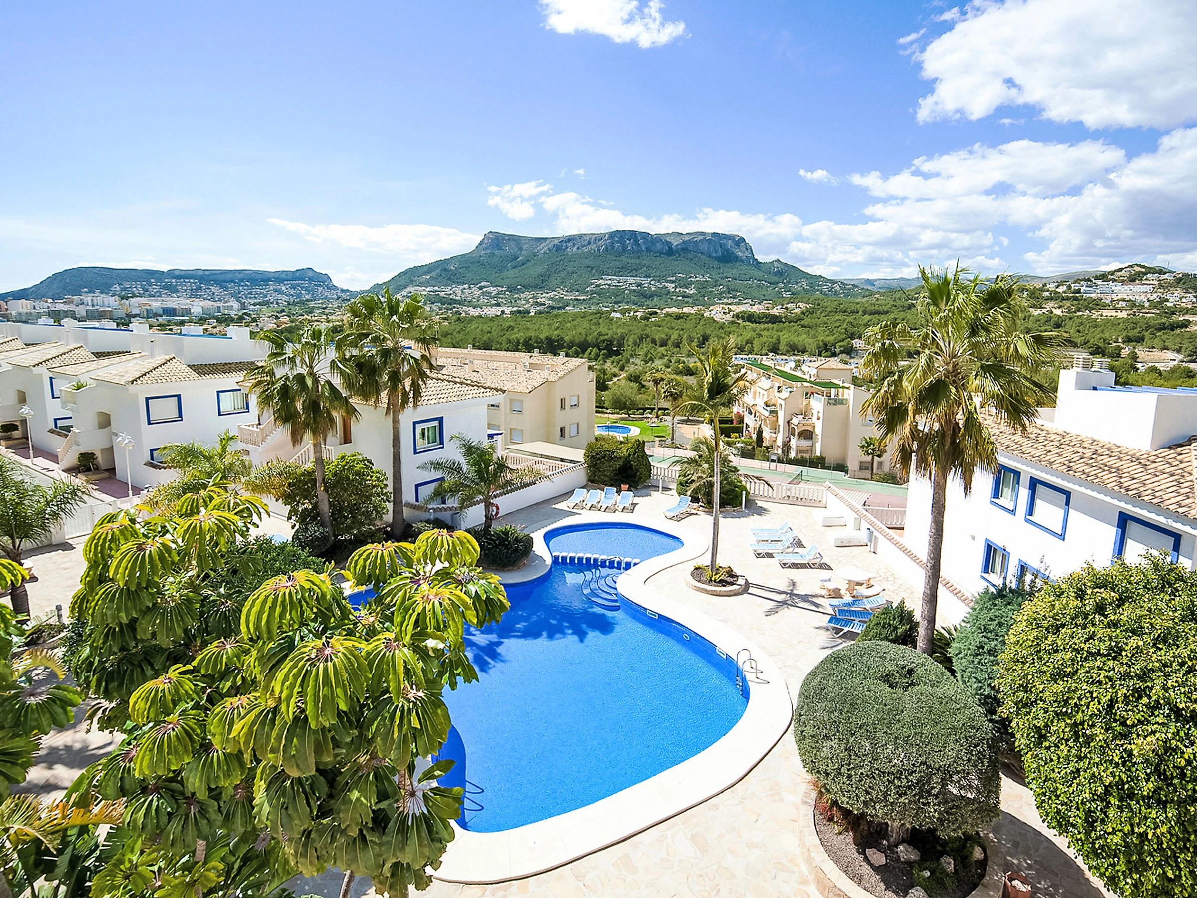 Casanova: Beau complexe de vacances "Pueblo Casanova". À 1.7 km du centre de Calpe, situation tranquille, ensoleillée, à 1.9 km de la mer. En commun: terrain (clôturé), jardin, piscine (15 x 12 m, disponibilité saisonnière: [hidden] - [hidden] avec systeme d'électolyseur au sel. Piscine de forme irrégulière. Bassin pour les enfants, terrasse. Possibilité de chauffage uniquement du [hidden] - [hidden] Supermarché 1.2 km, restaurant 1.4 km, arrêt de bus 450 m, plage de sable 1.9 km, piscine couverte 1.5 km. Tennis 1.4 km. Veuillez noter: D’autres appartements sont également proposés à la location dans cette maison de vacances. Chaises longues et douche/WC proches de la piscine.