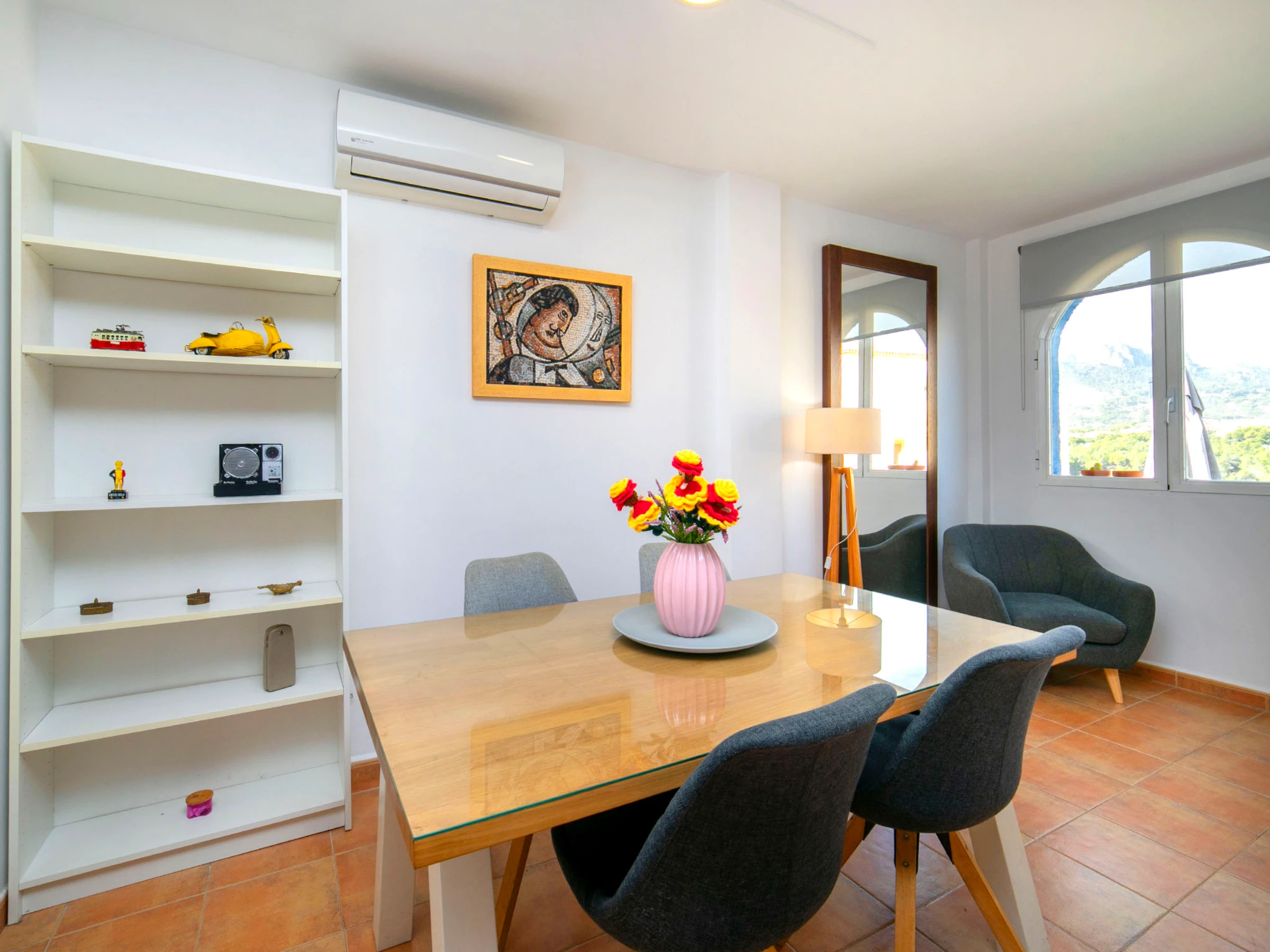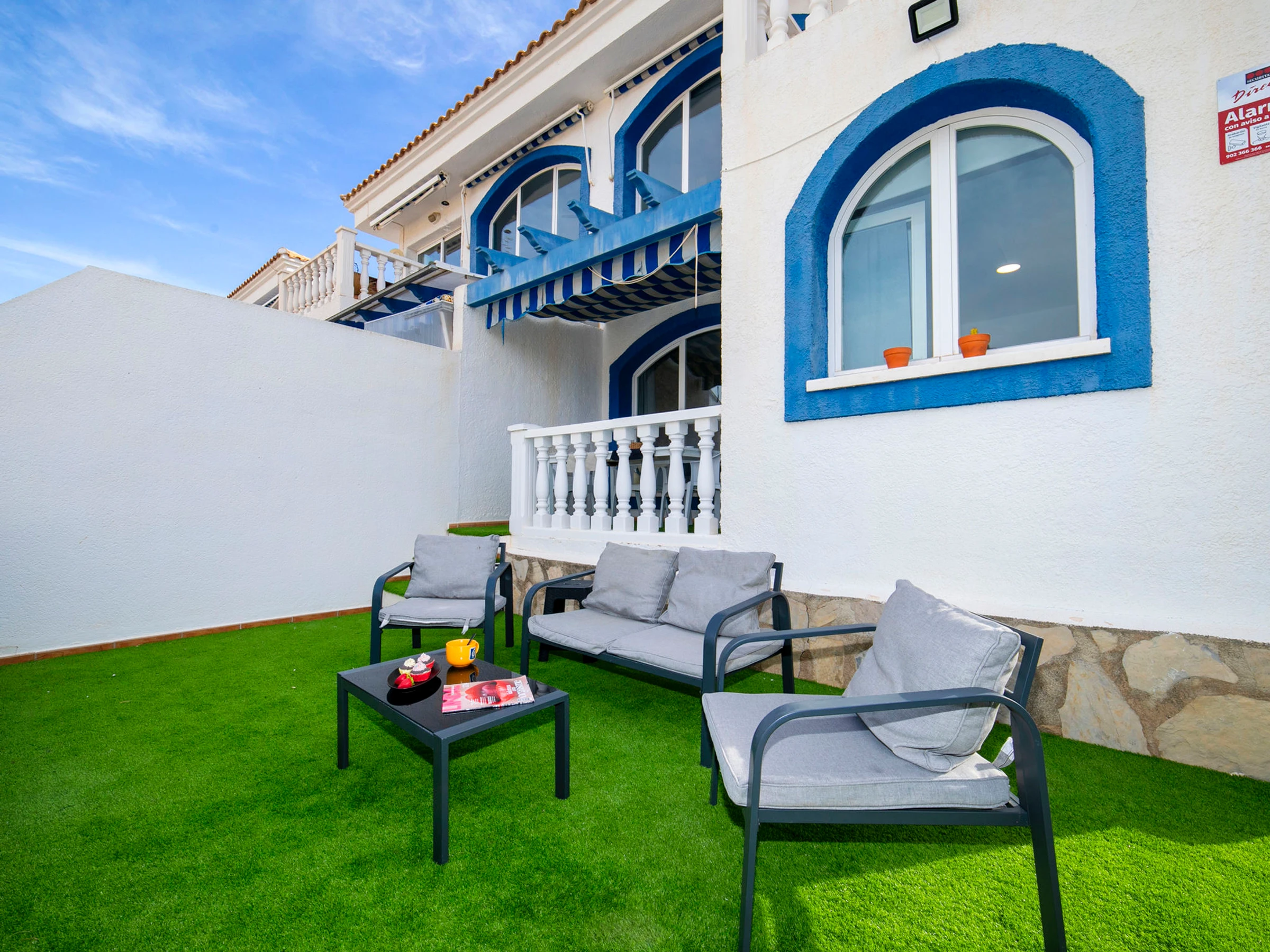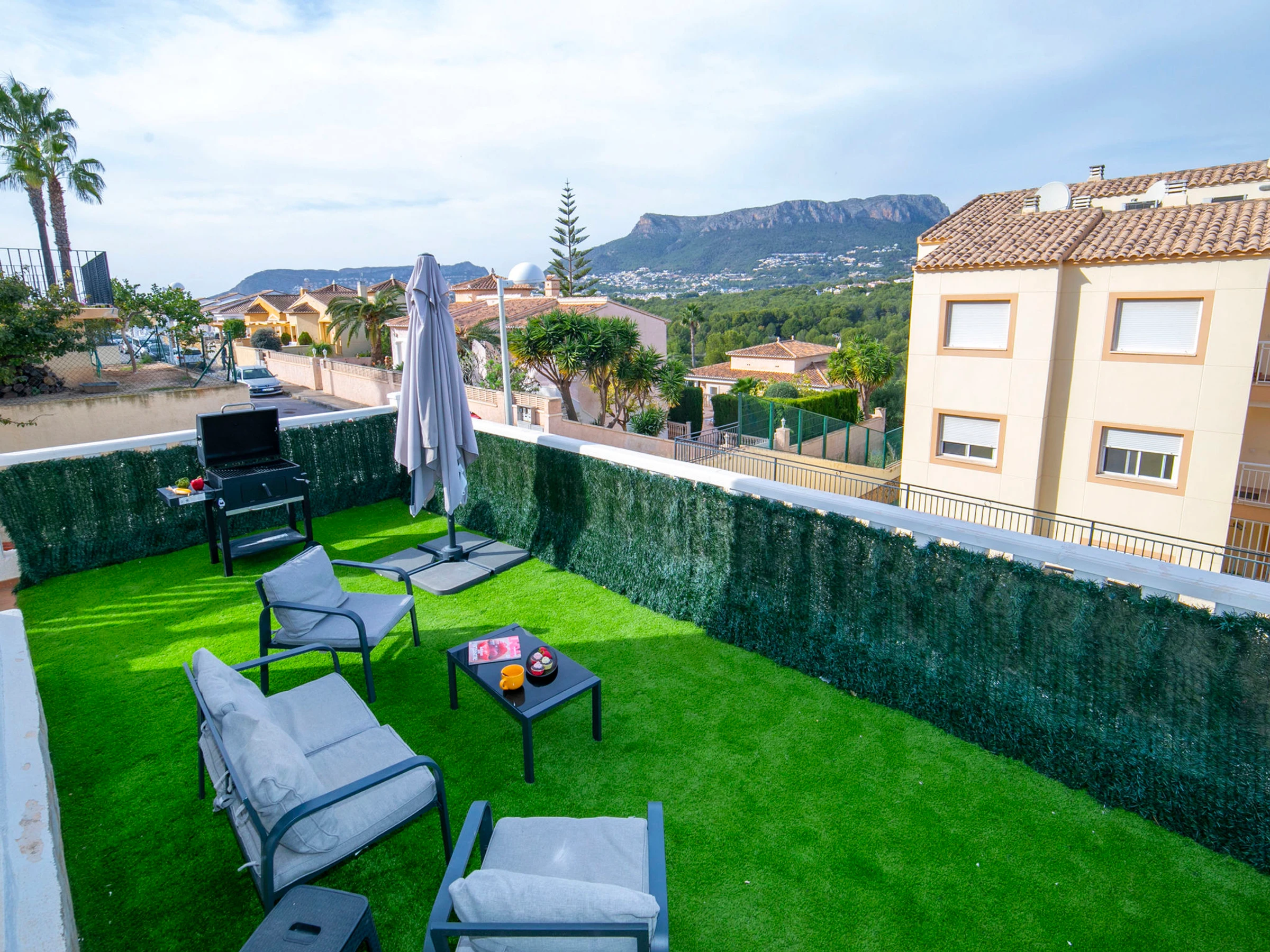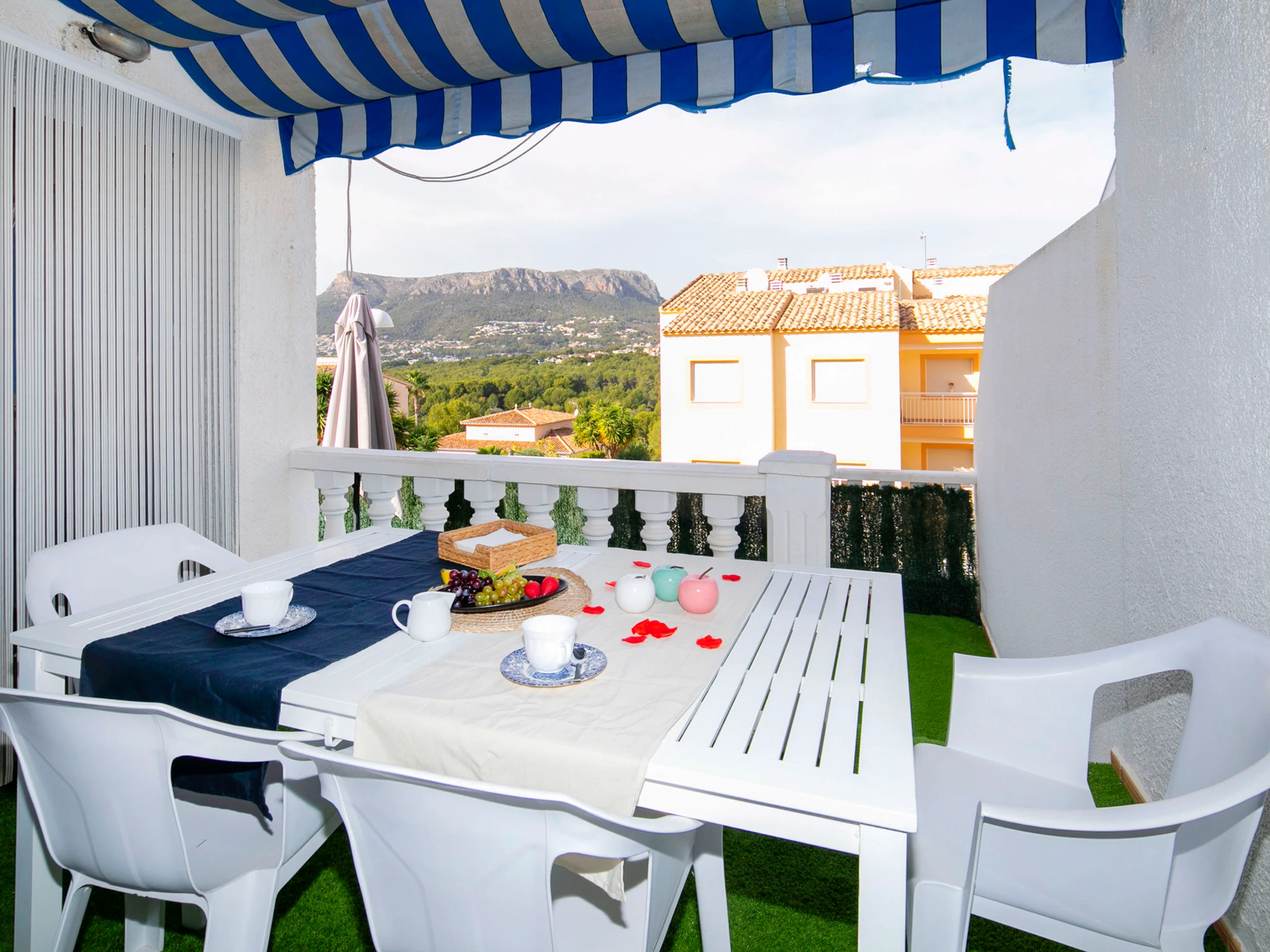 Casanova: Beau complexe de vacances "Pueblo Casanova". À 1.7 km du centre de Calpe, situation tranquille, ensoleillée, à 1.9 km de la mer. En commun: terrain (clôturé), jardin, piscine (15 x 12 m, disponibilité saisonnière: [hidden] - [hidden] avec systeme d'électolyseur au sel. Piscine de forme irrégulière. Bassin pour les enfants, terrasse. Possibilité de chauffage uniquement du [hidden] - [hidden] Supermarché 1.2 km, restaurant 1.4 km, arrêt de bus 450 m, plage de sable 1.9 km, piscine couverte 1.5 km. Tennis 1.4 km. Veuillez noter: D’autres appartements sont également proposés à la location dans cette maison de vacances. Chaises longues et douche/WC proches de la piscine.