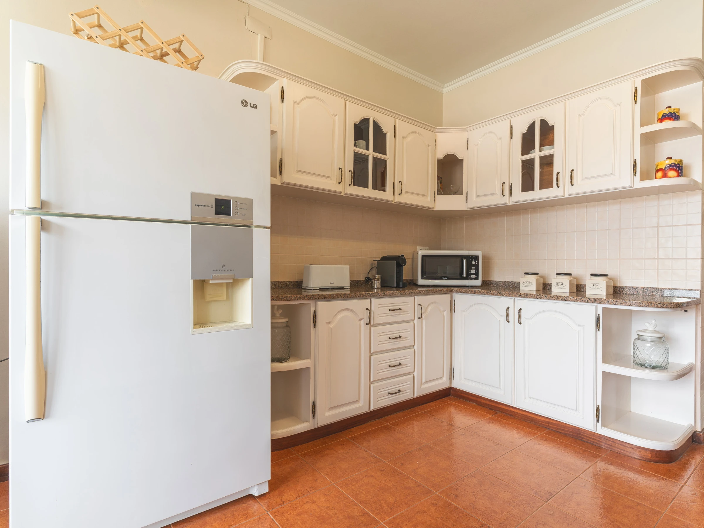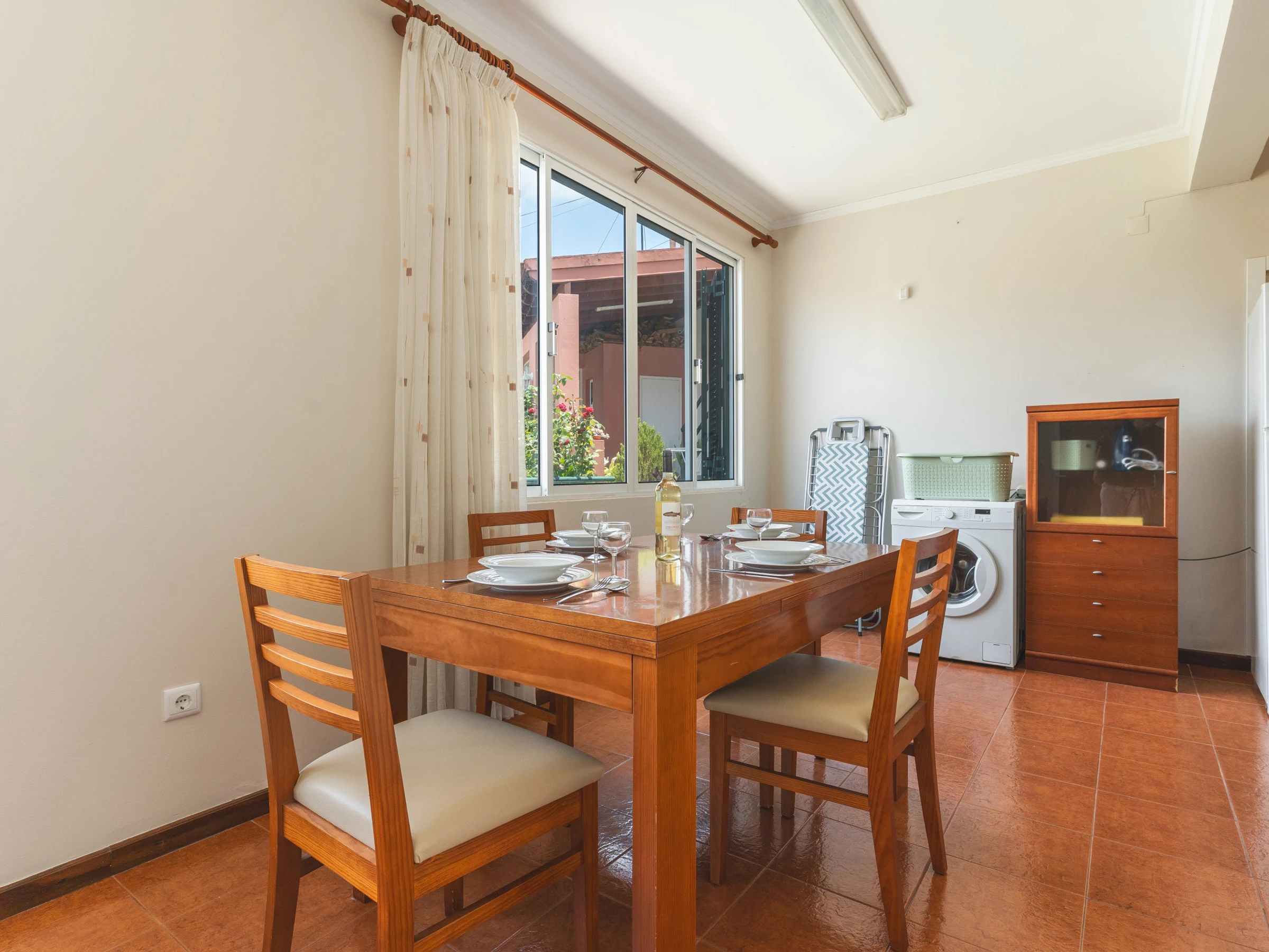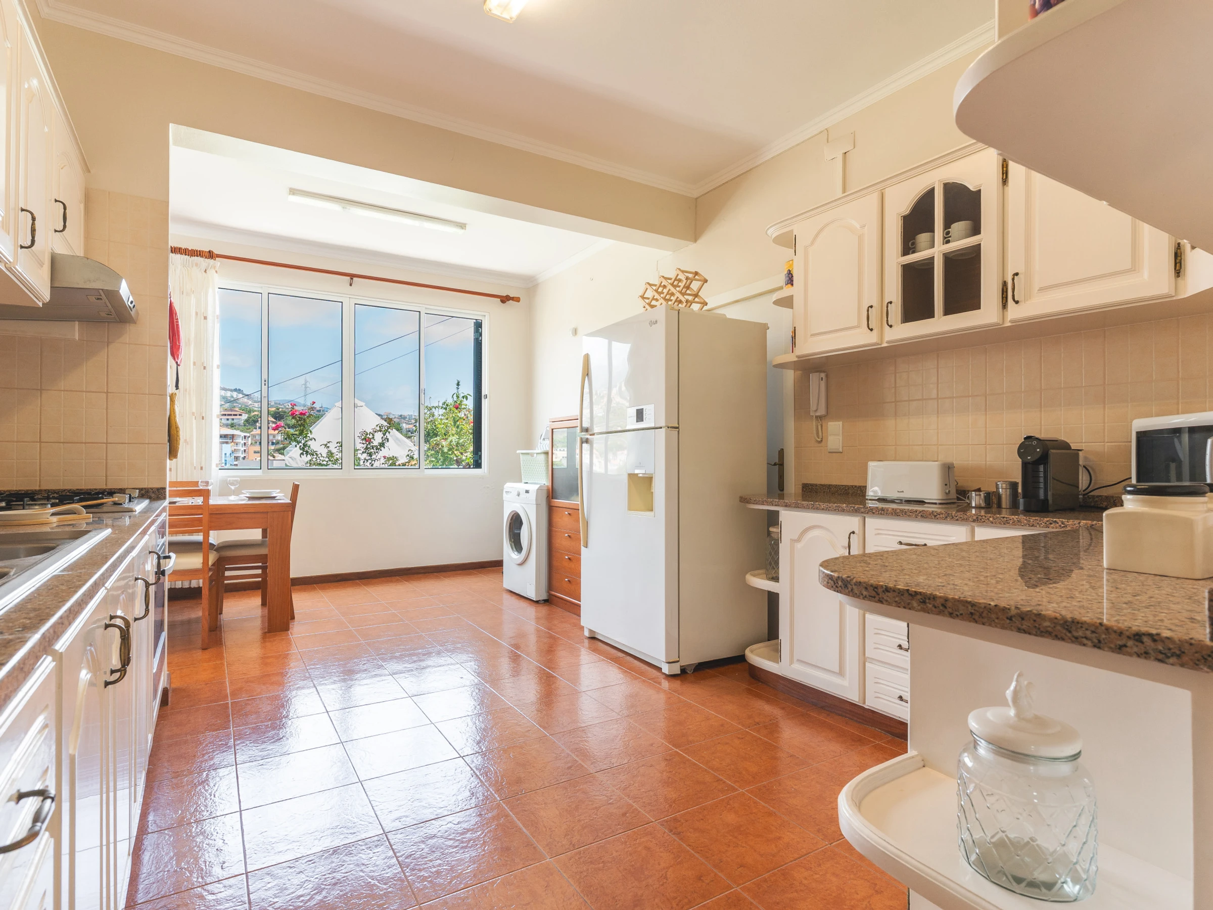 La cuisine est entièrement équipée : réfrigérateur, congélateur, four, micro-ondes, plaques de cuisson, couverts, assiettes et ustensiles de base. Une machine à laver, un sèche-cheveux et une Smart TV avec box sont également disponibles.