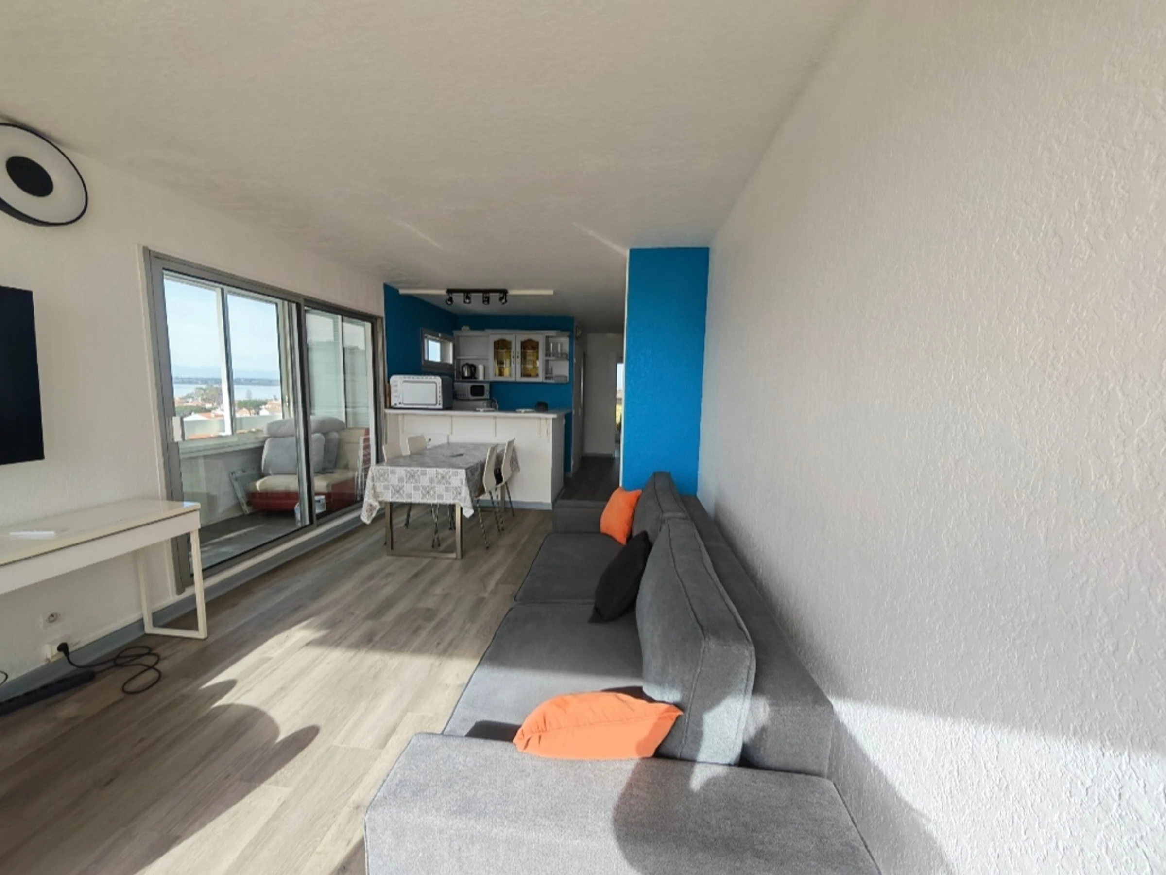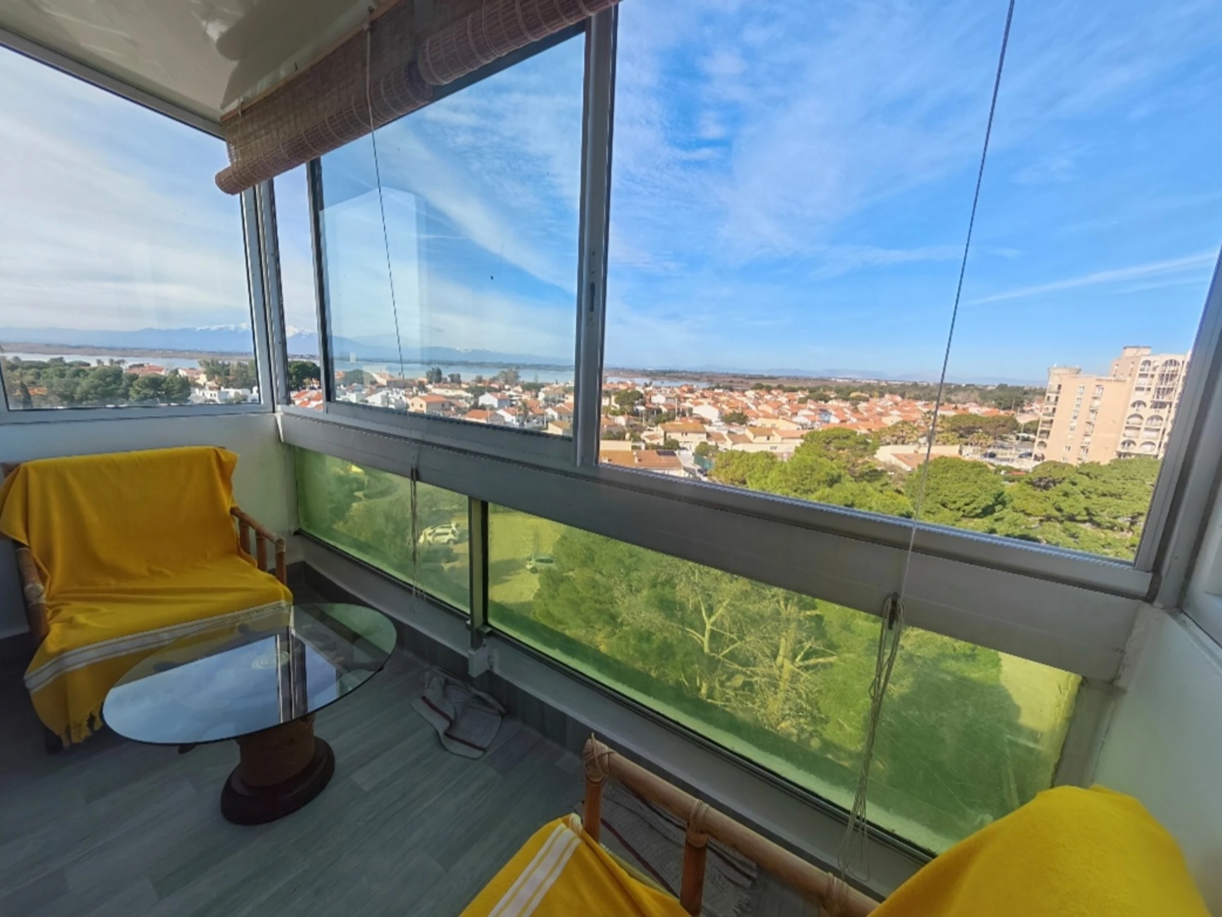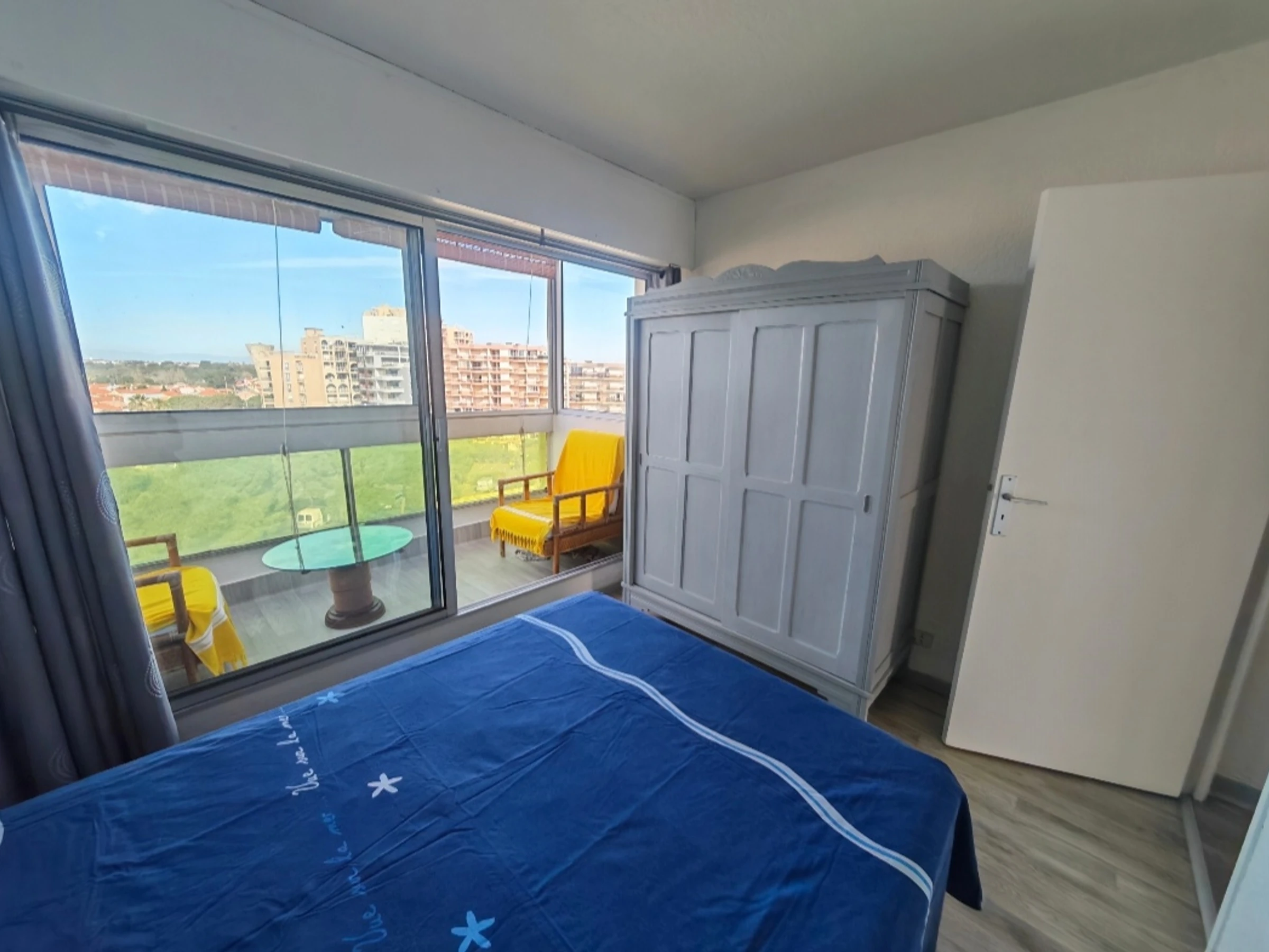 - Coin nuit: 1 chambre cosy avec un lit 140 et placard donnant accès à une loggia et une vue imprenable sur le Canigou et l'étang de Canet
