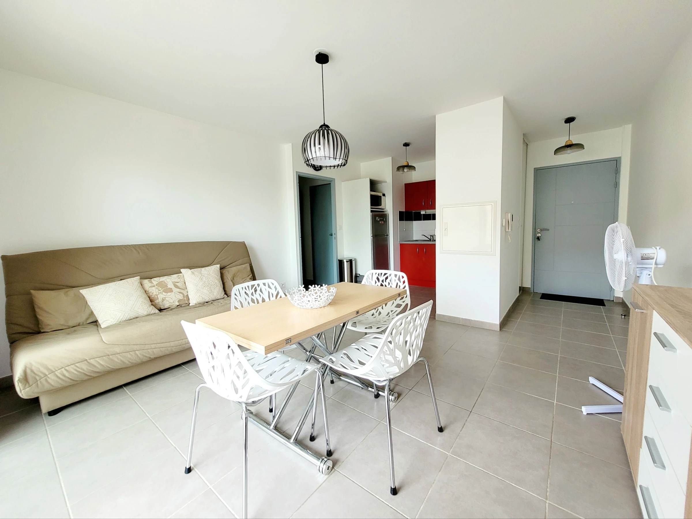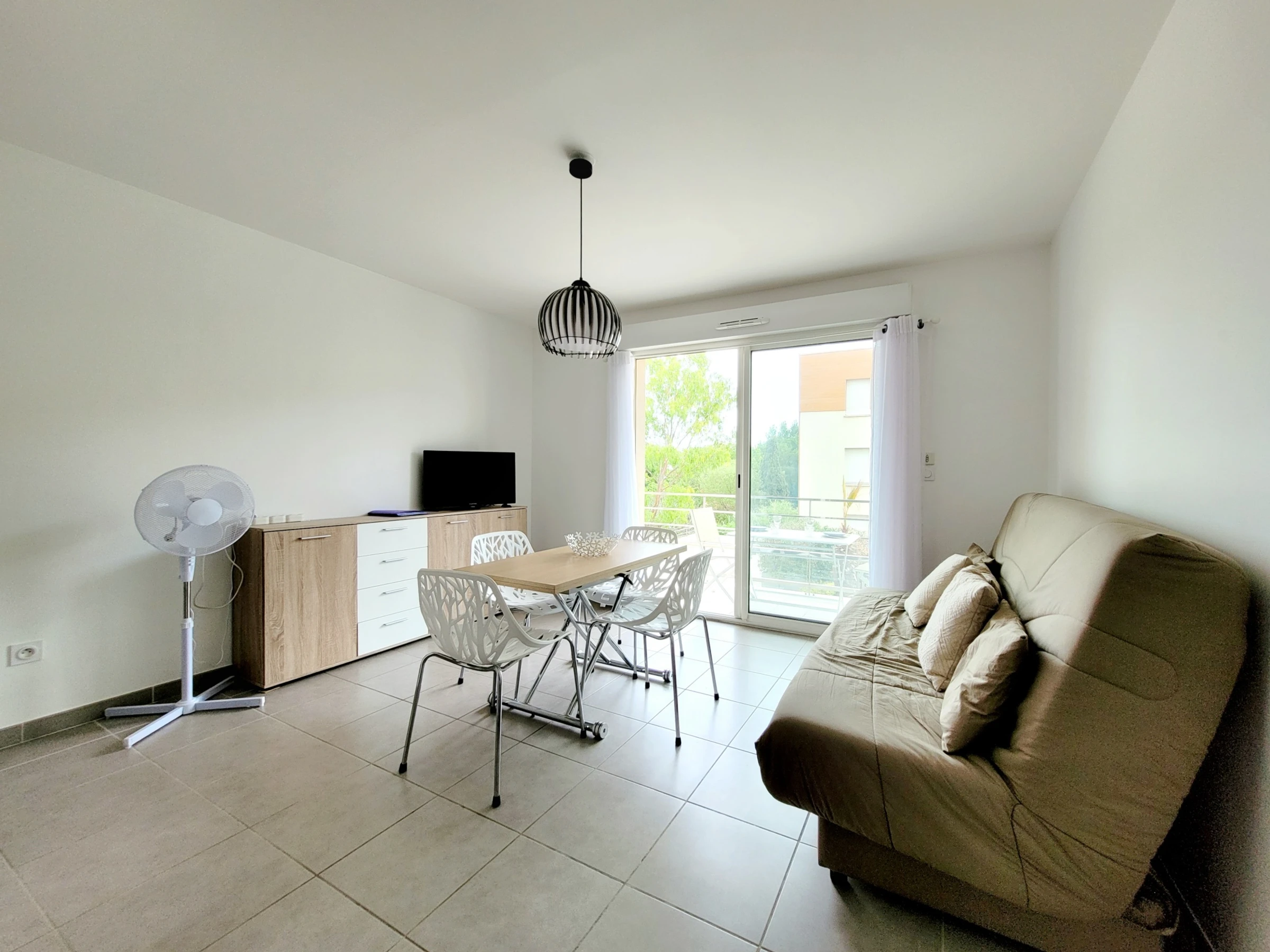 Grand séjour lumineux ( Clic-clac 140) accès terrasse. 1 chambre ( lit 160), salle d'eau, WC.