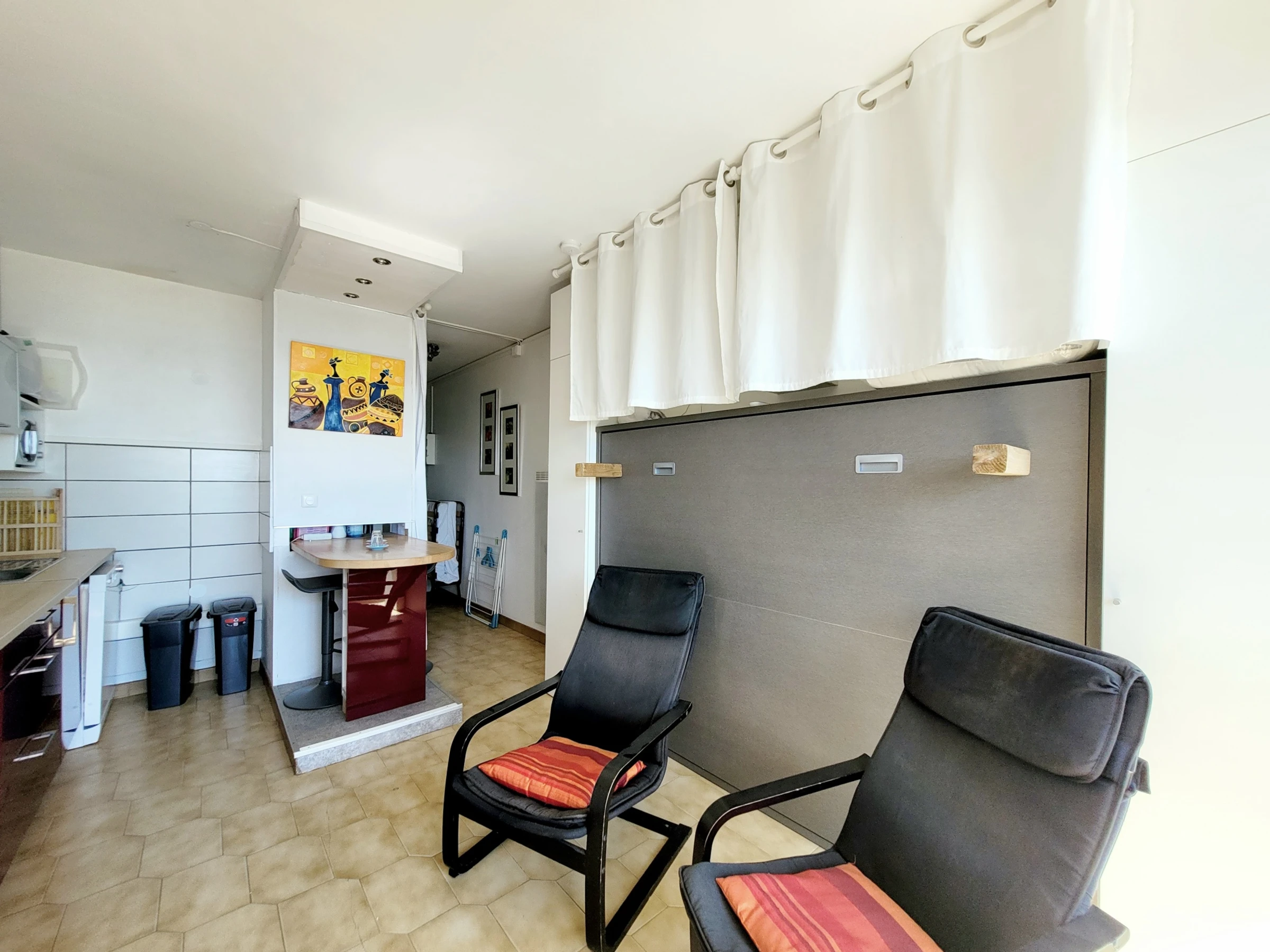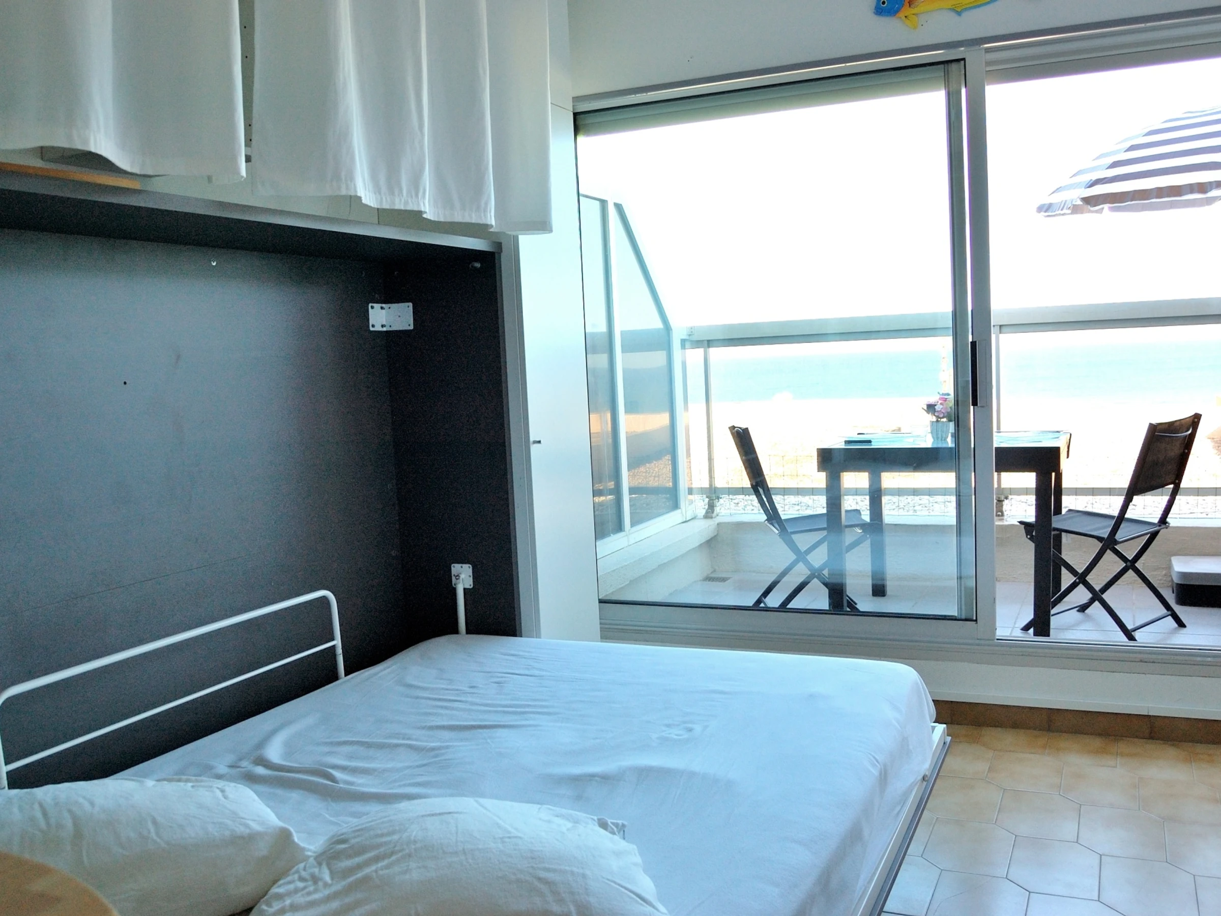 Séjour (lit escamotable 140) sur belle terrasse avec vue face mer imprenable, coin cuisine coquet avec mange debout, salle d'eau et WC indépendant.