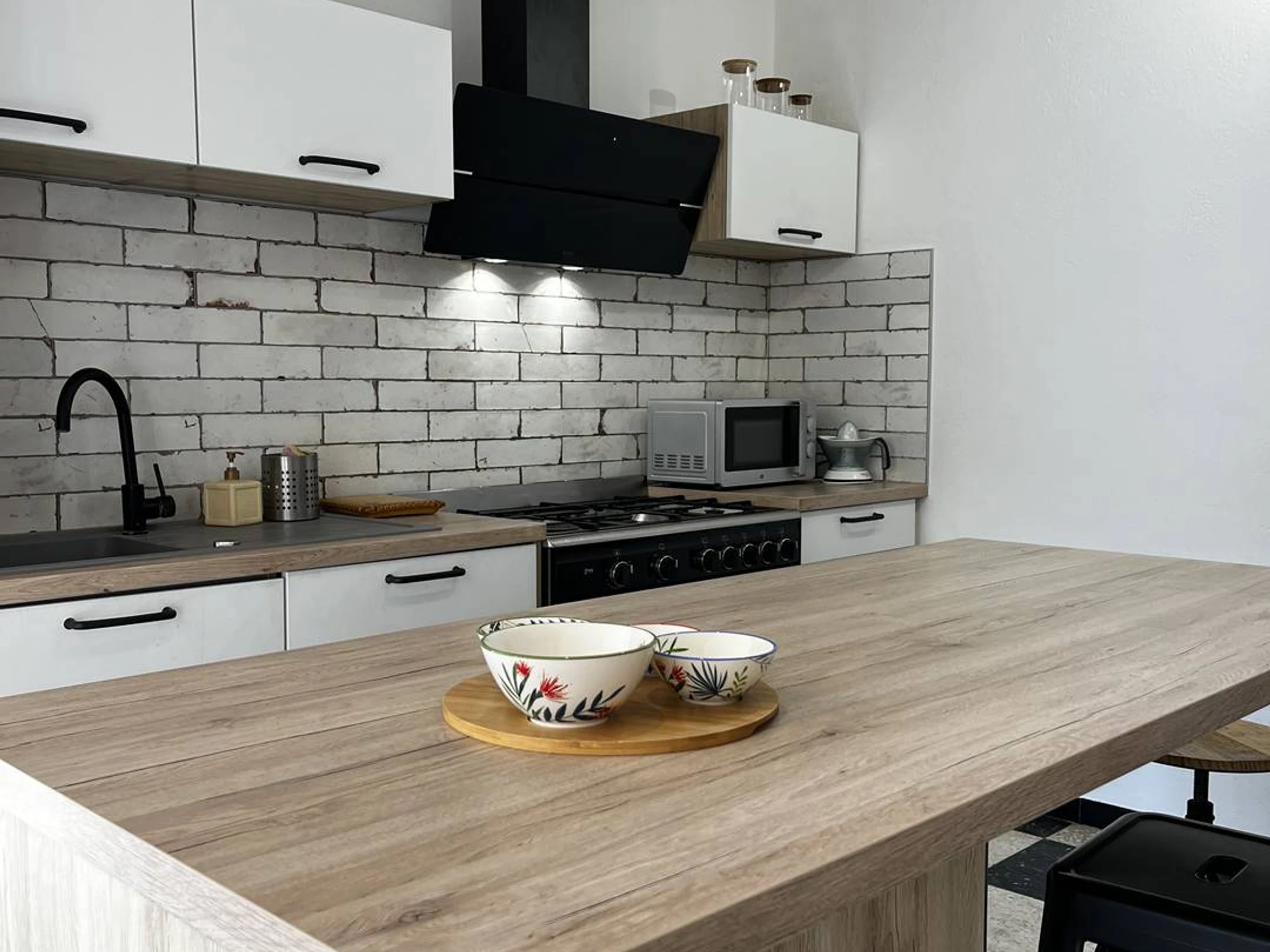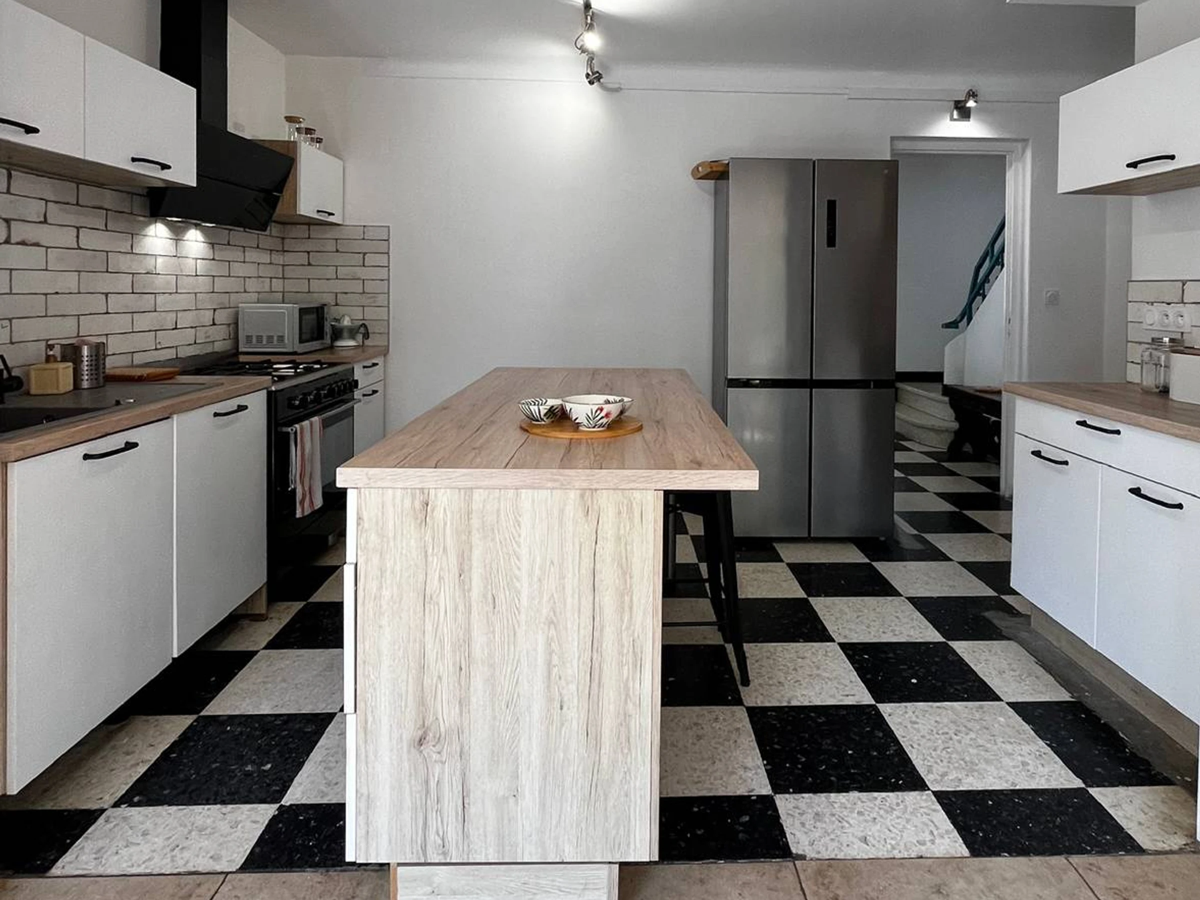 Le rez-de-chaussée se compose d'un grand salon lumineux avec des canapés et une TV, d'une cuisine entièrement équipée, d'une salle à manger conviviale, ainsi que d'une buanderie avec lave-linge et de WC séparés.