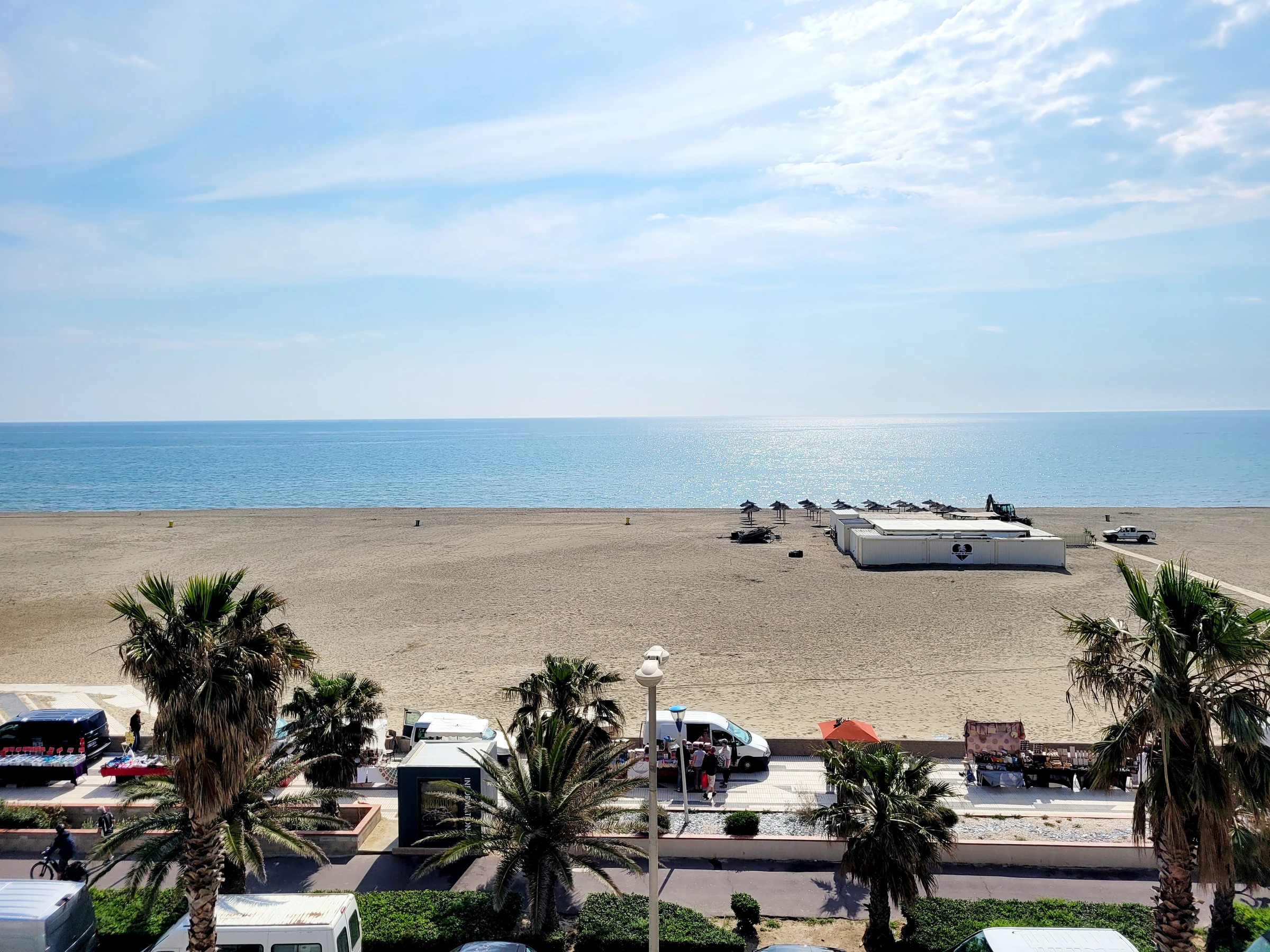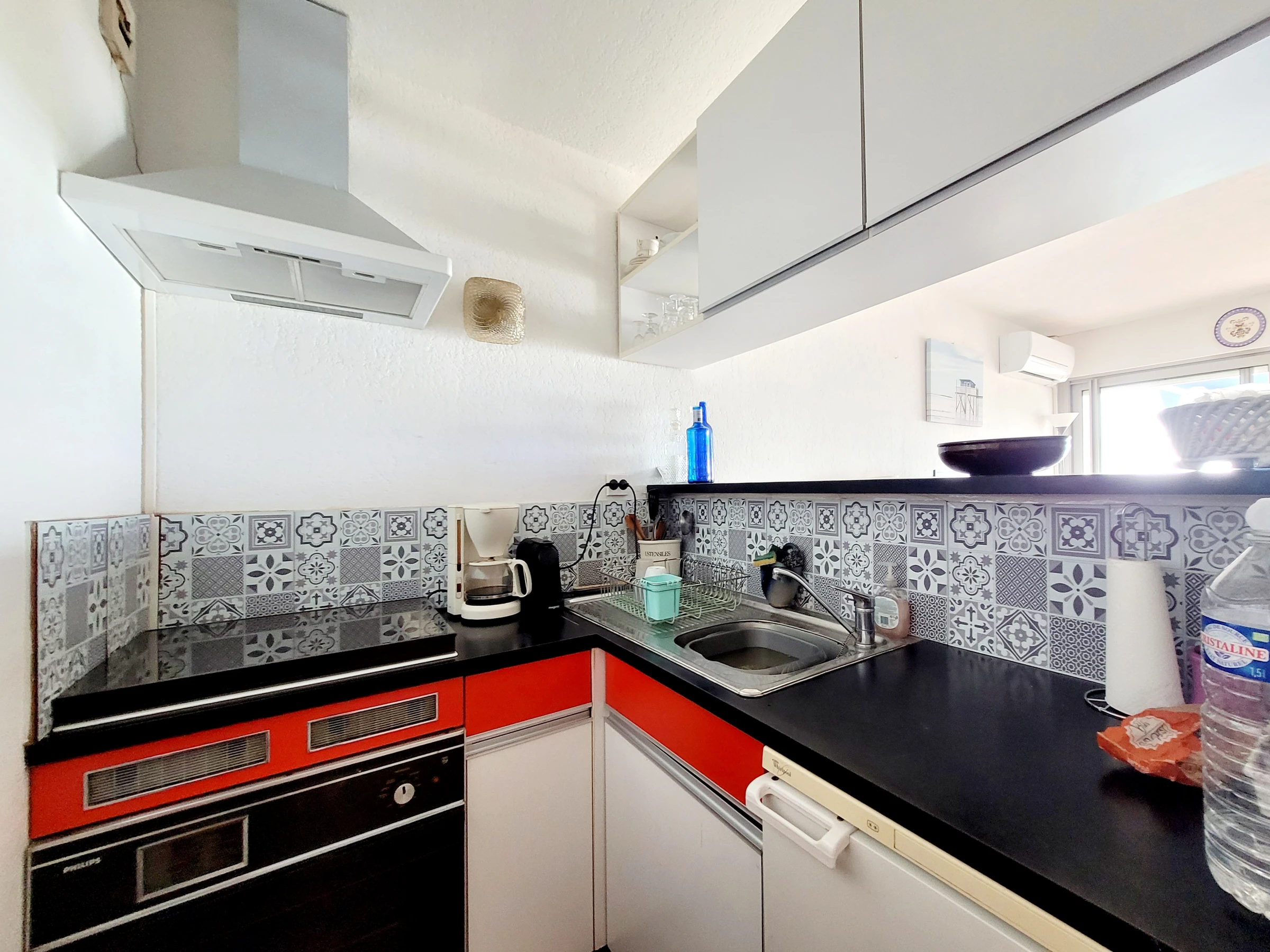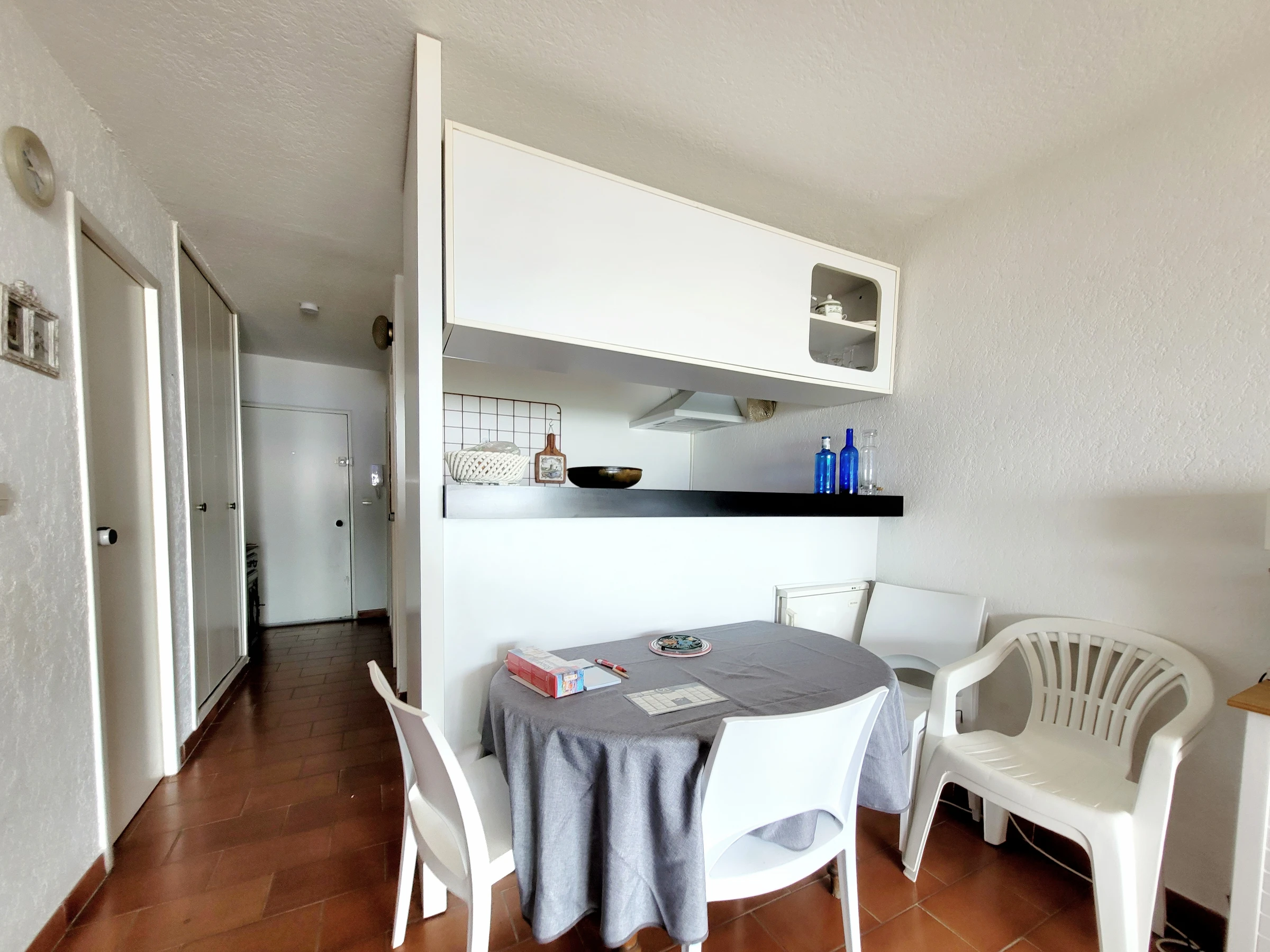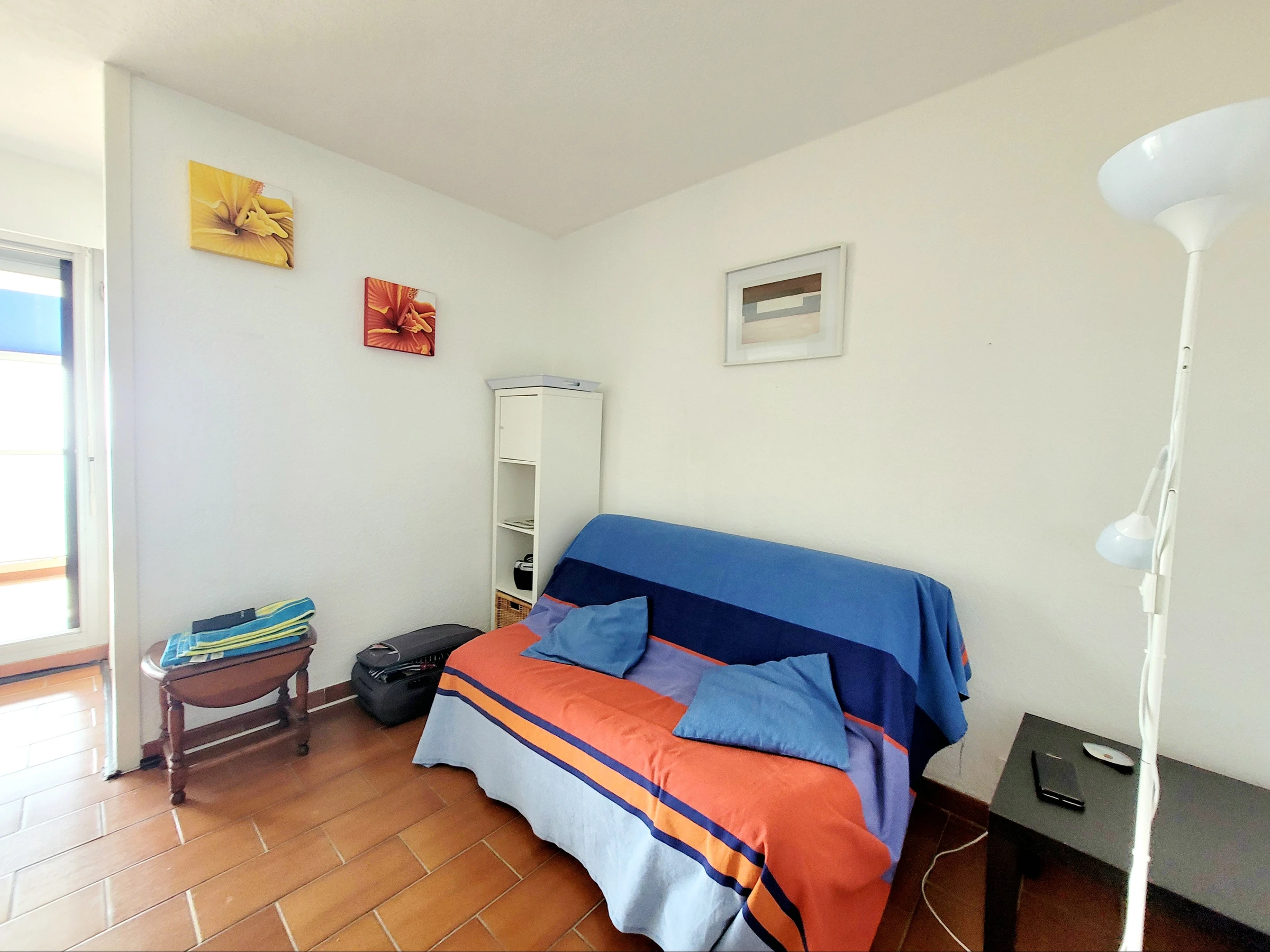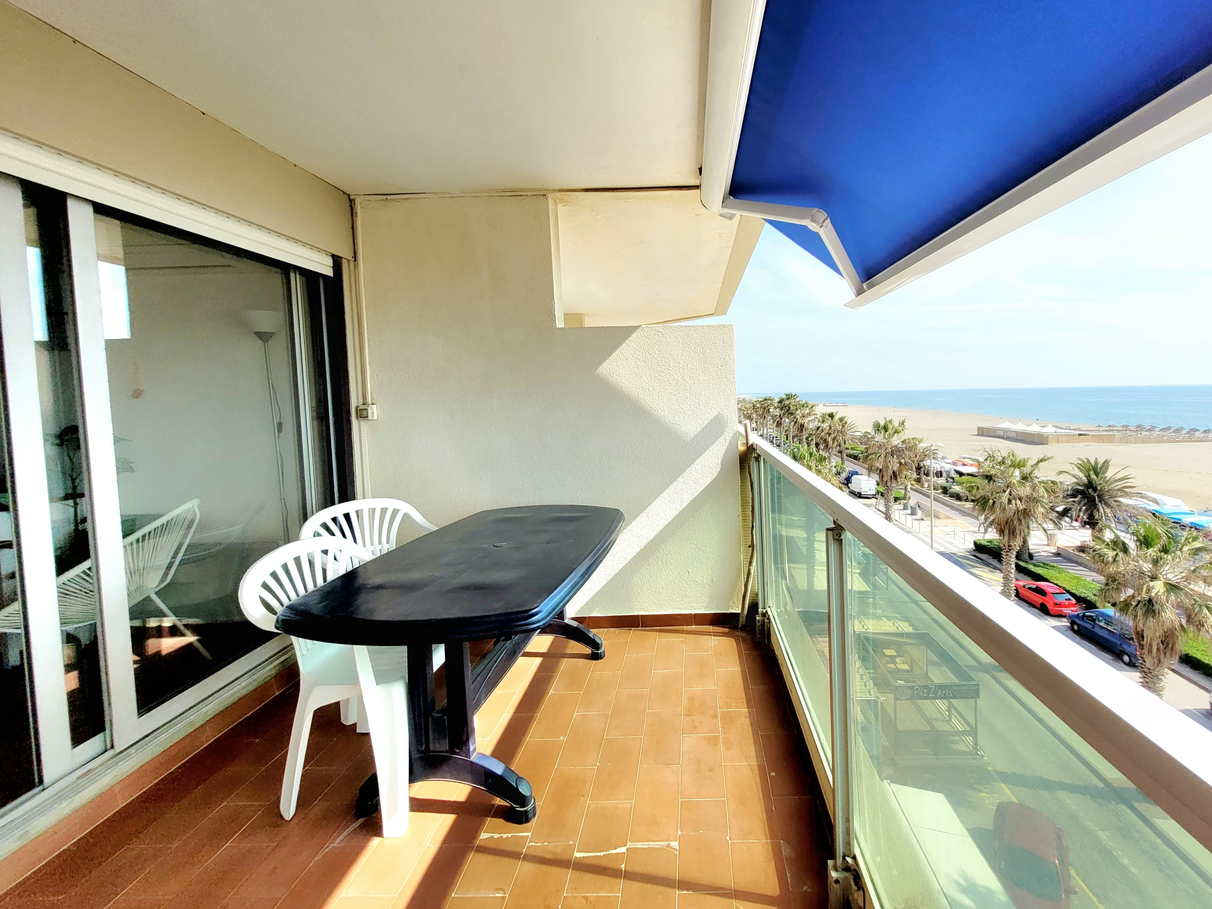 Beau studio cabine de 33 m² au 4ème étage d'une résidence en front de mer, climatisation réversible, face mer, accès direct à la plage et parking privé.