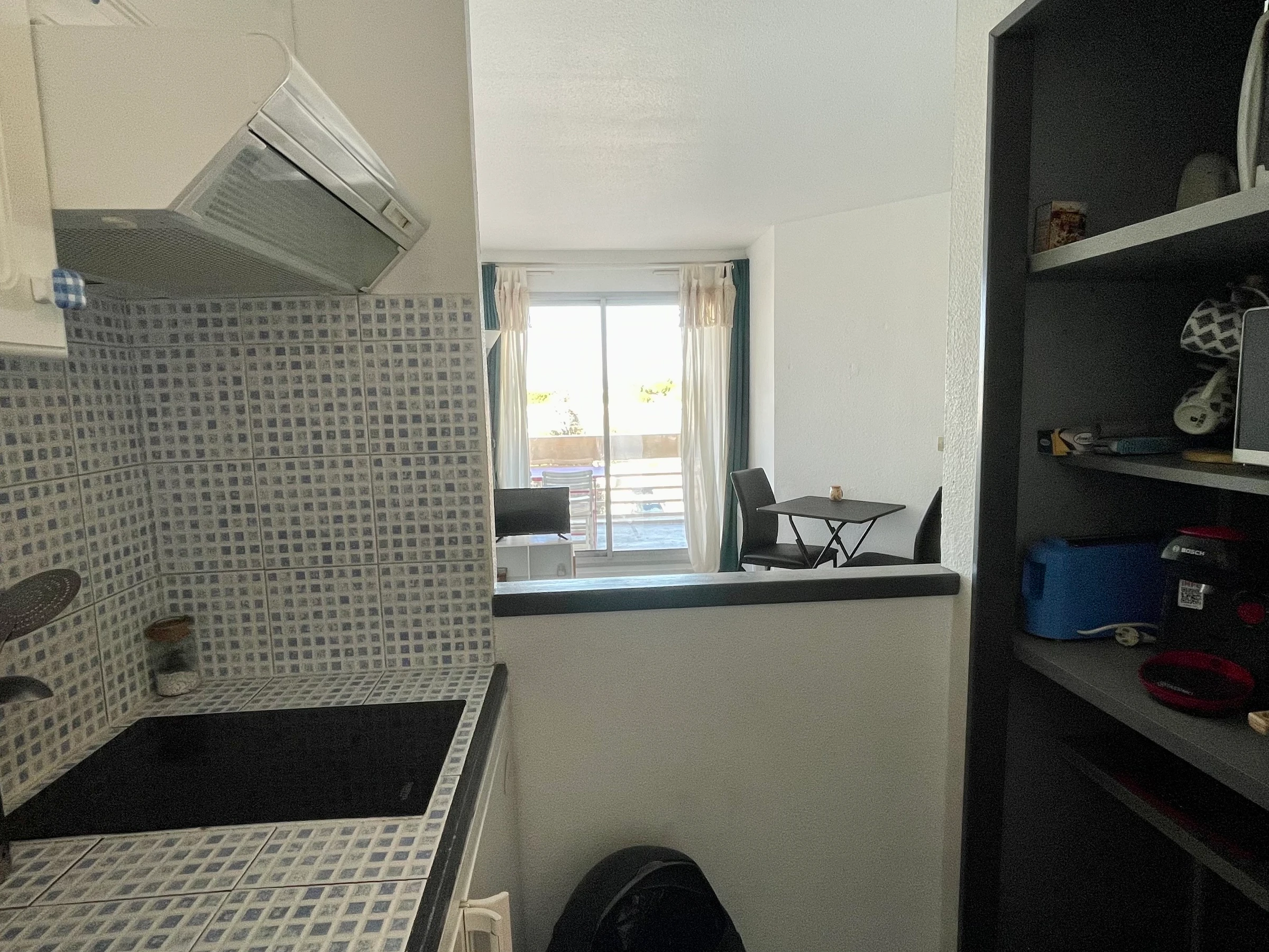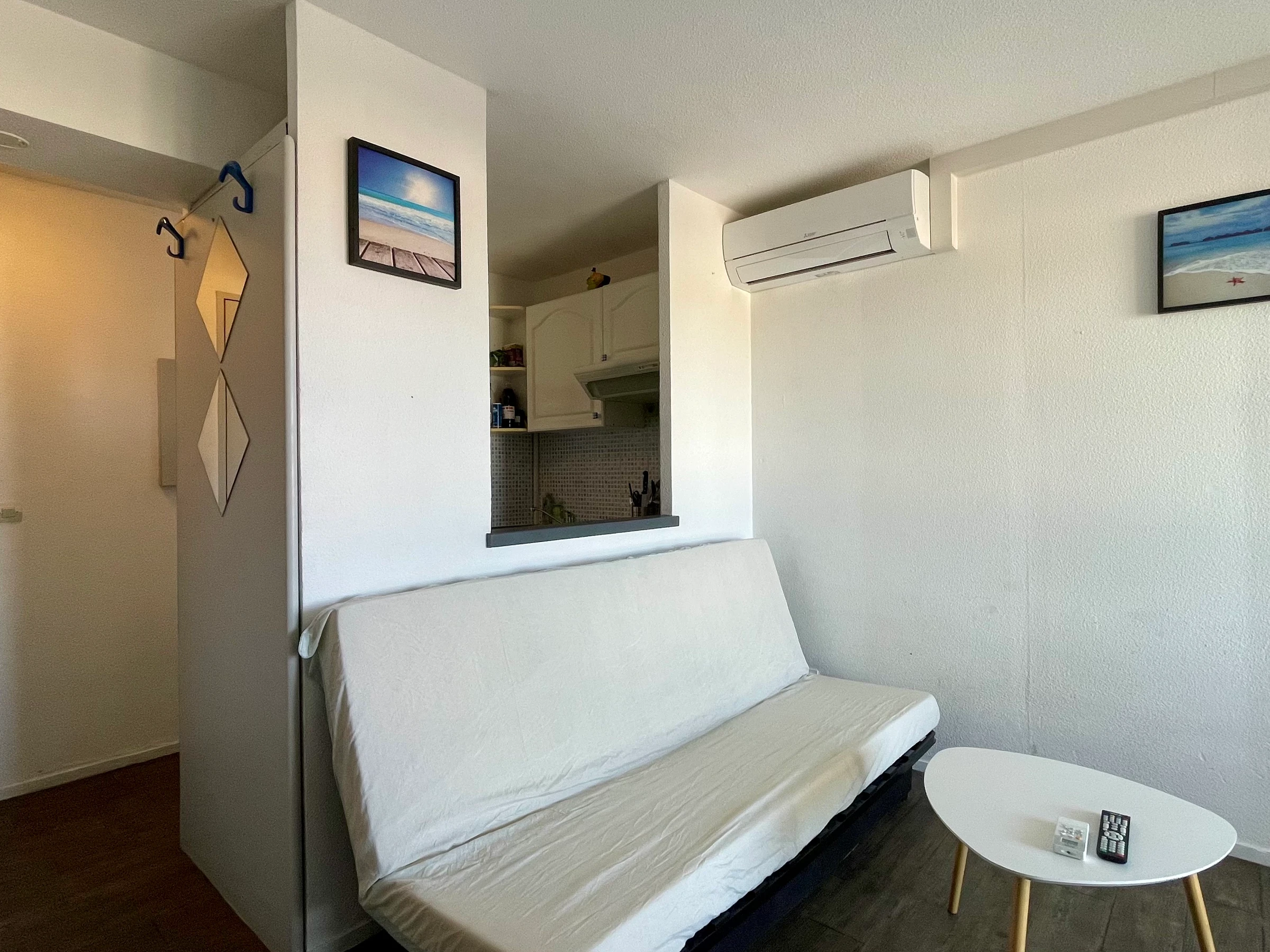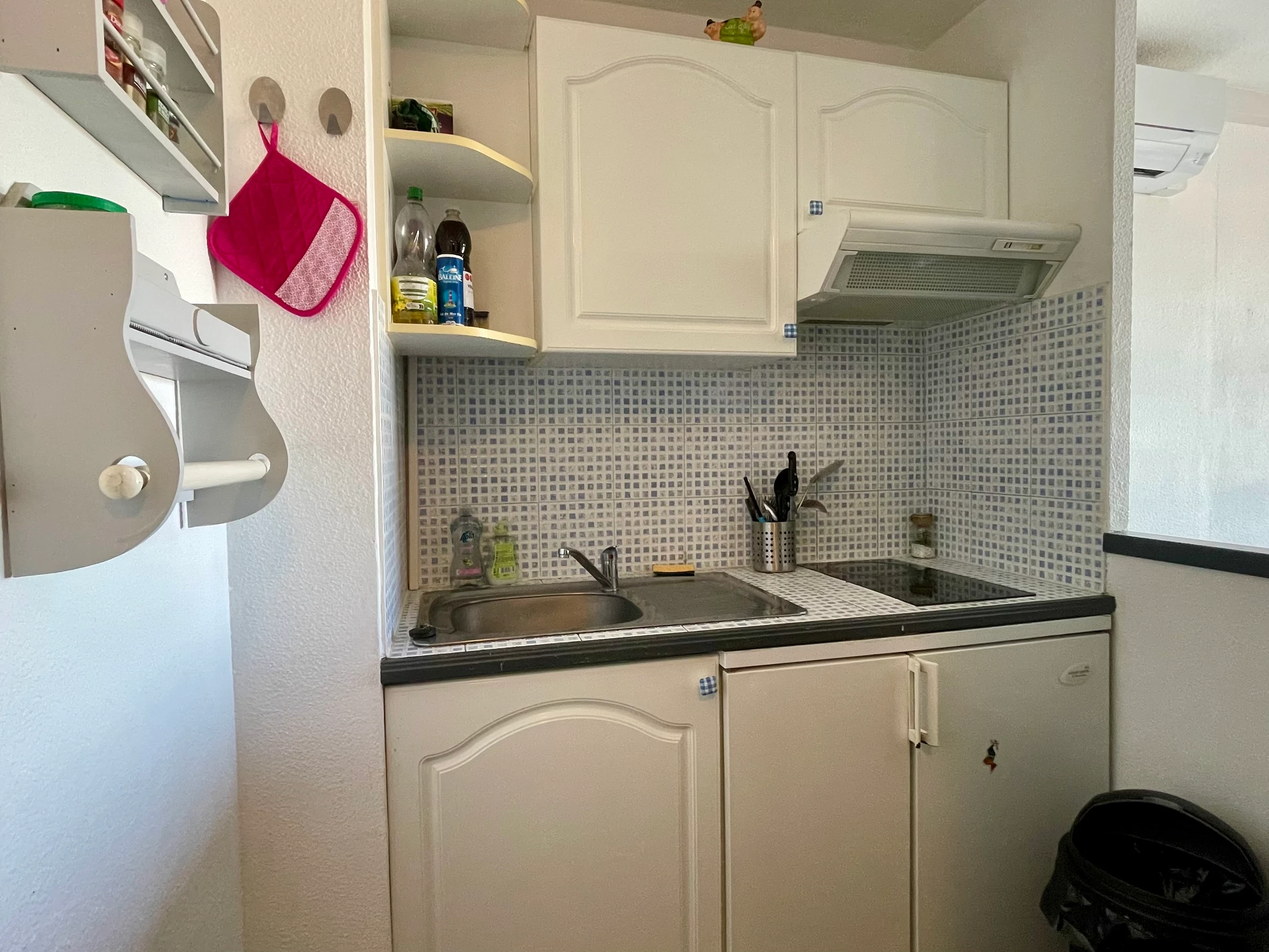 Entrée desservant wc indépendant, cuisine équipée (mini frigo, micro-ondes, cafetière TASSIMO, mini four, mini congélateur), chambre avec étagère (lit 2 personnes 140x190cm), séjour climatisé avec clic-clac, salle de bains avec lave-linge et baignoire, terrasse avec belle vue dégagée sur le Canigou et vue latérale mer.