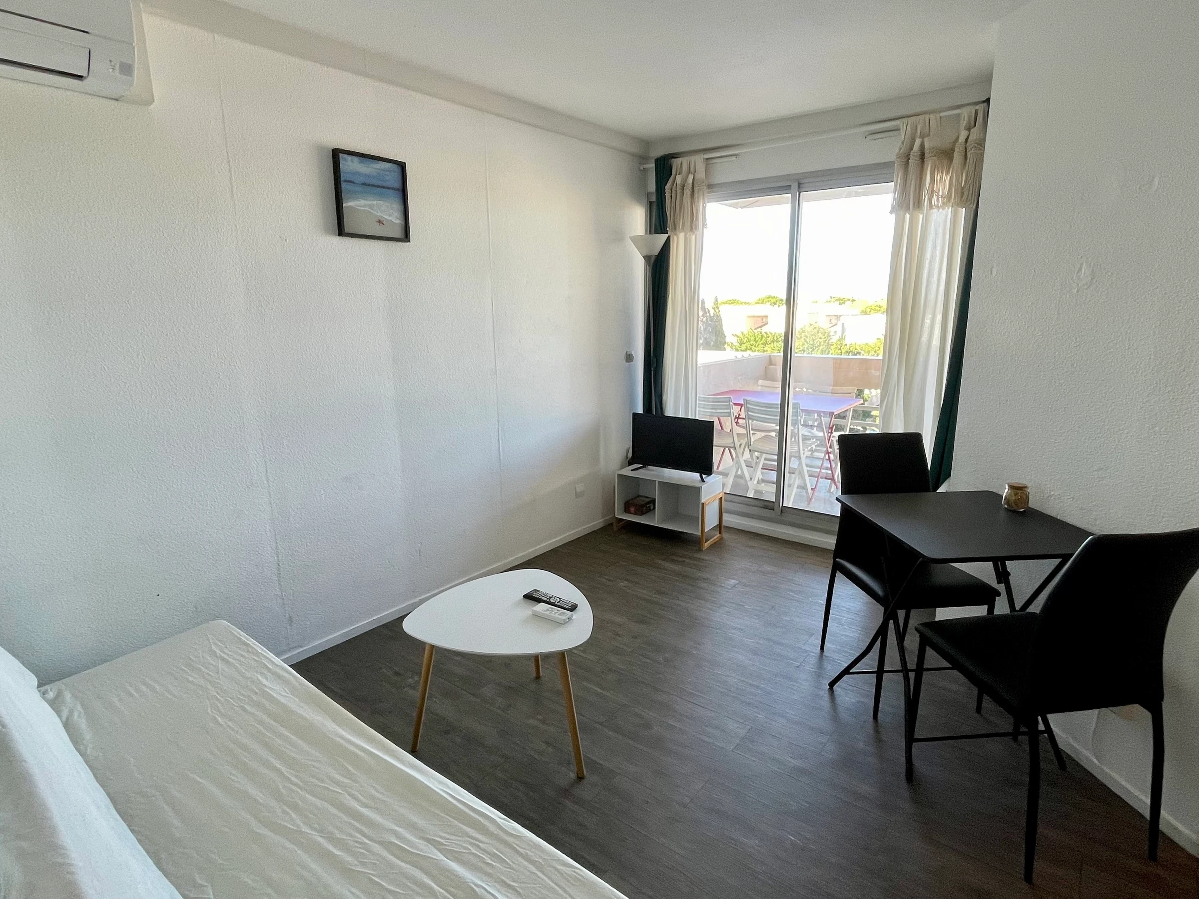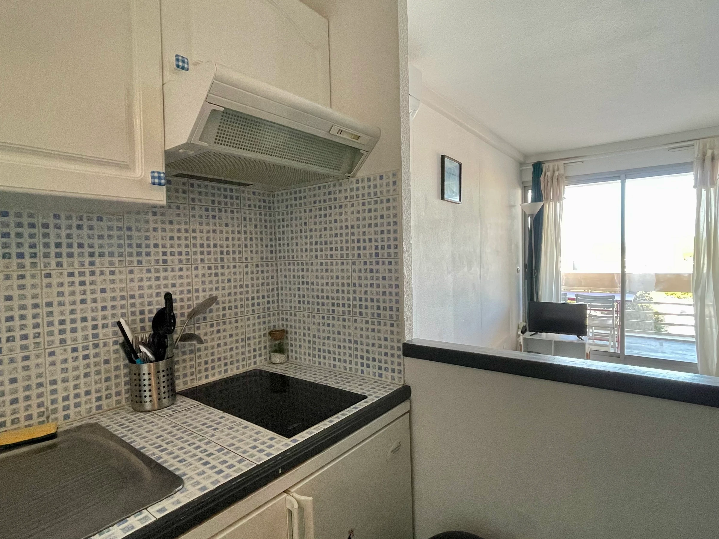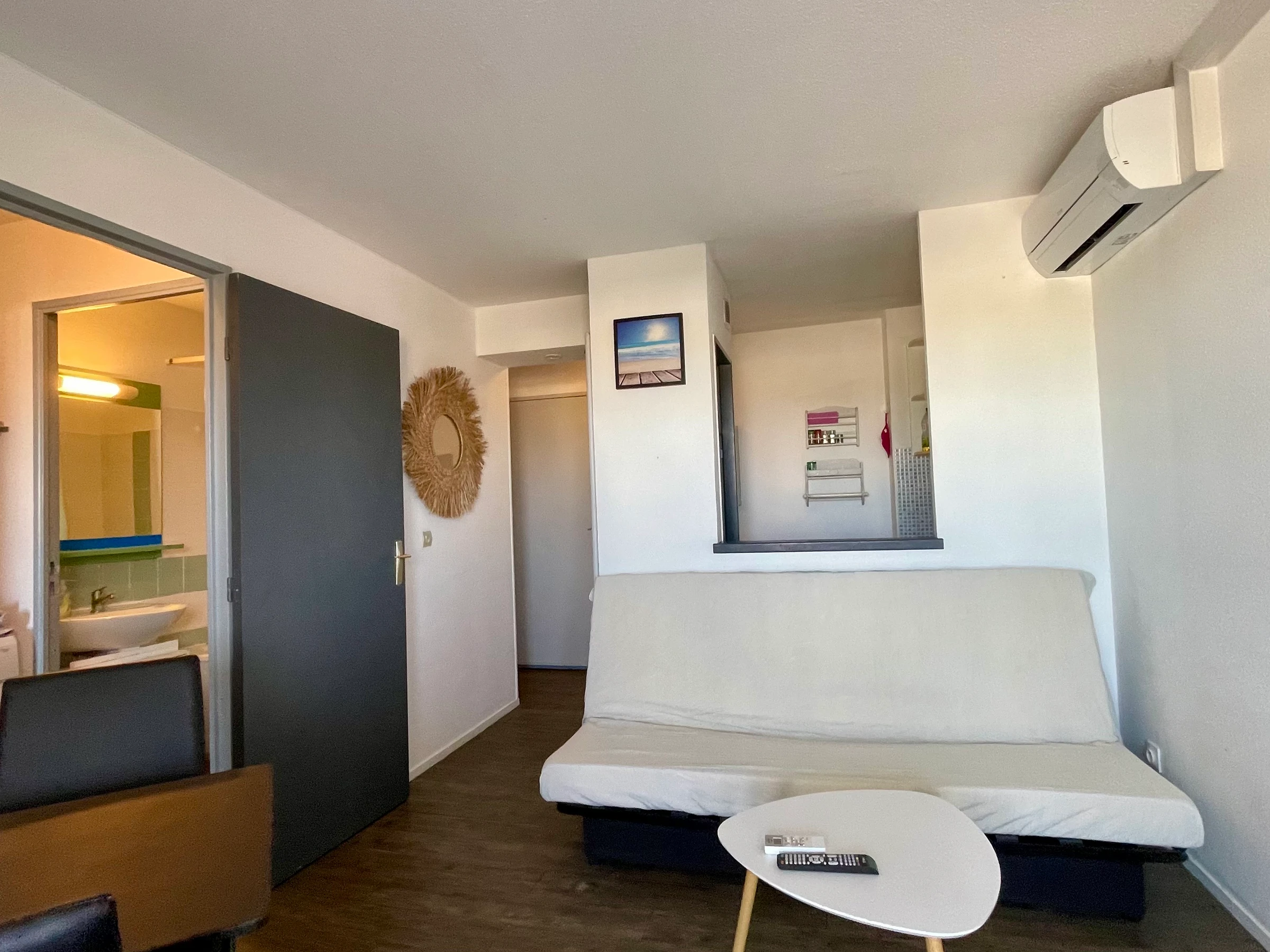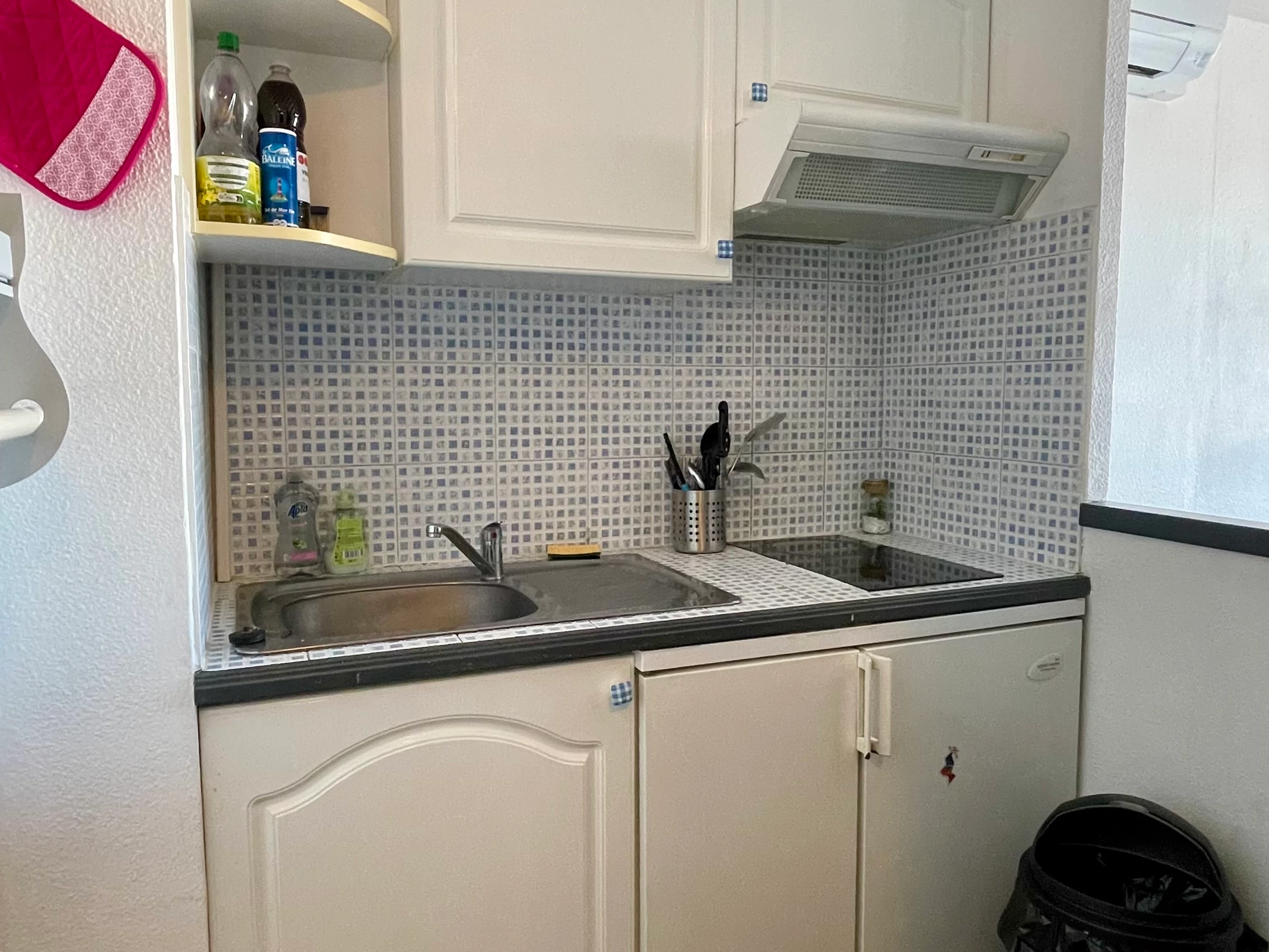 Entrée desservant wc indépendant, cuisine équipée (mini frigo, micro-ondes, cafetière TASSIMO, mini four, mini congélateur), chambre avec étagère (lit 2 personnes 140x190cm), séjour climatisé avec clic-clac, salle de bains avec lave-linge et baignoire, terrasse avec belle vue dégagée sur le Canigou et vue latérale mer.